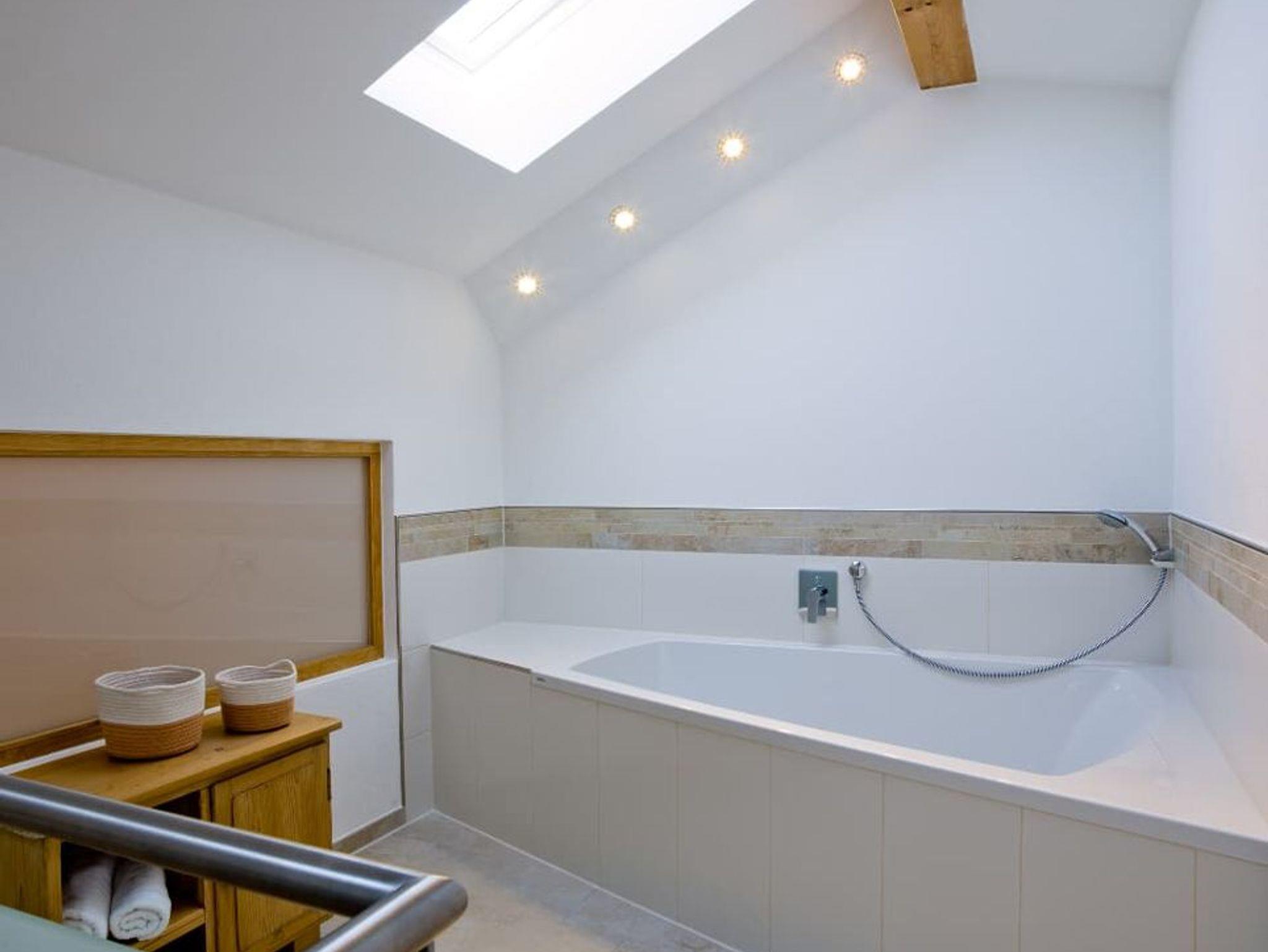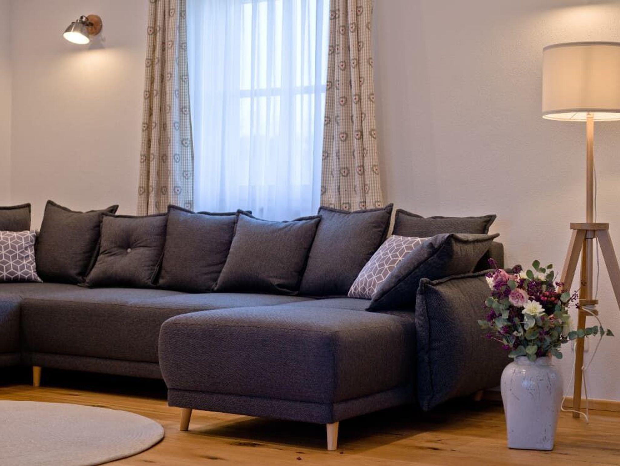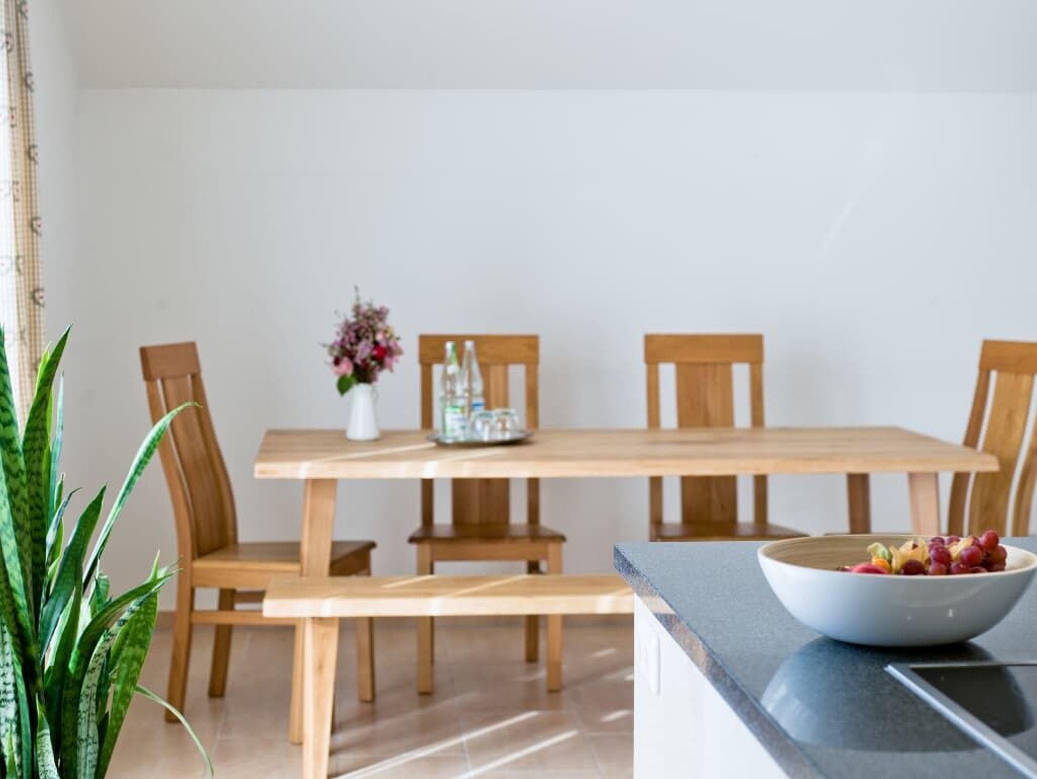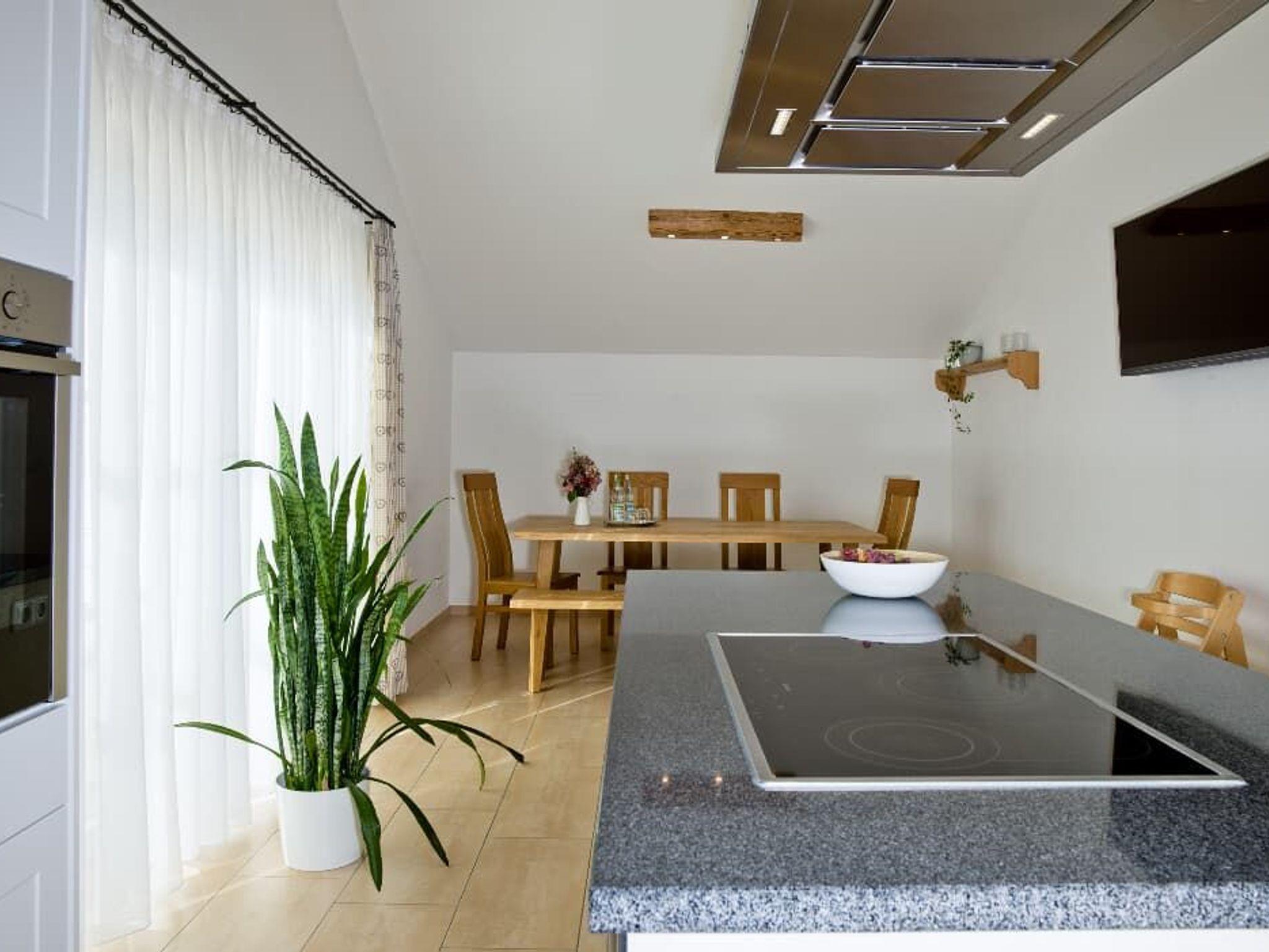 Ihre Ferienwohnung befindet sich im Nebengebäude im 1. Stock. Die Wohnung verfügt über zwei separat begehbare Schlafräume, ein Badezimmer mit Dusche/WC, Badewanne auf einer Empore und einem separatem WC. Die Wohnung hat ein großes Wohnzimmer (ca. 50m²) und eine große Küche und Balkon. Die Küche ist mit einer Spülmaschine, einer Kochinsel mit Ceranfeld, Backofen und einem Kühlschrank mit Gefrierfach ausgestattet. Küchenkleingeräte sind ebenfalls vorhanden. Alle Betten sind mit Bettwäsche bezogen. Große und kleine Handtücher sind im Bad vorhanden.