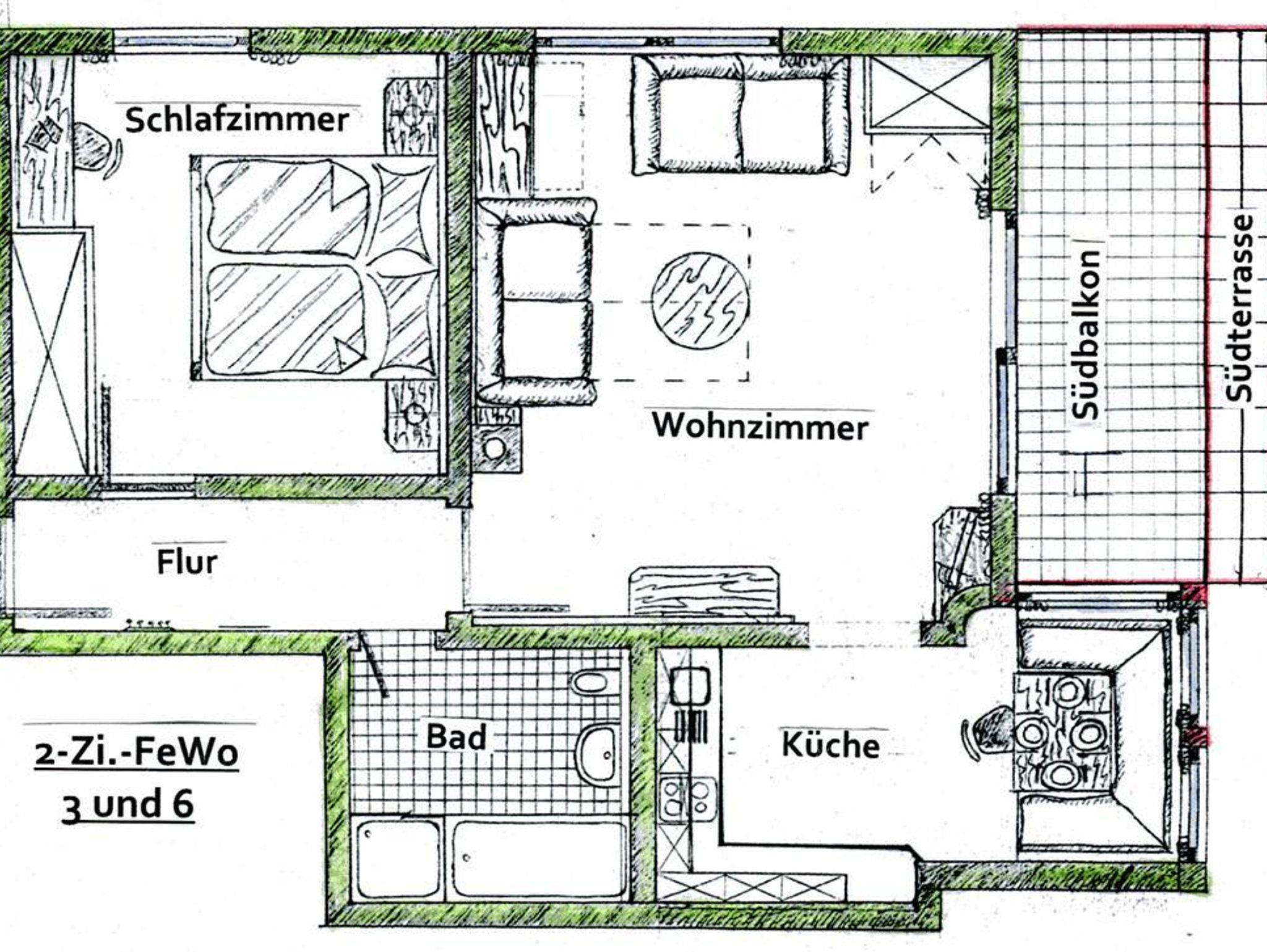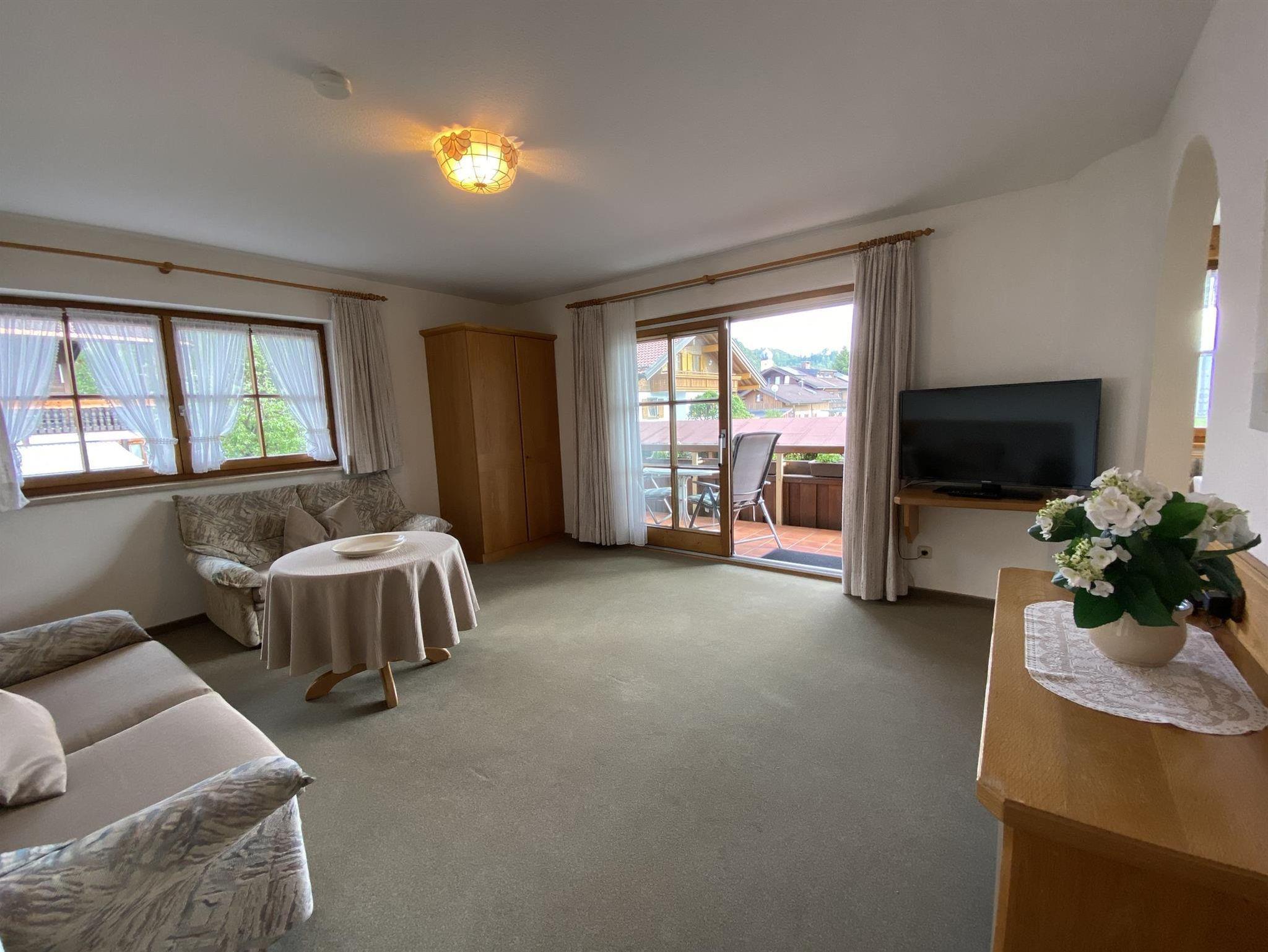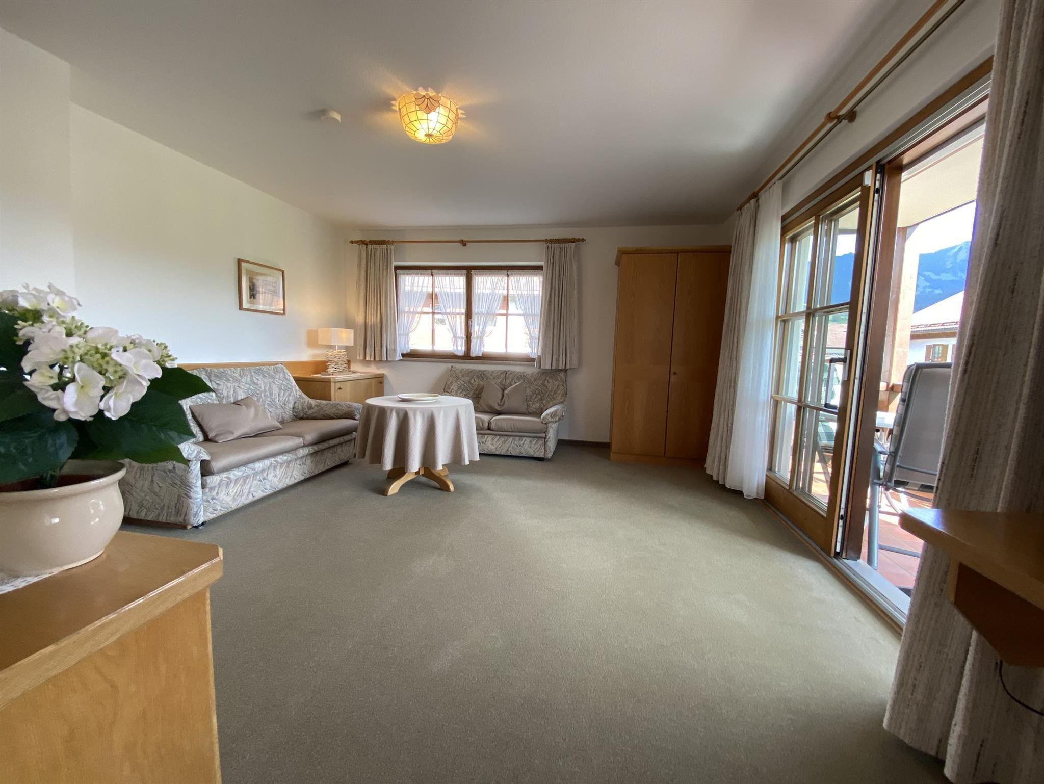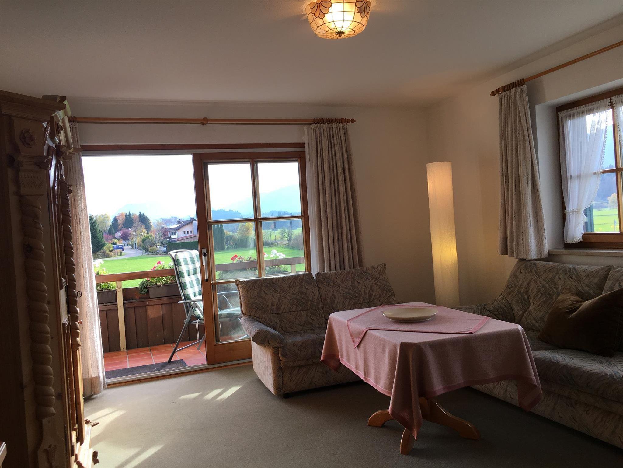 Mit traumhafter Bergsicht und urgemütlichem Südbalkon ist die schöne Wohnung, sie verfügt über ein großes Wohnzimmer mit breiter Schiebetüre zum Balkon, die Polstermöbel im Sitzbereich bestehen aus 2er Sofa und 3er-Sofa (Ausziehsofa), Tisch, Schrank und Fachbild-TV, daneben ist die Küche mit Einbauküche (Spülmaschine) und gemütlichem Erkeressbereich, das Schlafzimmer hat Doppelbetten, Kleiderschrank und Schreibtisch, im weissen Bad ist Wanne, Dusche, Waschbecken und WC, Flur mit Garderobe. In der Wohnung ist angenehme Fußbodenheizung. Die FeWo-Nr. 3 im EG ist gleich.