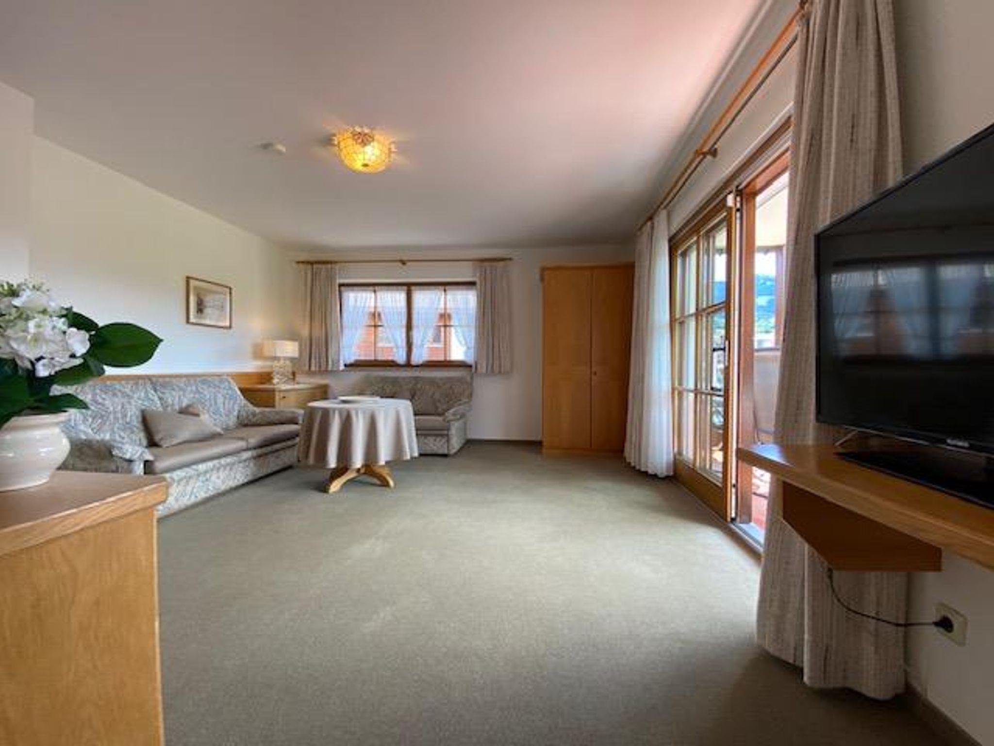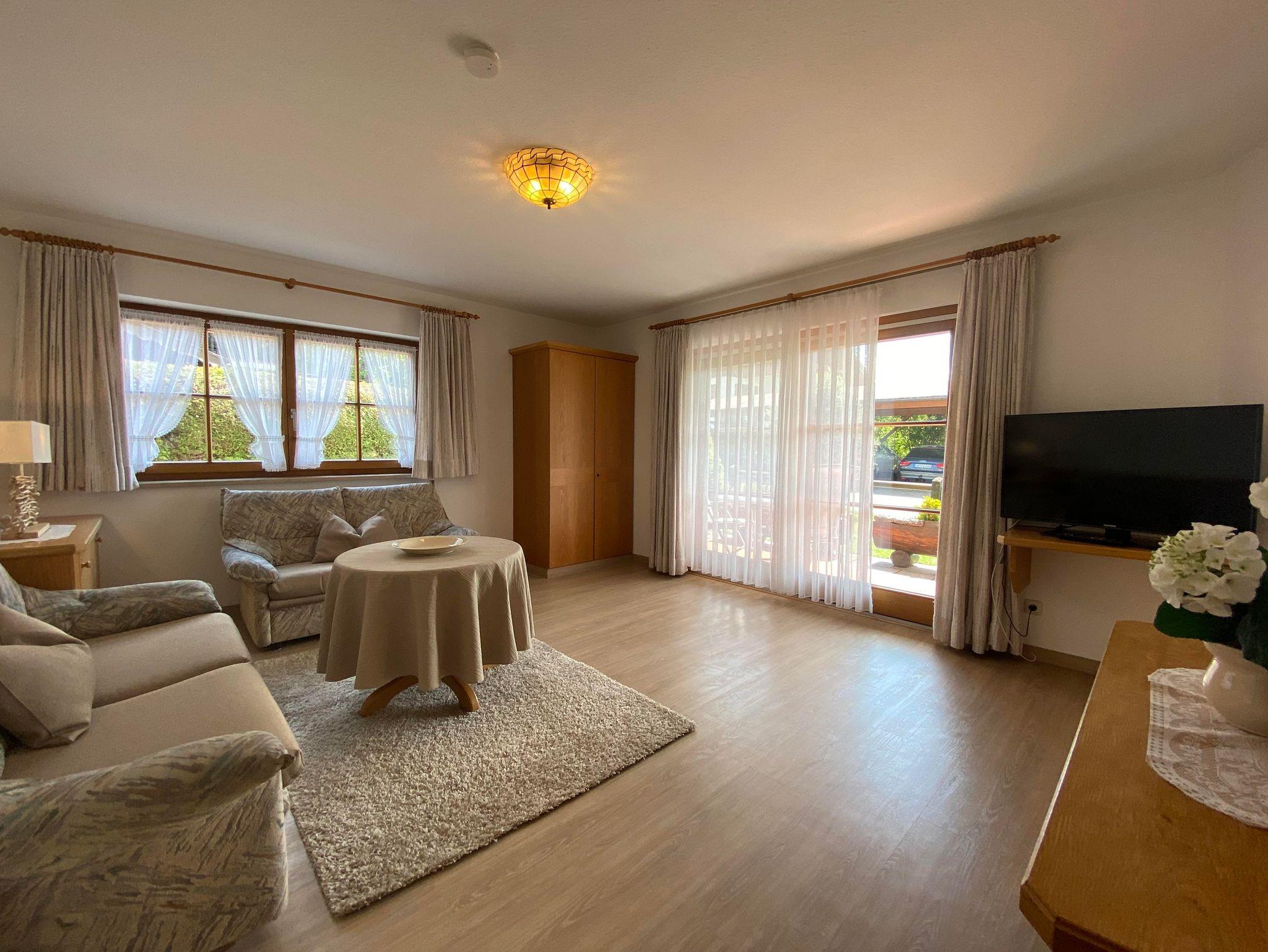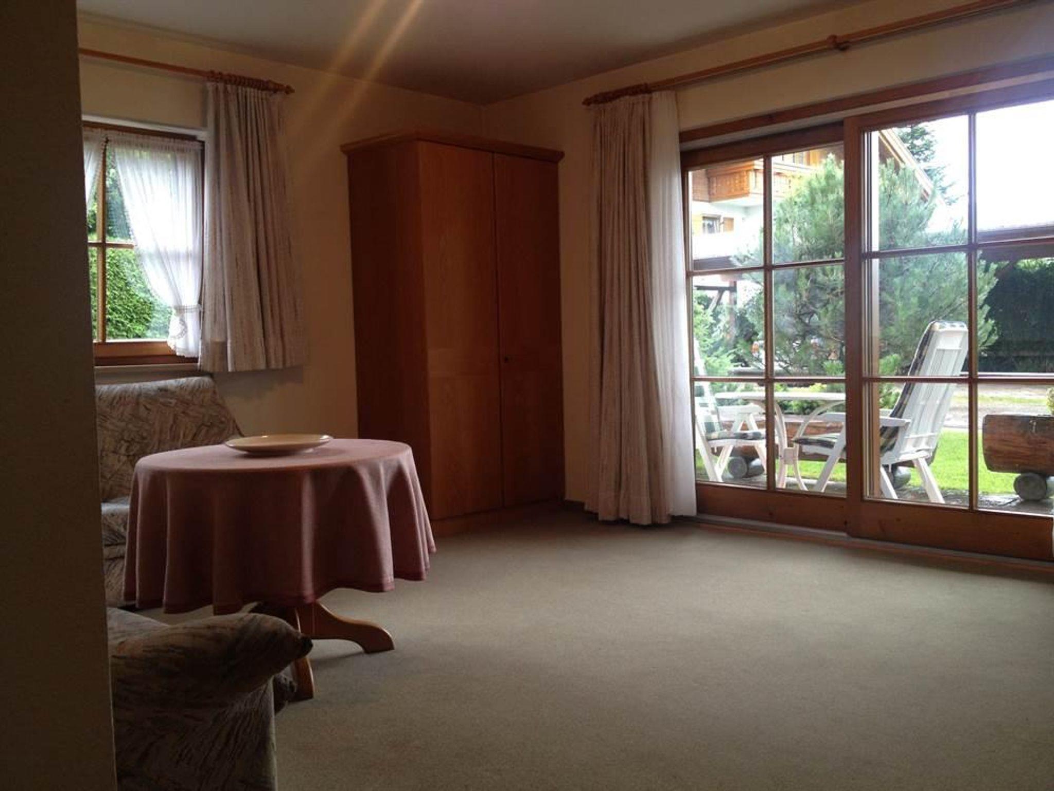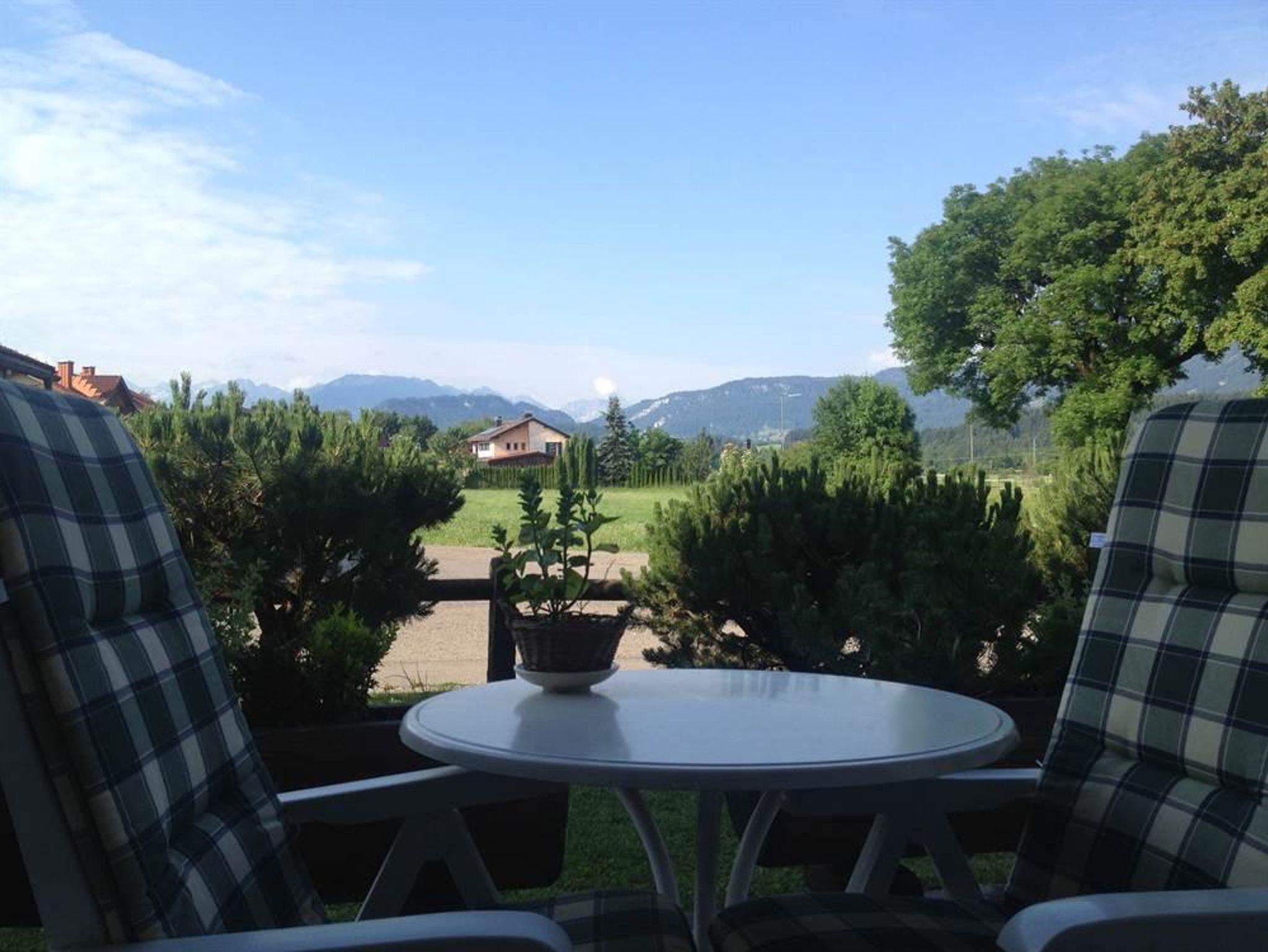 Mit traumhafter Bergsicht und urgemütlichem Südbalkon ist die schöne Wohnung, sie verfügt über ein großes Wohnzimmer mit breiter Schiebetüre zum Balkon, die Polstermöbel im Sitzbereich bestehen aus 2er Sofa und 3er-Sofa (Ausziehsofa), Tisch, Schrank und Fachbild-TV, daneben ist die Küche mit Einbauküche (Spülmaschine) und gemütlichem Erkeressbereich, das Schlafzimmer hat Doppelbetten, Kleiderschrank und Schreibtisch, im weissen Bad ist Wanne, Dusche, Waschbecken und WC, Flur mit Garderobe. In der Wohnung ist angenehme Fußbodenheizung. Die FeWo-Nr. 3 im EG ist gleich.