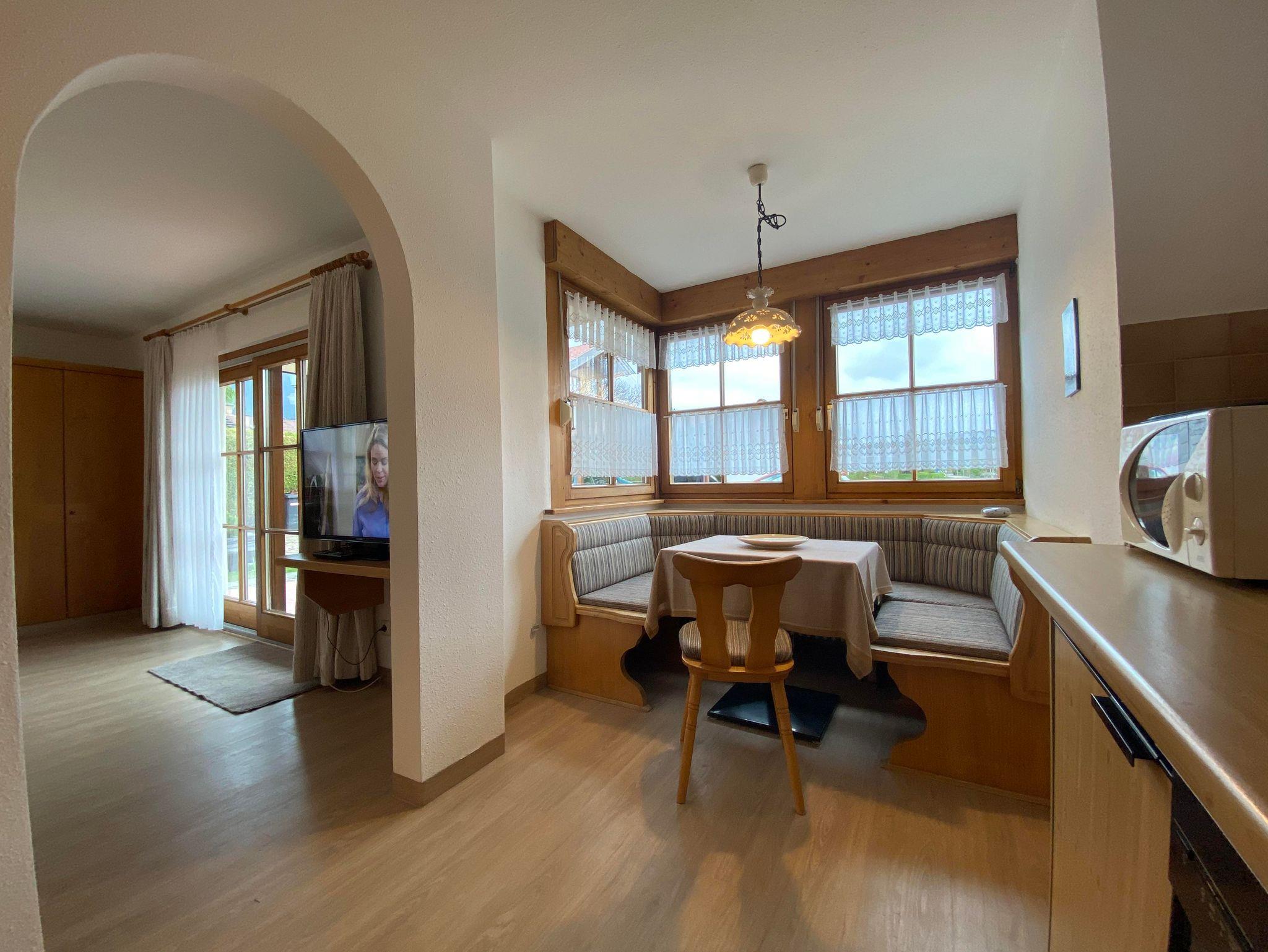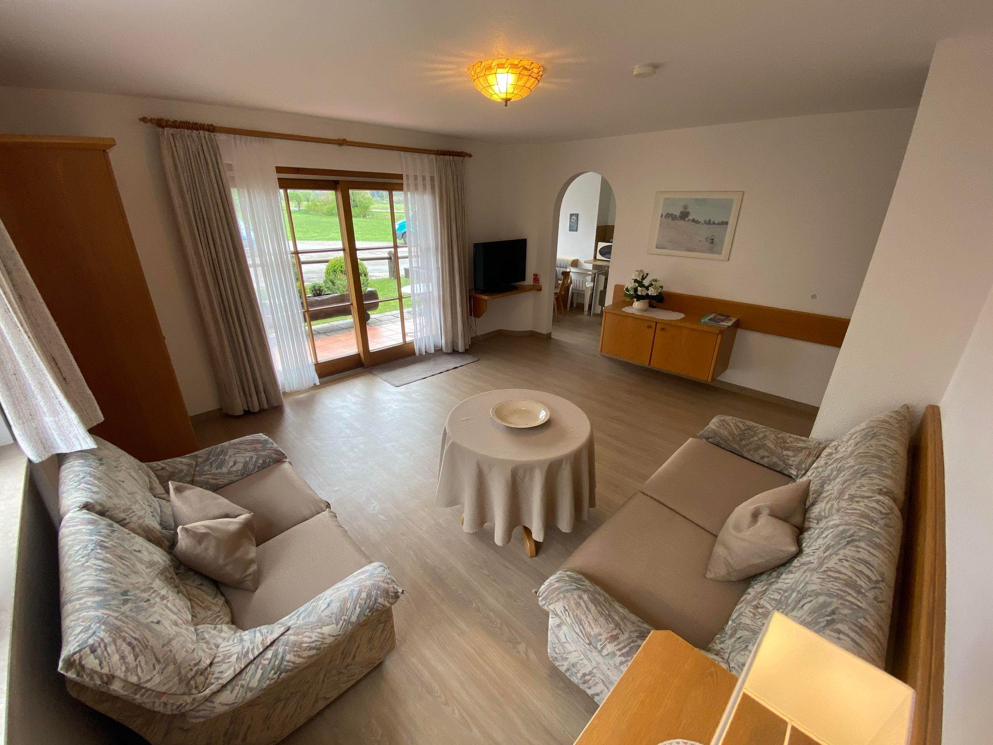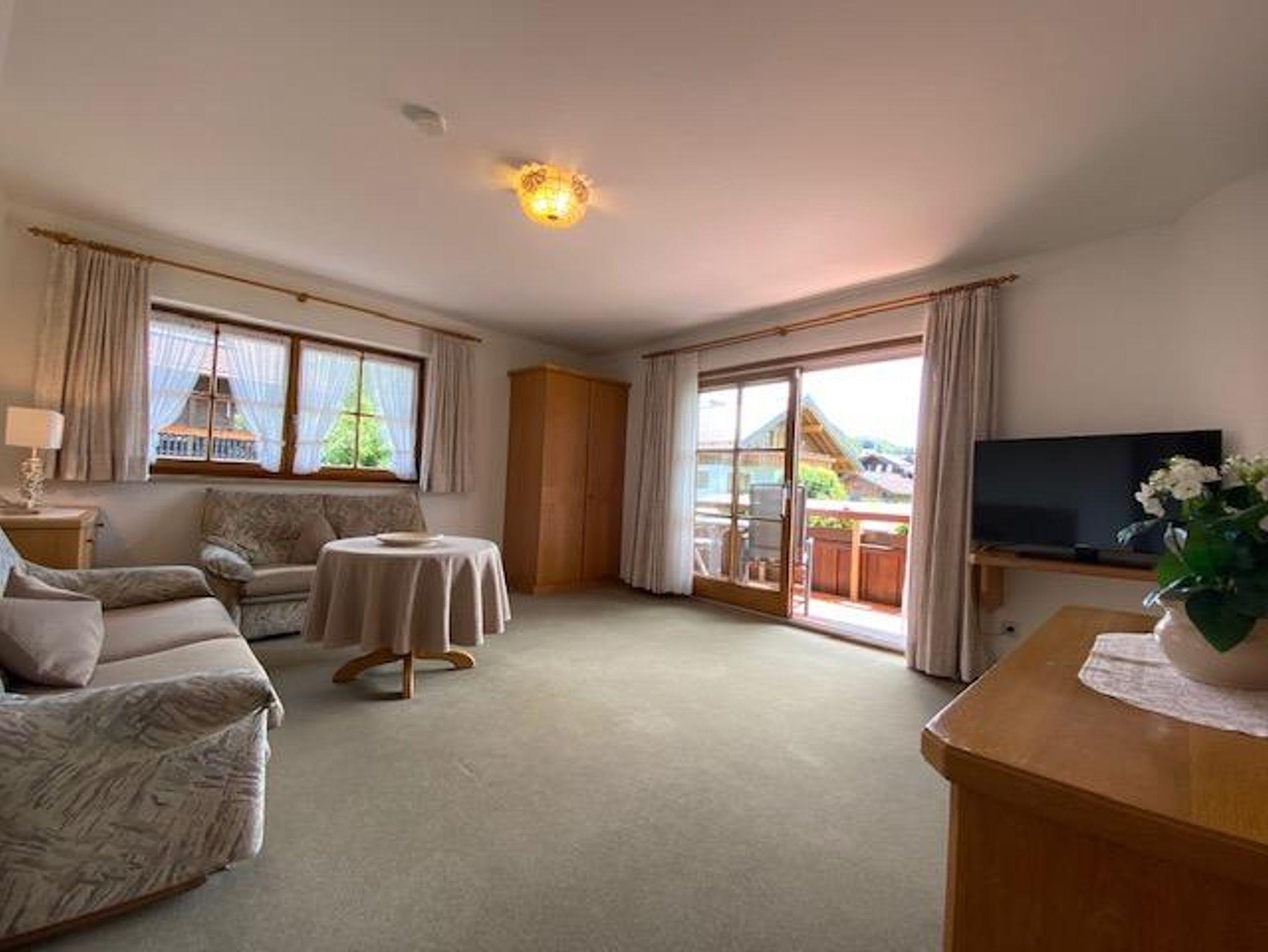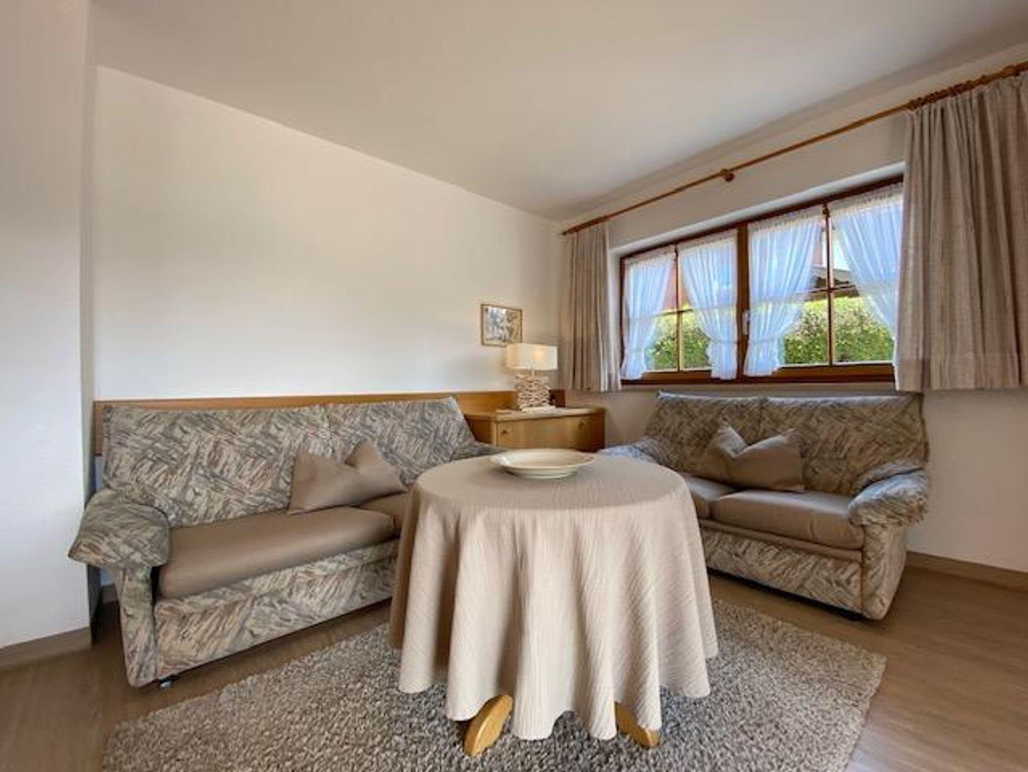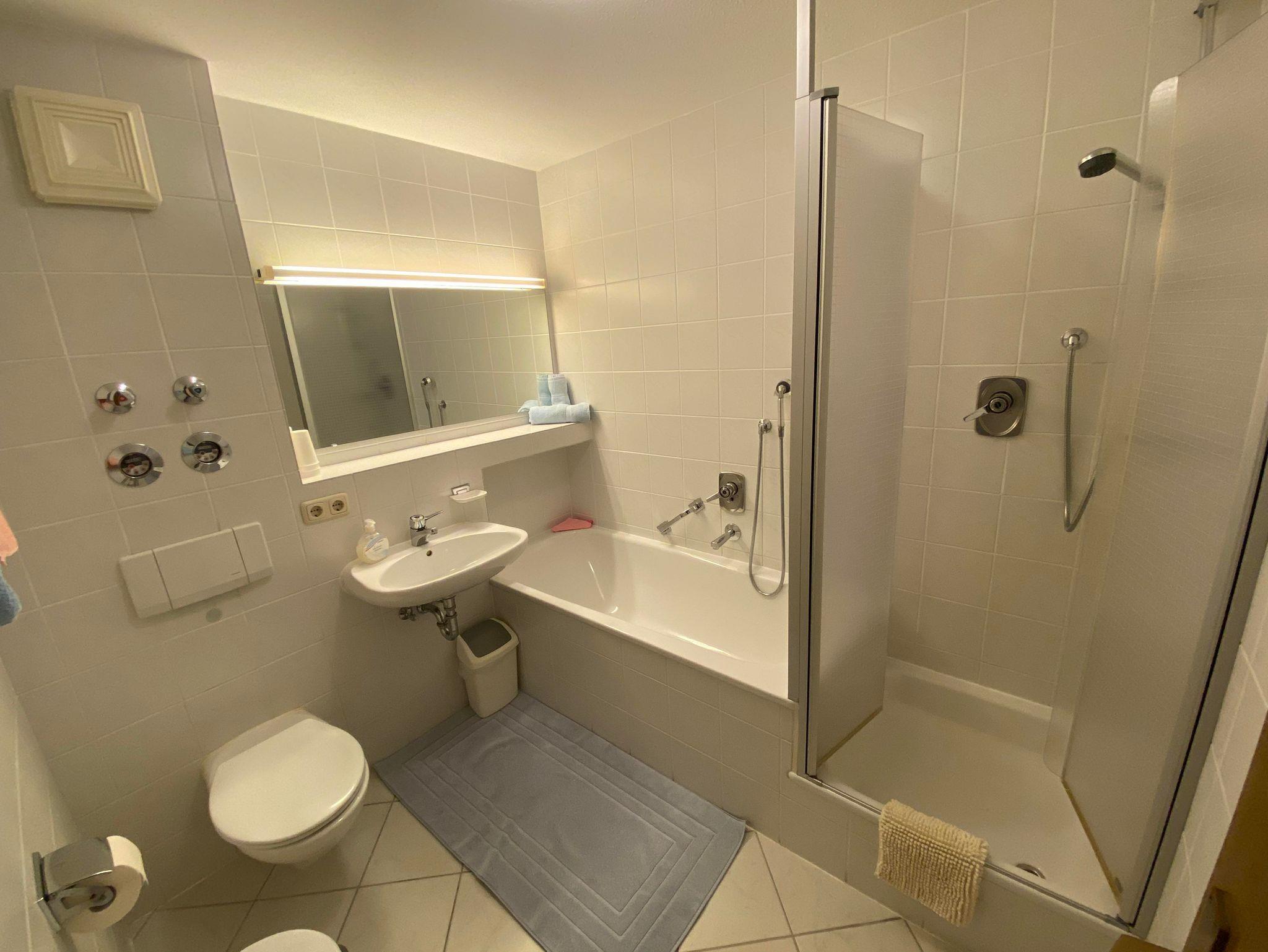 Mit traumhafter Bergsicht und urgemütlichem Südbalkon ist die schöne Wohnung, sie verfügt über ein großes Wohnzimmer mit breiter Schiebetüre zum Balkon, die Polstermöbel im Sitzbereich bestehen aus 2er Sofa und 3er-Sofa (Ausziehsofa), Tisch, Schrank und Fachbild-TV, daneben ist die Küche mit Einbauküche (Spülmaschine) und gemütlichem Erkeressbereich, das Schlafzimmer hat Doppelbetten, Kleiderschrank und Schreibtisch, im weissen Bad ist Wanne, Dusche, Waschbecken und WC, Flur mit Garderobe. In der Wohnung ist angenehme Fußbodenheizung. Die FeWo-Nr. 3 im EG ist gleich.