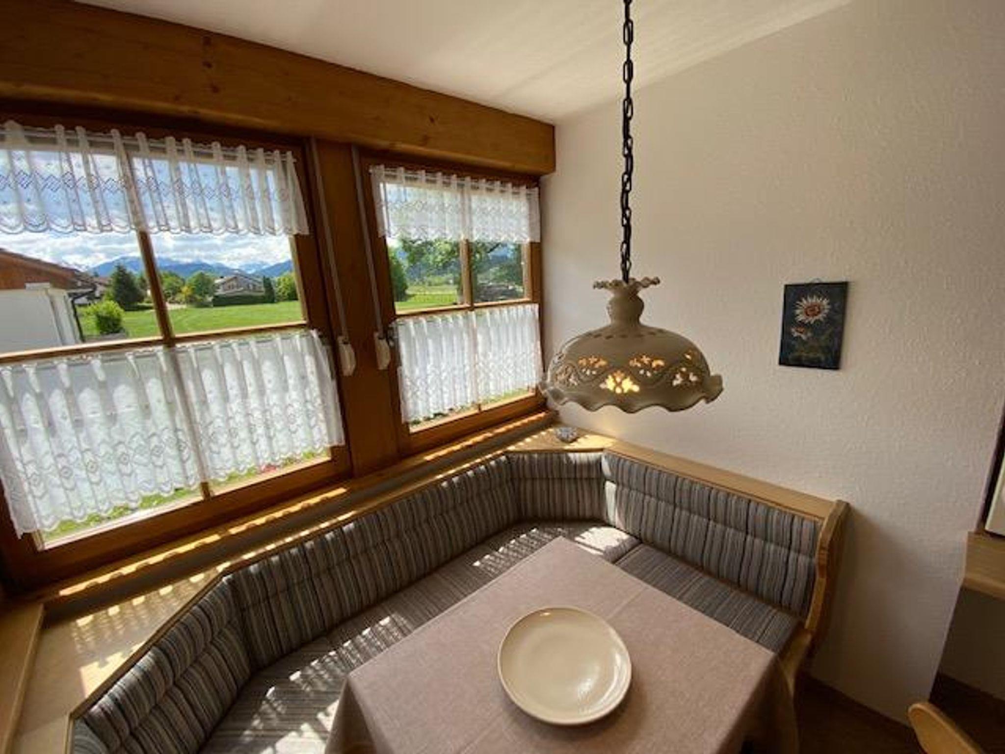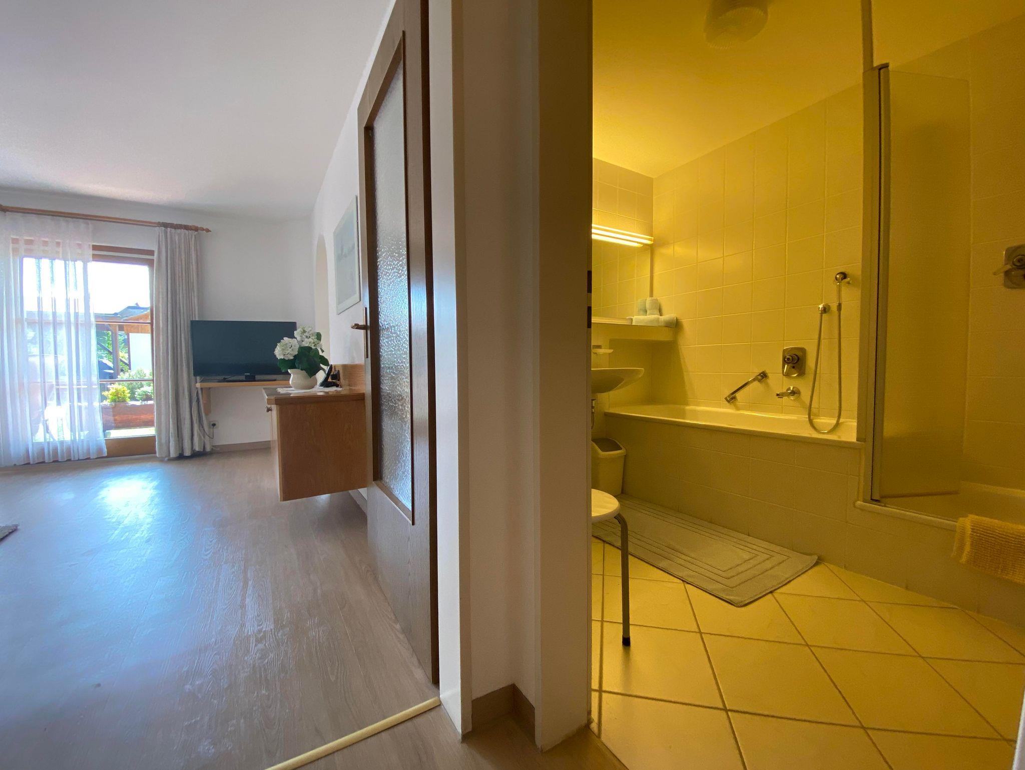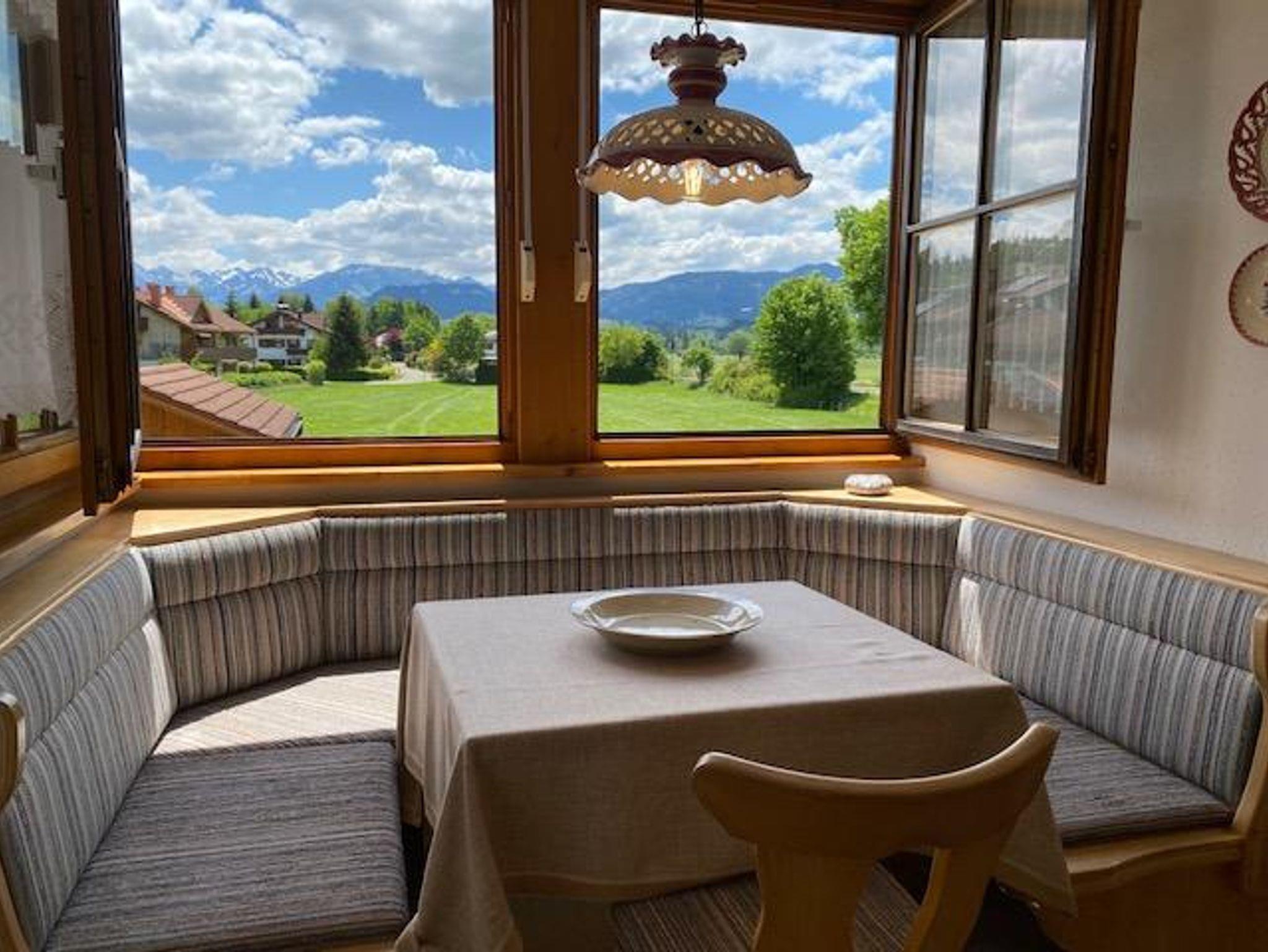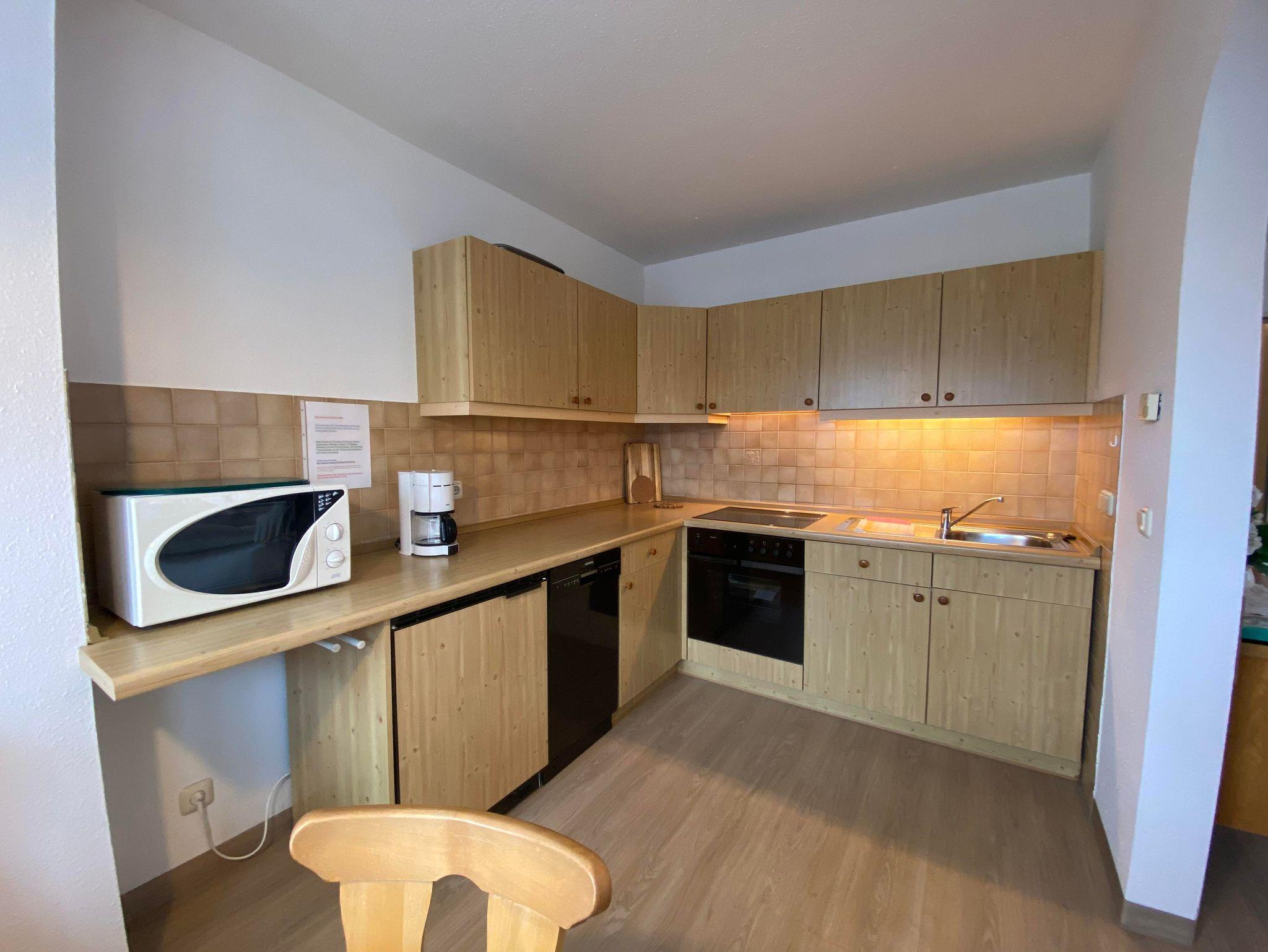 Mit traumhafter Bergsicht und urgemütlichem Südbalkon ist die schöne Wohnung, sie verfügt über ein großes Wohnzimmer mit breiter Schiebetüre zum Balkon, die Polstermöbel im Sitzbereich bestehen aus 2er Sofa und 3er-Sofa (Ausziehsofa), Tisch, Schrank und Fachbild-TV, daneben ist die Küche mit Einbauküche (Spülmaschine) und gemütlichem Erkeressbereich, das Schlafzimmer hat Doppelbetten, Kleiderschrank und Schreibtisch, im weissen Bad ist Wanne, Dusche, Waschbecken und WC, Flur mit Garderobe. In der Wohnung ist angenehme Fußbodenheizung. Die FeWo-Nr. 3 im EG ist gleich.
