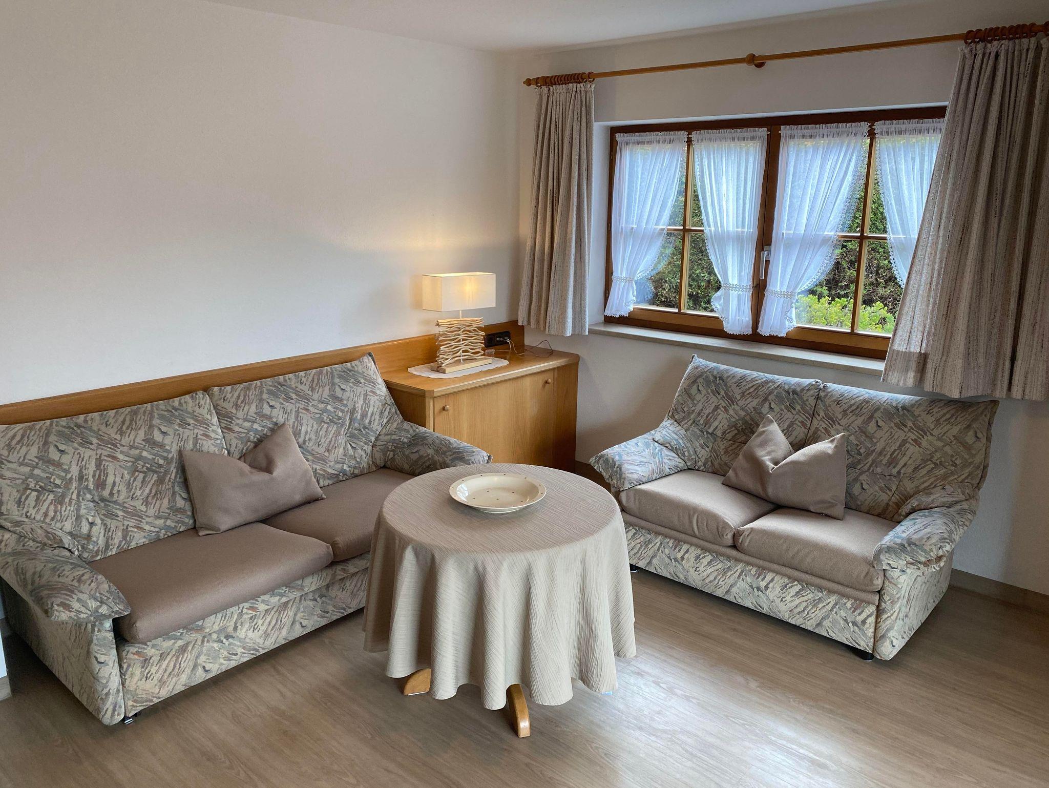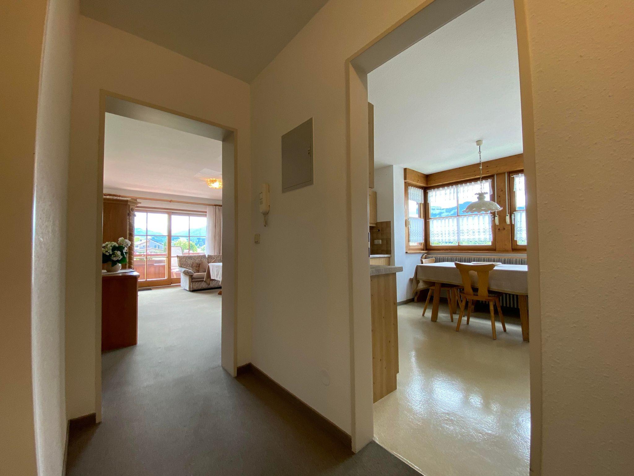 Mit Panorama Bergblick und idealem Südbalkon ist diese geräumige FeWo, sie verfügt über ein Wohnzimmer mit Schiebetüre zum Balkon, eingerichtet mit 2er Sofa, 3er Sofa (Ausziehsofa) und Sessel, Schrank und Kabel-Flach-TV, gemütliche Wohnküche mit Einbauküche (Spülmaschine) und gutem Essbereich mit Eckbank, 2 Schlafzimmer mit Doppelbetten, sep. WC, ein weisses Bad mit Wanne, Dusche, Waschbecken und WC. In der Wohnung ist angenehme Fußbodenheizung. Die FeWo-Nr. 2 ist gleich bis auf 2.Schlafzi. und Südterrasse.