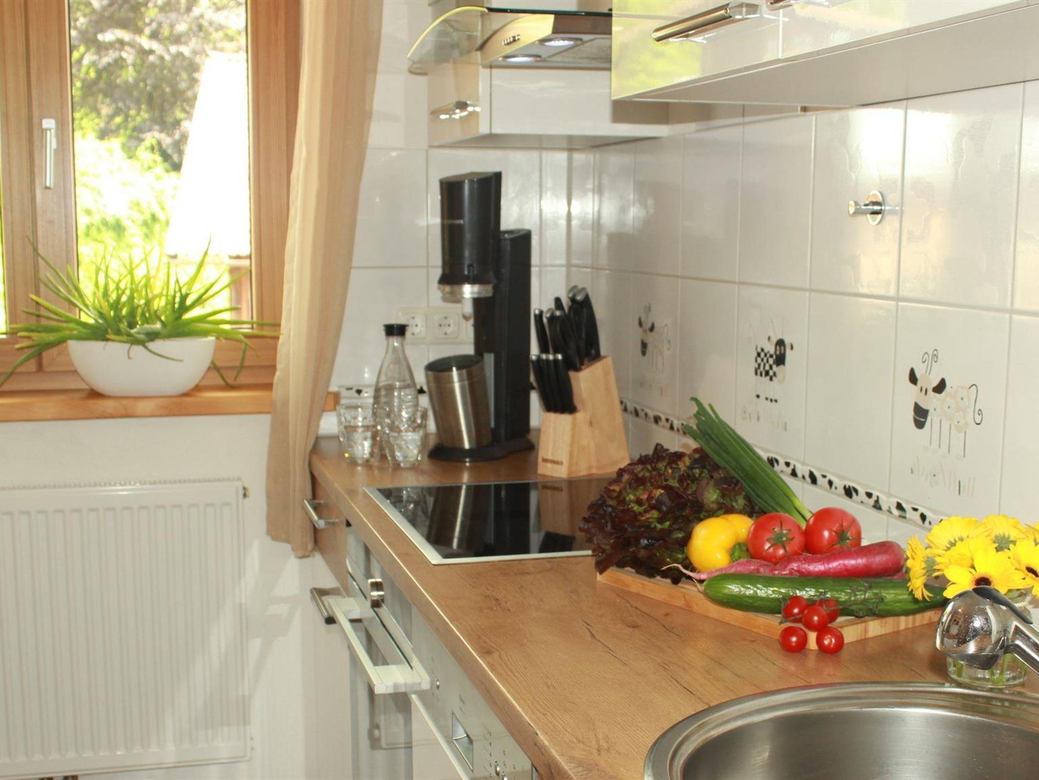 In der komfortablen und modernen Küche mit smarthome-fähigen Elektrogeräten und beispielsweise einem Kerntemperaturfühler fürs Handy, findet sich auch ein Soda-Stream zum Sprudeln unseres hervorragenden Allgäuer Leitungswassers und eine Senseo-Kaffeemaschine mit ausreichend Senseo-Pads für Ihren Aufenthalt.