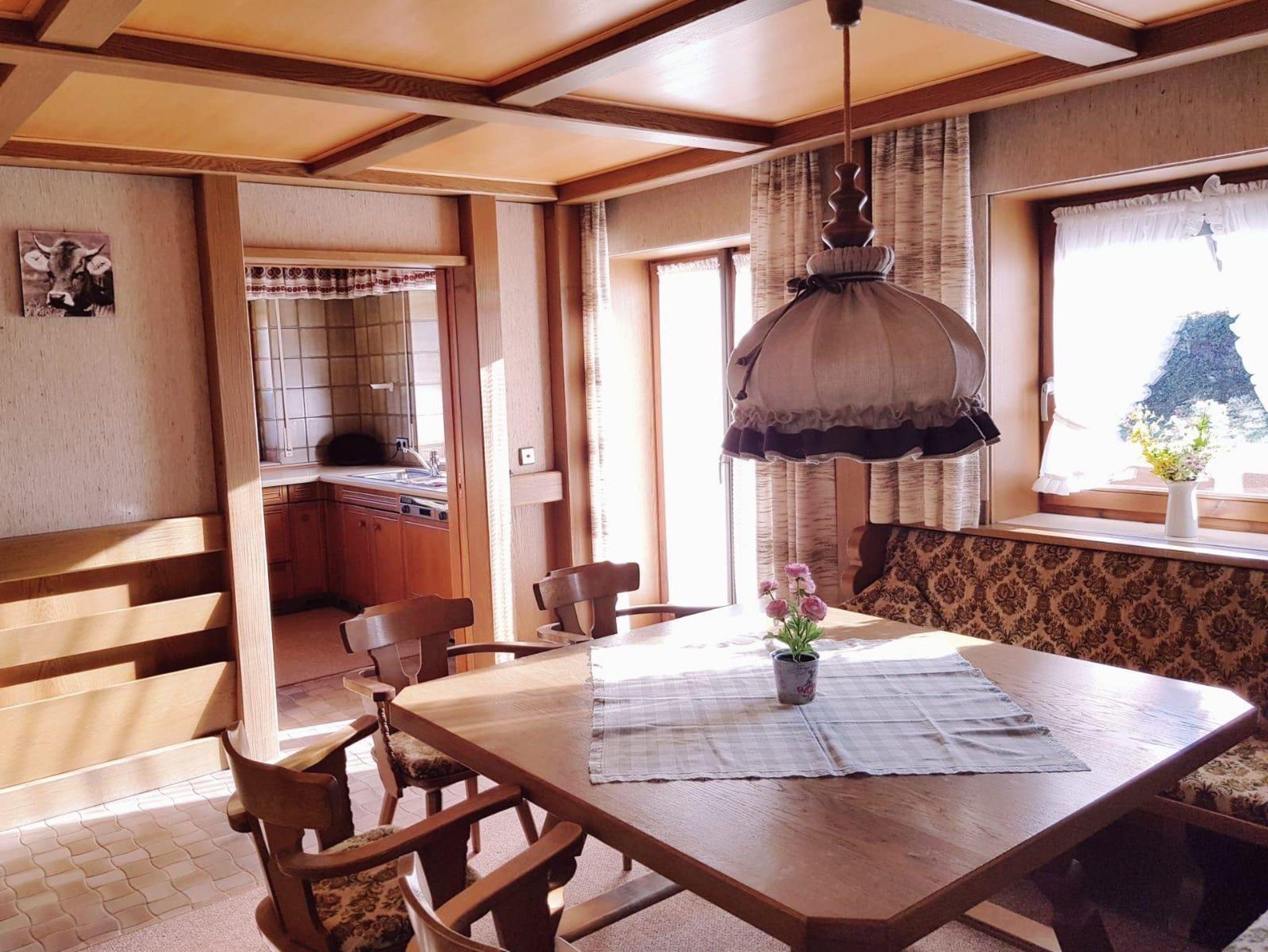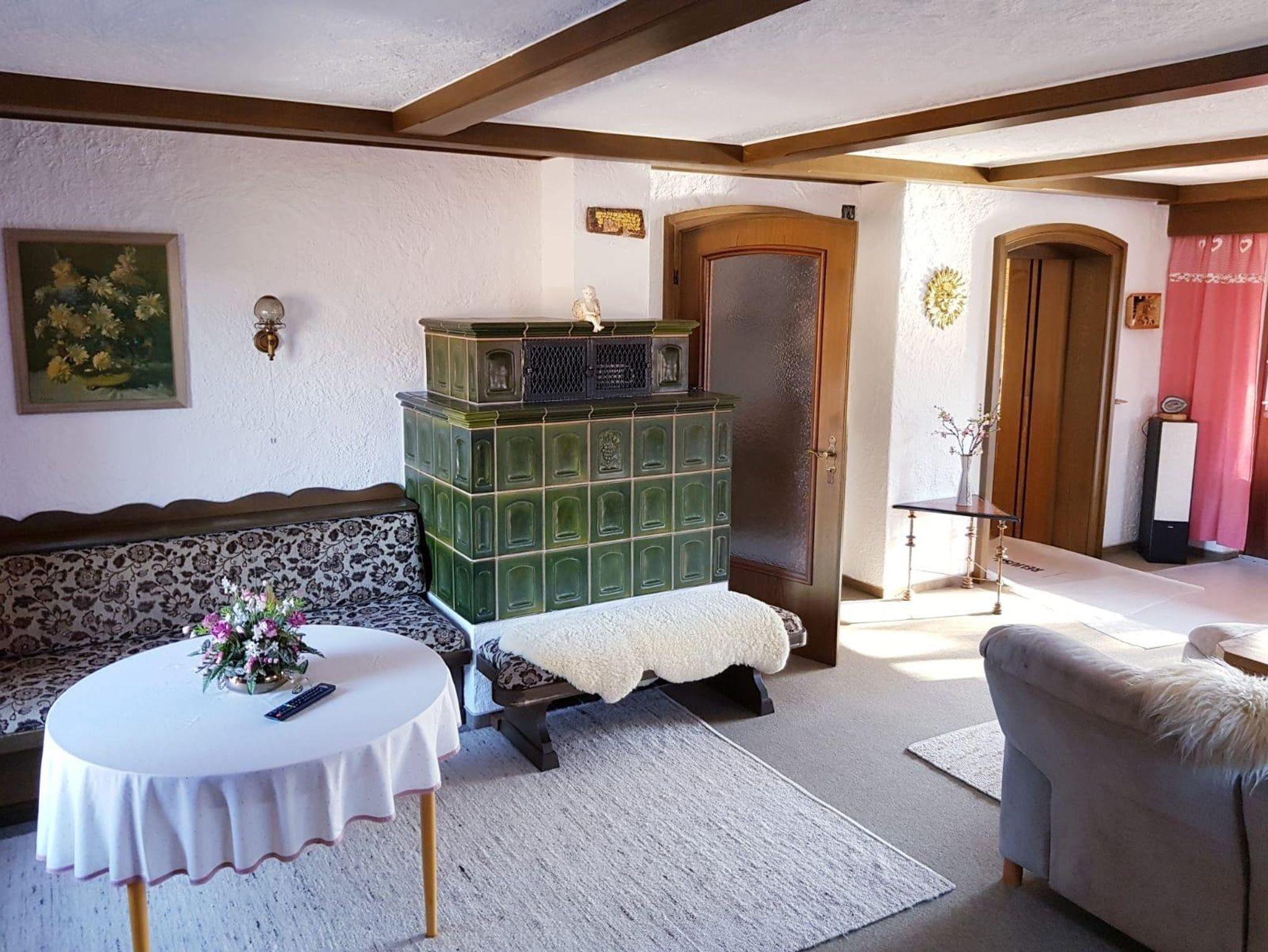 Unsere gut ausgestattete Küche mit Speisekammer lädt zum Kochen und gemeinsamen Essen ein, während das gemütliche Esszimmer und das Wohnzimmer mit einem traditionellen Kachelofen für gesellige Abende sorgen.