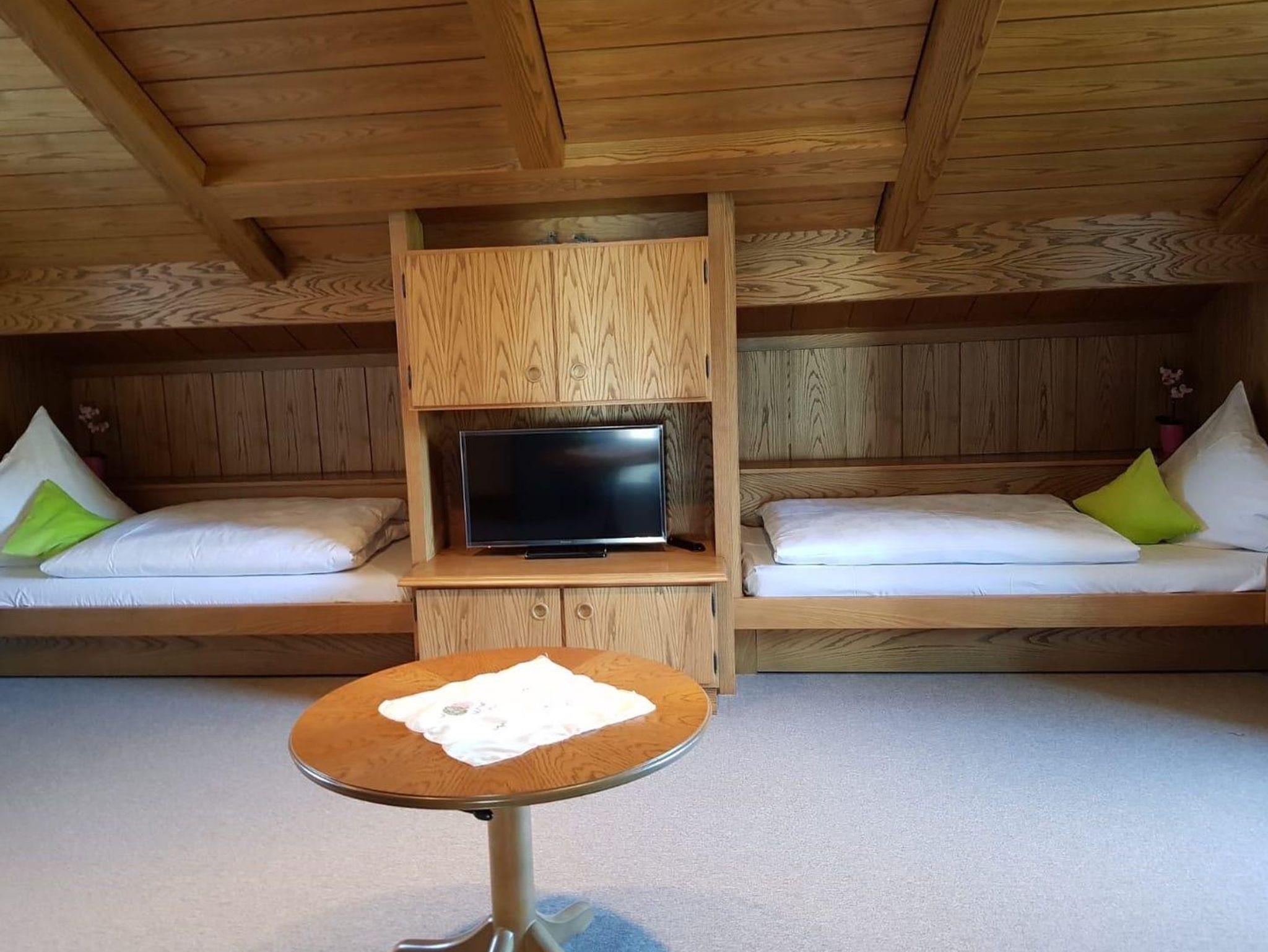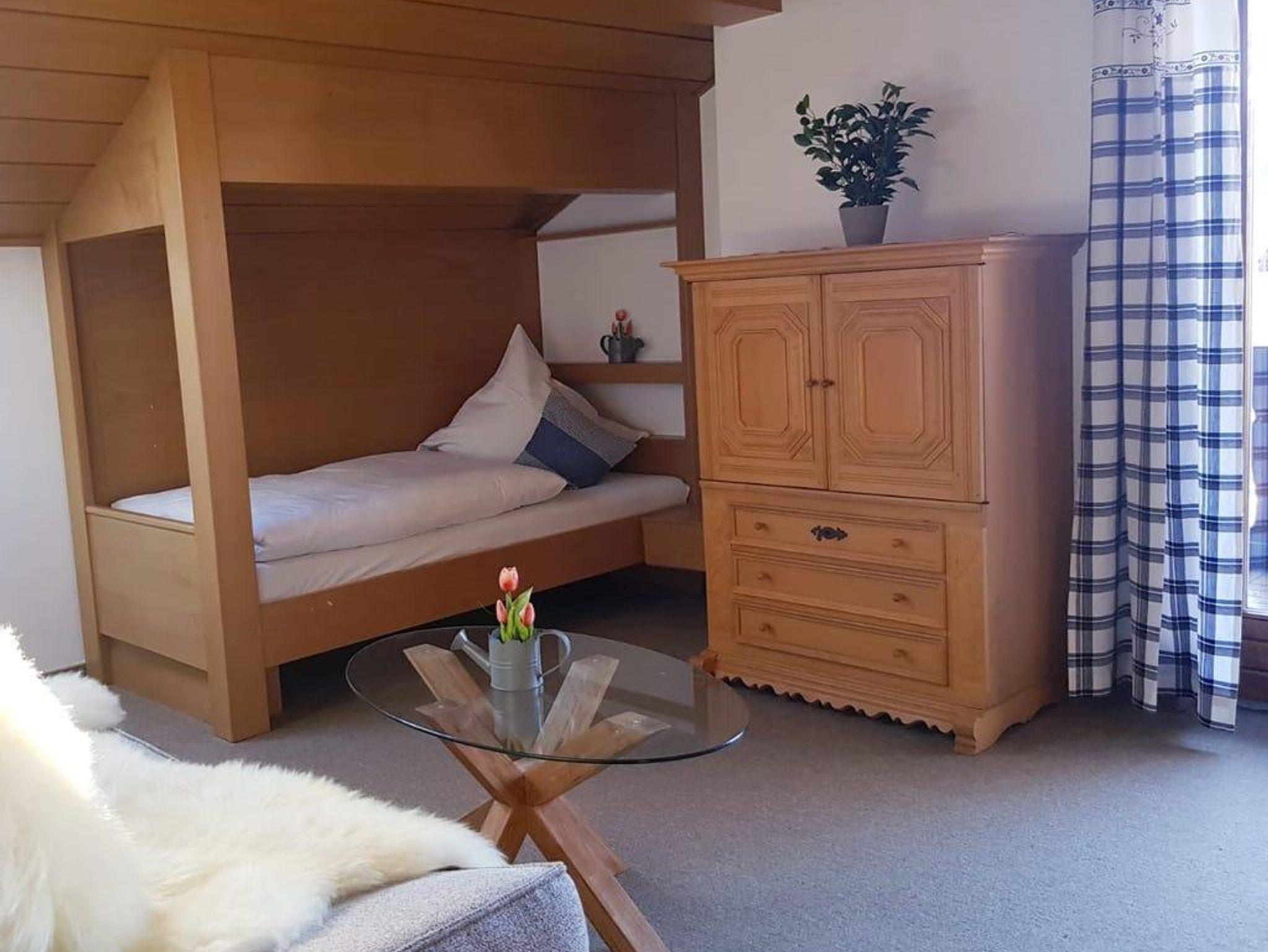Das Einzelzimmer Enzian verfügt über eine ausklappbare Couch, die im Handumdrehen Platz für eine zweite Person bietet. Fernseher, Kleiderschrank und Zugang zum Balkon sind selbstverständlich vorhanden.