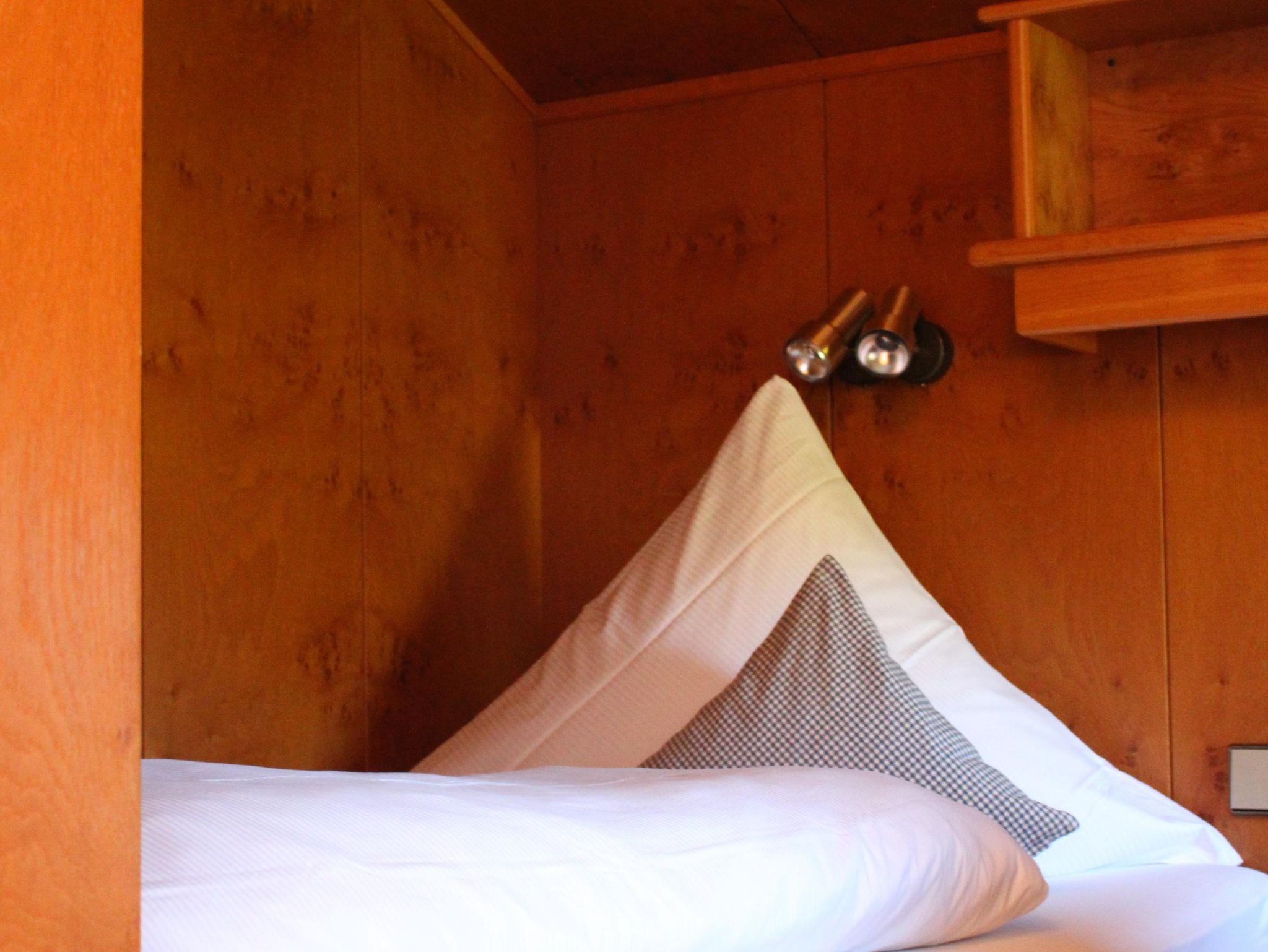 Das kleine, aber funktionale Einzelzimmer verfügt über einen eingebauten Schreibtisch sowie zwei große Kleiderschränke – ideal für alle, die auch im Urlaub nicht auf Ordnung und Struktur verzichten möchten. Der Balkonzugang macht das Zimmer hell und freundlich. Das in Holz eingebaute Bett macht das Zimmer gemütlich und kuschelig.
