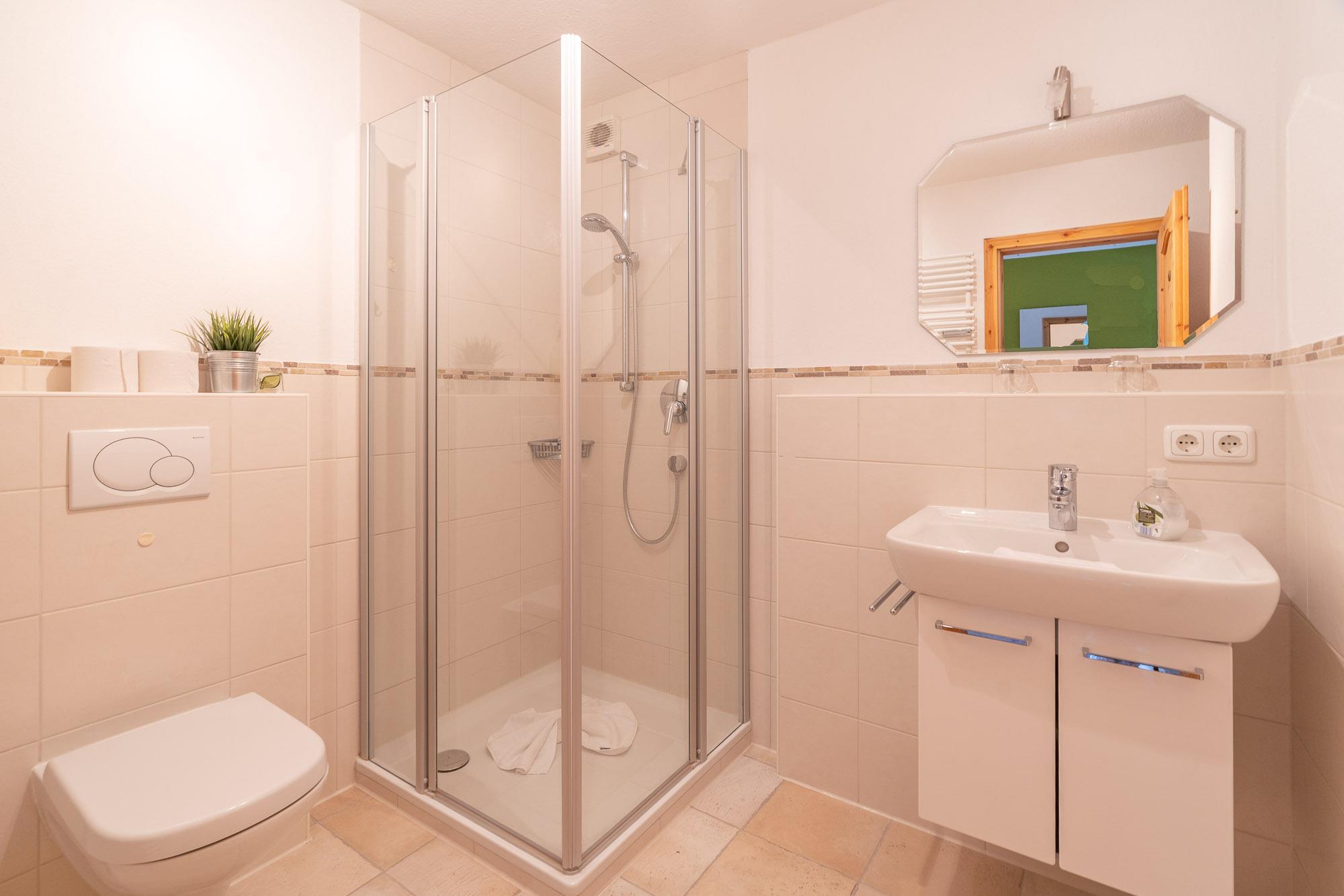 Die Wohnung verfügt über einen Wohnraum mit gemütlicher Essecke. Das Badezimmer mit Dusche und Waschbecken sowie ein WC. Ein großzügige Schlafzimmer bietet ein Doppelbett, sowie einen großen Kleiderschrank. Im 2. Schlafzimmer finden Sie ein französisches Bett und einen Kleiderschrank. Vervollständigt wird die Ferienwohnung durch eine gut ausgestattete Küche. Genießen Sie schöne Stunden auf dem Balkon, welcher über den Flur betreten werden kann.