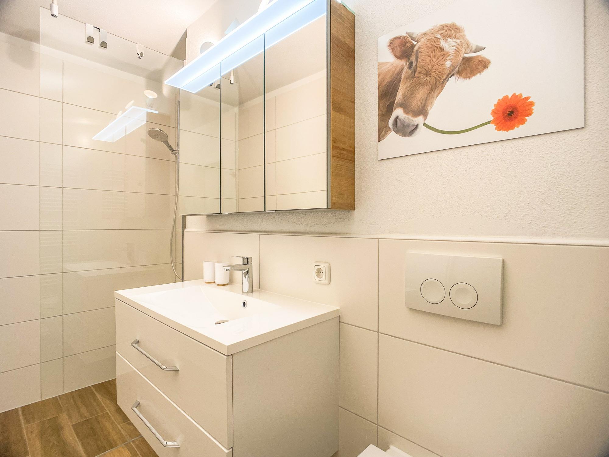 Die Badezimmer sind ausgestattet mit einer ebenerdigen Dusche, Föhn, Waschbecken, WC und Fußbodenheizung. Für den gemütlichen und erholsamen Schlaf sorgen zwei bequeme Boxspringbetten und ein Doppelbett. Ihre Kleider finden genügend Stauraum in den Kleiderschränken bzw. auf dem Kleiderständer. Für Entertainment sorgt ein mit1,65m Bildschirmdiagonale großer Fernseher mit Magenta TV und ein gutes WLAN Netz.