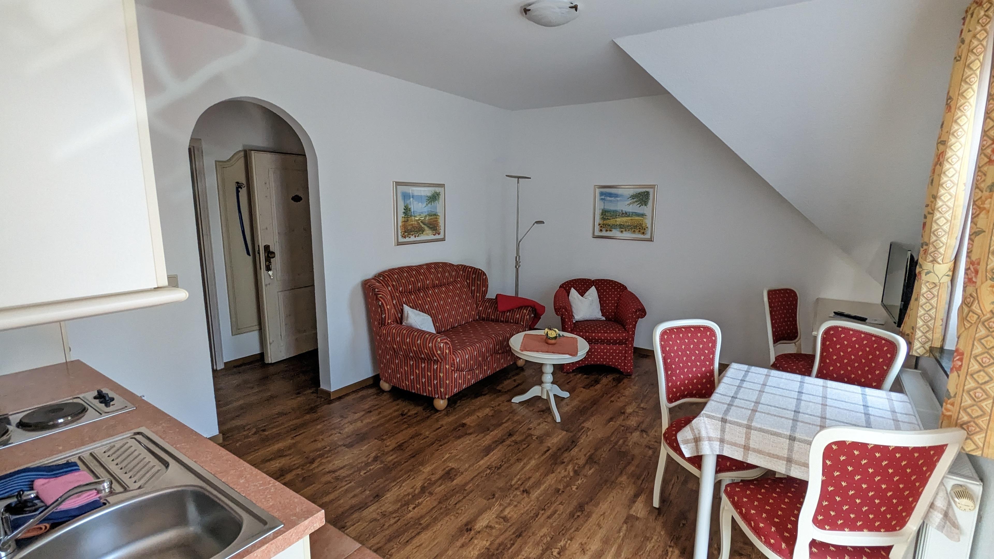 Ein Wellnessbereich mit Ruheraum, Erlebnisdusche, Fußwärmebecken, Sauna und Dampfbad steht allen Gästen in der Zeit von 16:00 Uhr bis 18:30 Uhr kostenlos zur Verfügung. Der Fitnessraum ist ständig zugänglich. Kostenfreie Parkmöglichkeiten befinden sich direkt vor dem Haus. Hier können sie auch ihr Elektroauto nachhaltig mit einer Wallbox aufladen. Eine Gaststätte ist ca. 100 Meter entfernt wo sie auch vorab Frühstück, Abendessen oder Halbpension (3-Gänge- Wahlmenü) buchen können