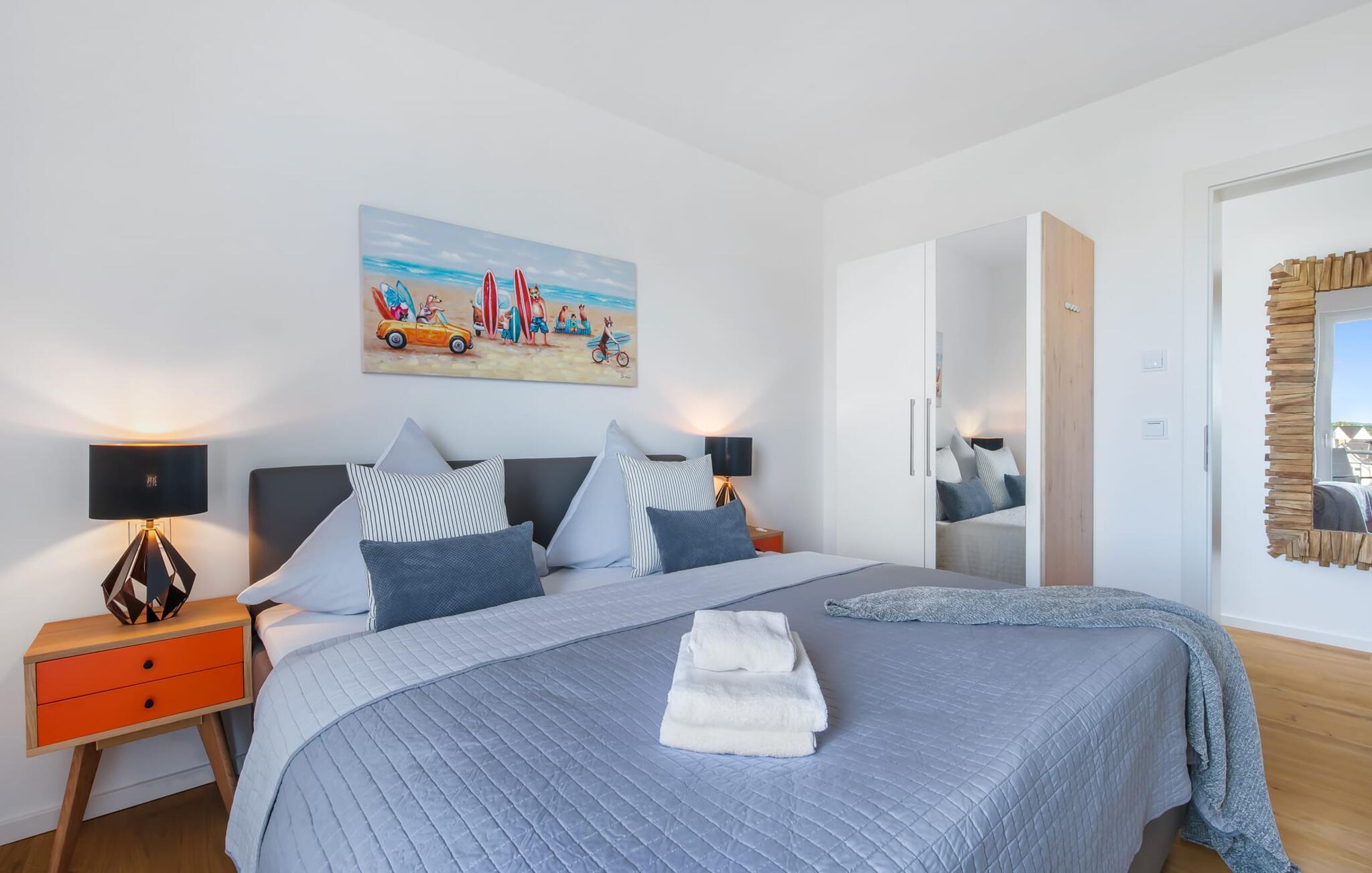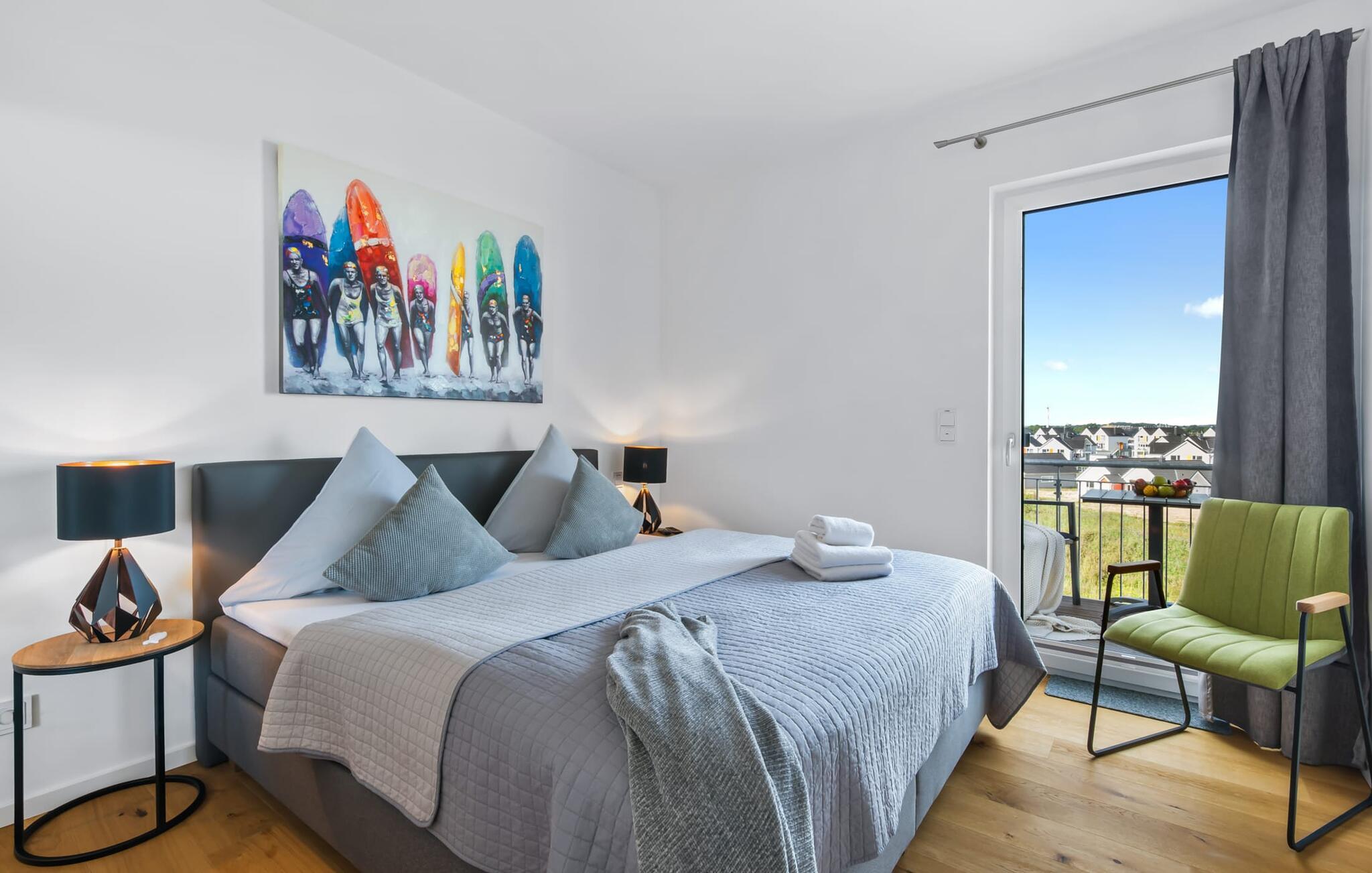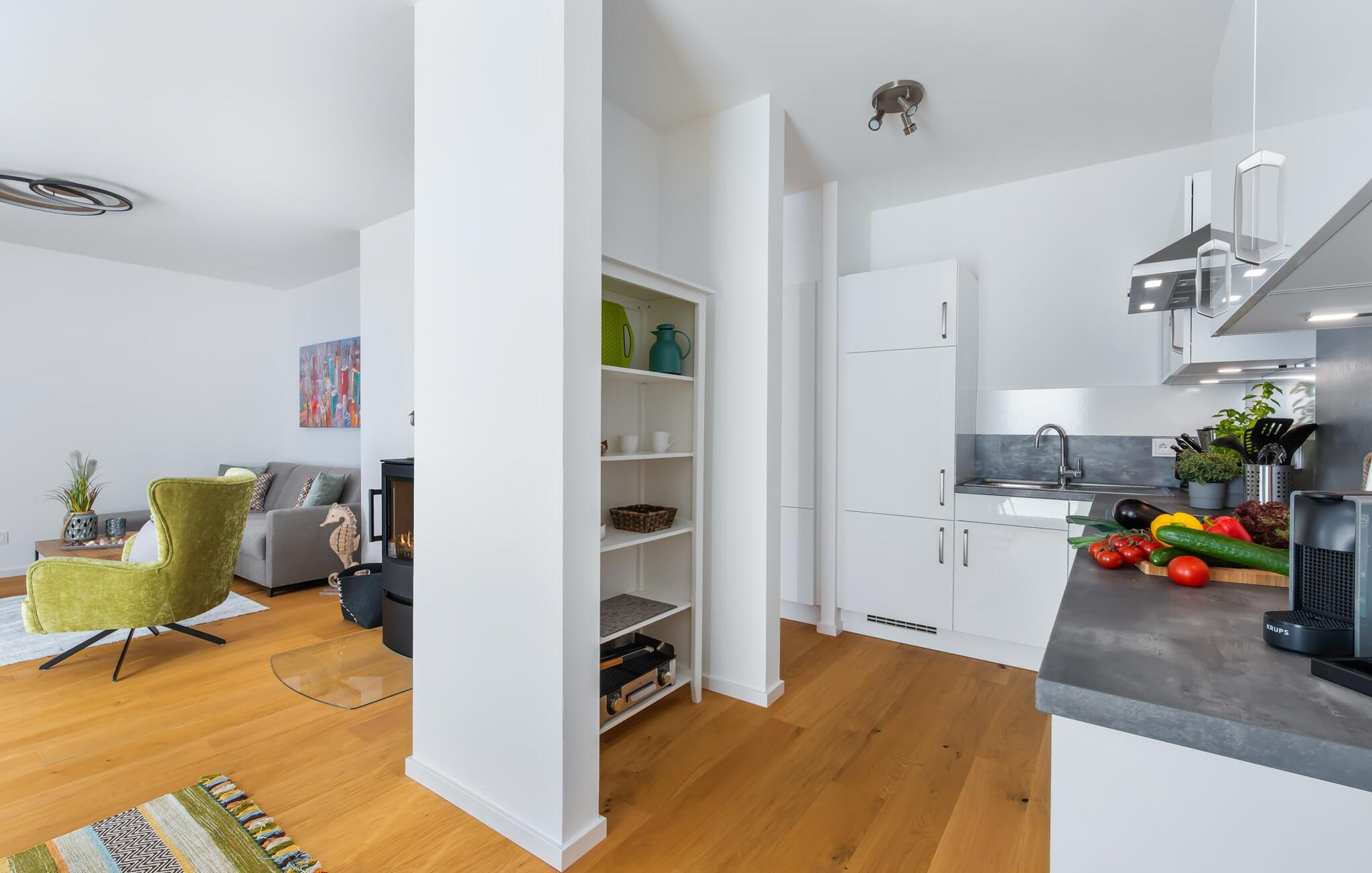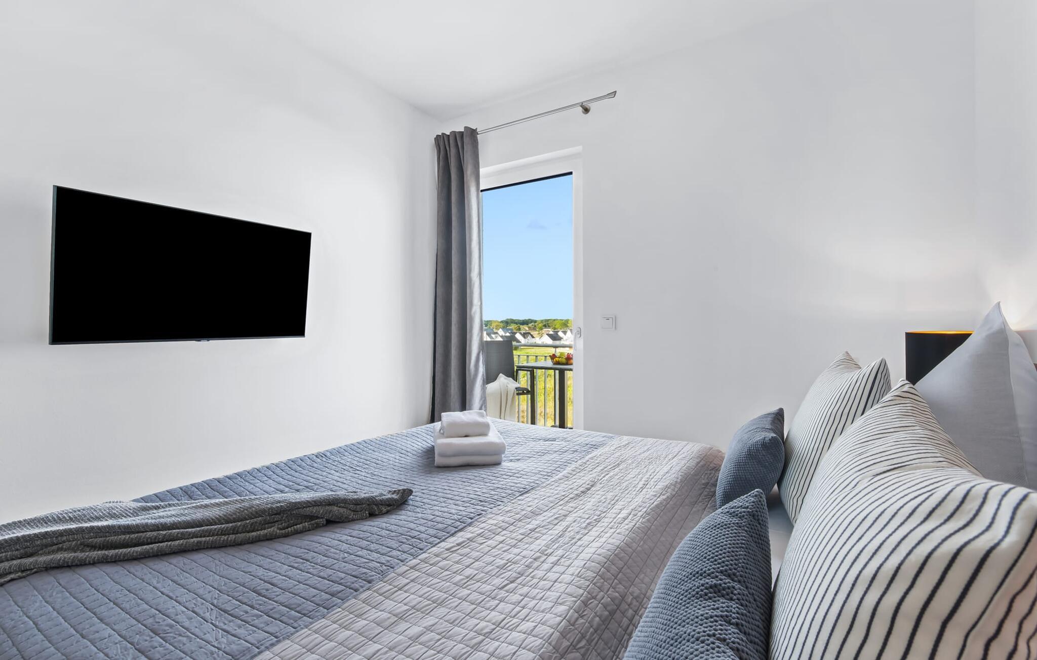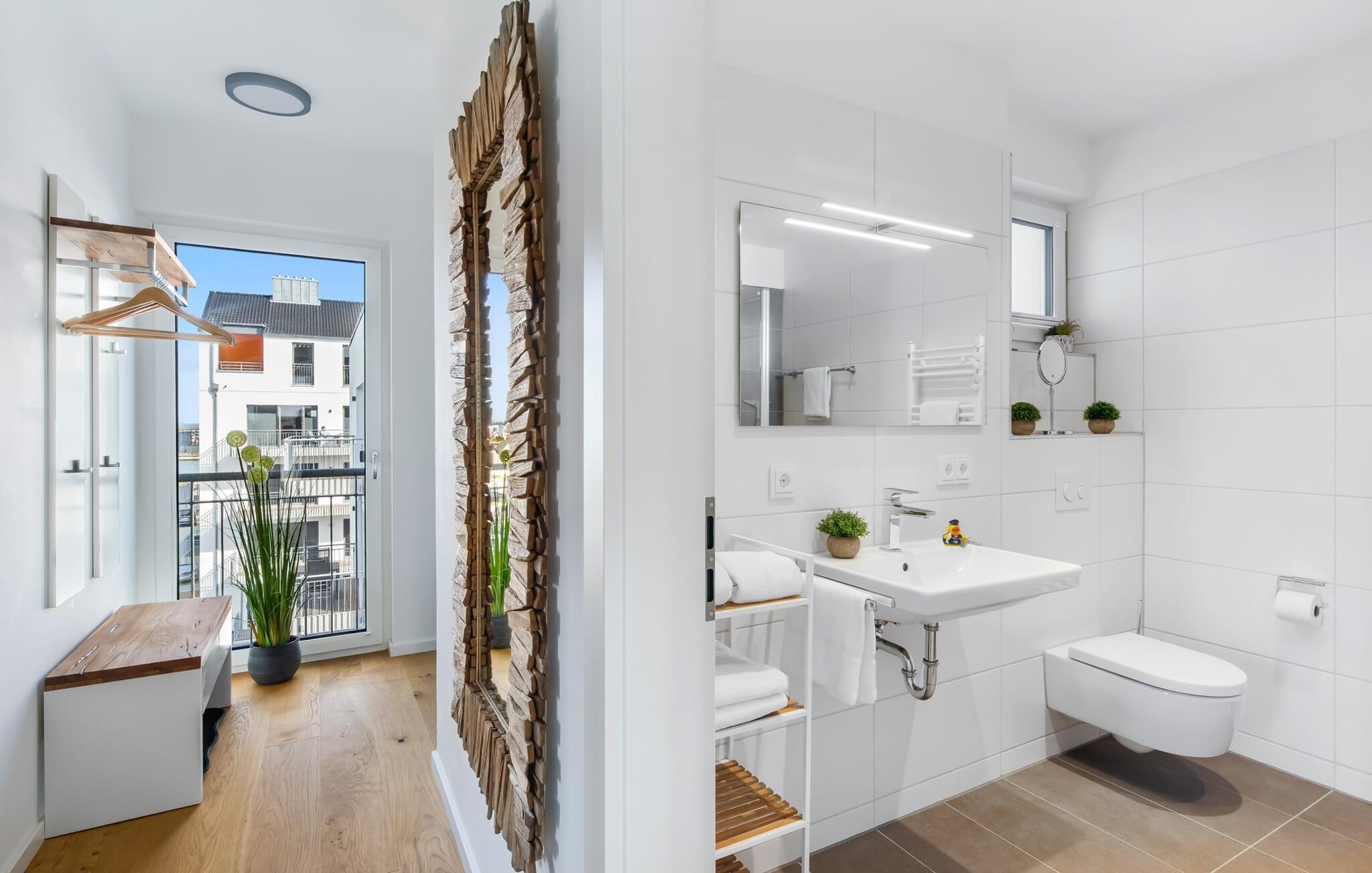 Denne skønne ferielejlighed til fire personer byder på alt, hvad man kan ønske sig til en ferie ved Østersøen. Beliggende direkte ved Østersøen er det kun et stenkast til Weidefelder sandstrand. Udover solbadning og svømning kan I også hygge jer i HUMMER-restauranten. Hvis stranden ikke er populær, kan I nå den populære Adventure Golf på få minutters gang. SOUNDS OF THE SEA er moderne, nordisk og indrettet med masser af ægte træ og parketgulvet i alle rum sikrer, at I føler jer godt tilpas fra første øjeblik. Vinduesfronten fra gulv til loft i den åbne stue/alrum tilbyder en betagende udsigt over den brede Østersø og sikrer vandbiograf hele dagen uden at blive kedelig. Træd ind på den tilstødende balkon og duft ikke kun den friske havluft, men lyt også til de lovede LYDE AF HAVET. Det hyggelige sofahjørne med TV og pejs inviterer til afslapning og gulvvarmen sørger for, at der er hyggeligt selv i den kølige årstid. Det lyse, integrerede køkken tilbyder selv kokkefagfolk alt, hvad de behøver for at tilberede lækre måltider, som derefter kan nydes sammen på balkonen med uendelig udsigt over vandet. De to soveværelser er hver udstyret med en dobbelt boxmadrasser og et fjernsyn, så en afslappende søvn er garanteret. En anden altan inviterer jer til at nyde en sundowner med udsigt over det store havnebassin, inklusive betagende solnedgange. Bruserummet med brusebad i gulvniveau lader heller intet tilbage at ønske og har alt hvad I behøver for en vellykket start på en ny feriedag. For at komme til ferieidyllen fra den underjordiske parkeringsplads (indgangshøjde: 2m), kan I enten vælge den sporty mulighed og bruge trappeopgangen eller komme ind i den tilgængelige elevator. Vores favoritsted: At lytte til HAVETS LYDE på balkonen og nyde den fænomenale udsigt over vandet... Bemærk venligst: OstseeResort Olpenitz er meget populært, og der bygges fortsat i parken. Ikke desto mindre kan I se frem til en 5-stjernet standard og et førsteklasses ophold. Byggeaktiviteterne kommer ikke til at forstyrre jer på ferien, og derfor gives der ikke yderligere afslag i prisen.