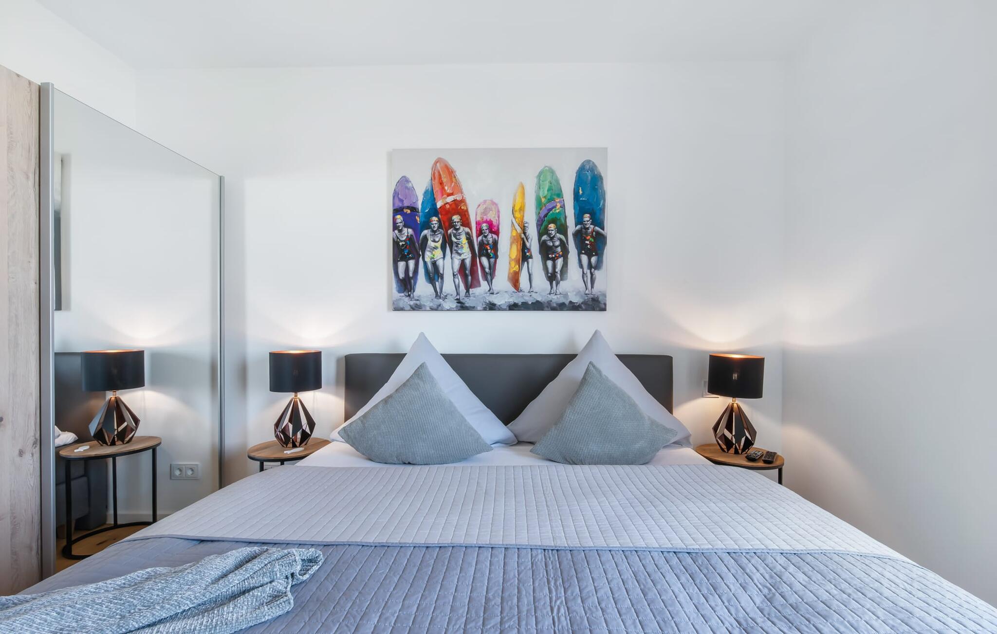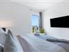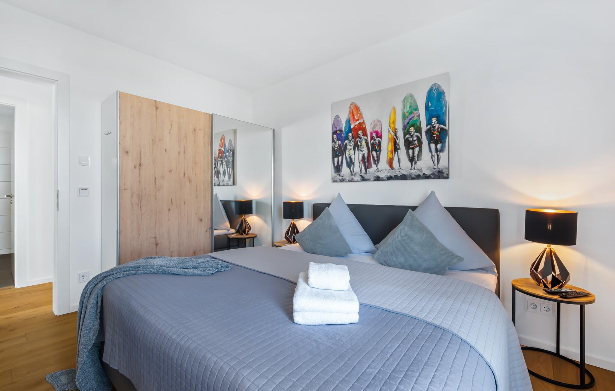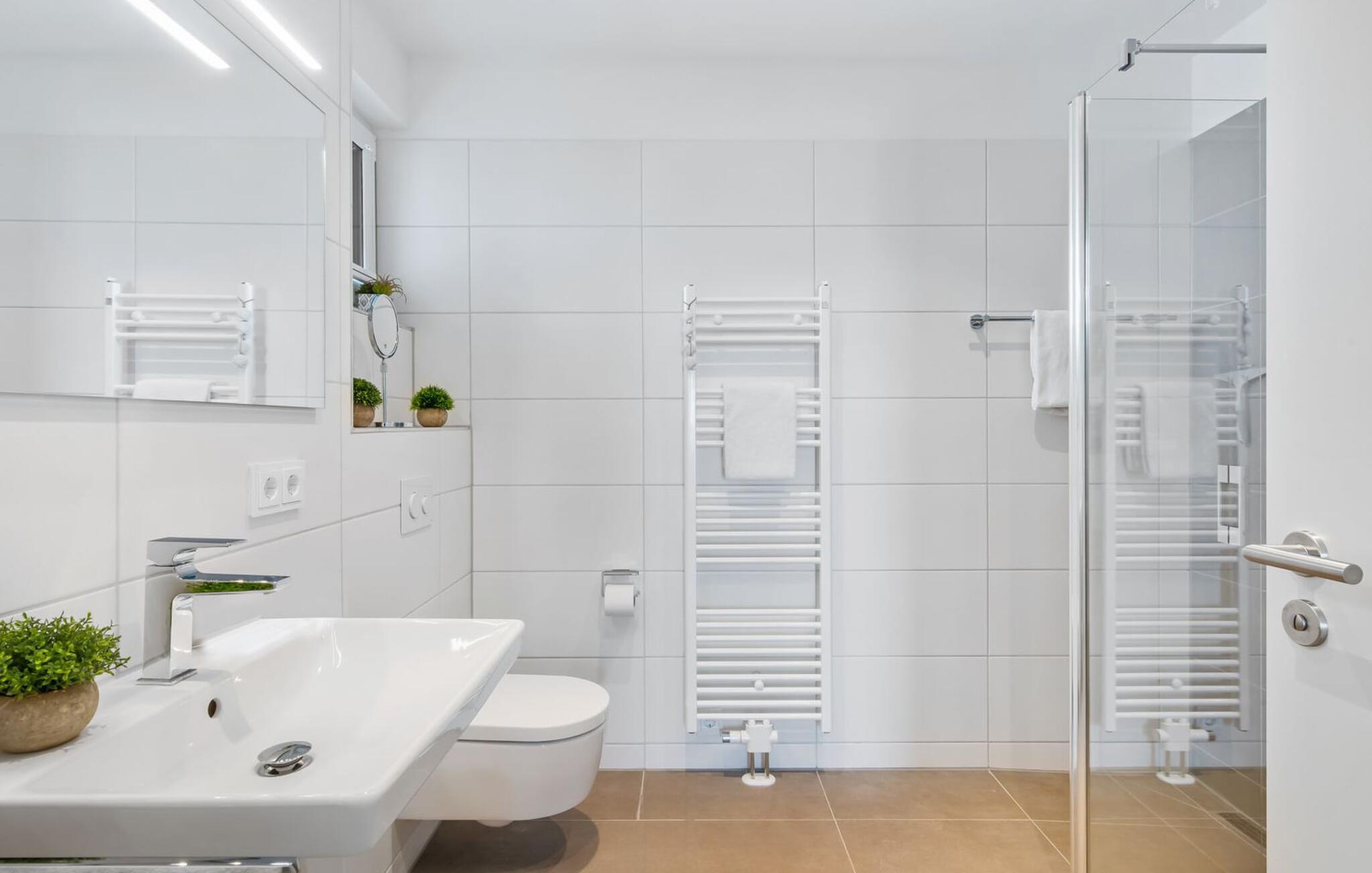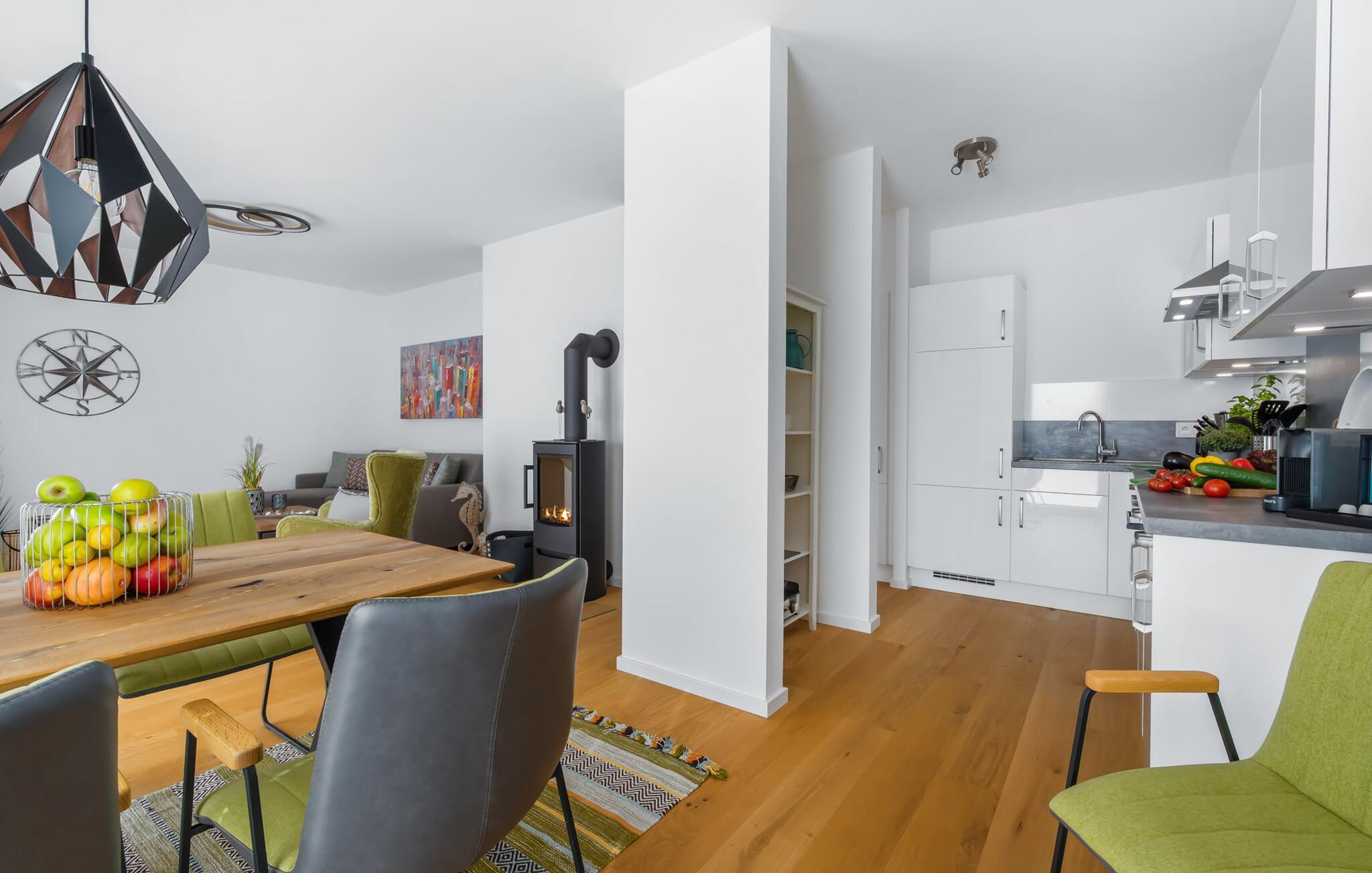 Denne skønne ferielejlighed til fire personer byder på alt, hvad man kan ønske sig til en ferie ved Østersøen. Beliggende direkte ved Østersøen er det kun et stenkast til Weidefelder sandstrand. Udover solbadning og svømning kan I også hygge jer i HUMMER-restauranten. Hvis stranden ikke er populær, kan I nå den populære Adventure Golf på få minutters gang. SOUNDS OF THE SEA er moderne, nordisk og indrettet med masser af ægte træ og parketgulvet i alle rum sikrer, at I føler jer godt tilpas fra første øjeblik. Vinduesfronten fra gulv til loft i den åbne stue/alrum tilbyder en betagende udsigt over den brede Østersø og sikrer vandbiograf hele dagen uden at blive kedelig. Træd ind på den tilstødende balkon og duft ikke kun den friske havluft, men lyt også til de lovede LYDE AF HAVET. Det hyggelige sofahjørne med TV og pejs inviterer til afslapning og gulvvarmen sørger for, at der er hyggeligt selv i den kølige årstid. Det lyse, integrerede køkken tilbyder selv kokkefagfolk alt, hvad de behøver for at tilberede lækre måltider, som derefter kan nydes sammen på balkonen med uendelig udsigt over vandet. De to soveværelser er hver udstyret med en dobbelt boxmadrasser og et fjernsyn, så en afslappende søvn er garanteret. En anden altan inviterer jer til at nyde en sundowner med udsigt over det store havnebassin, inklusive betagende solnedgange. Bruserummet med brusebad i gulvniveau lader heller intet tilbage at ønske og har alt hvad I behøver for en vellykket start på en ny feriedag. For at komme til ferieidyllen fra den underjordiske parkeringsplads (indgangshøjde: 2m), kan I enten vælge den sporty mulighed og bruge trappeopgangen eller komme ind i den tilgængelige elevator. Vores favoritsted: At lytte til HAVETS LYDE på balkonen og nyde den fænomenale udsigt over vandet... Bemærk venligst: OstseeResort Olpenitz er meget populært, og der bygges fortsat i parken. Ikke desto mindre kan I se frem til en 5-stjernet standard og et førsteklasses ophold. Byggeaktiviteterne kommer ikke til at forstyrre jer på ferien, og derfor gives der ikke yderligere afslag i prisen.