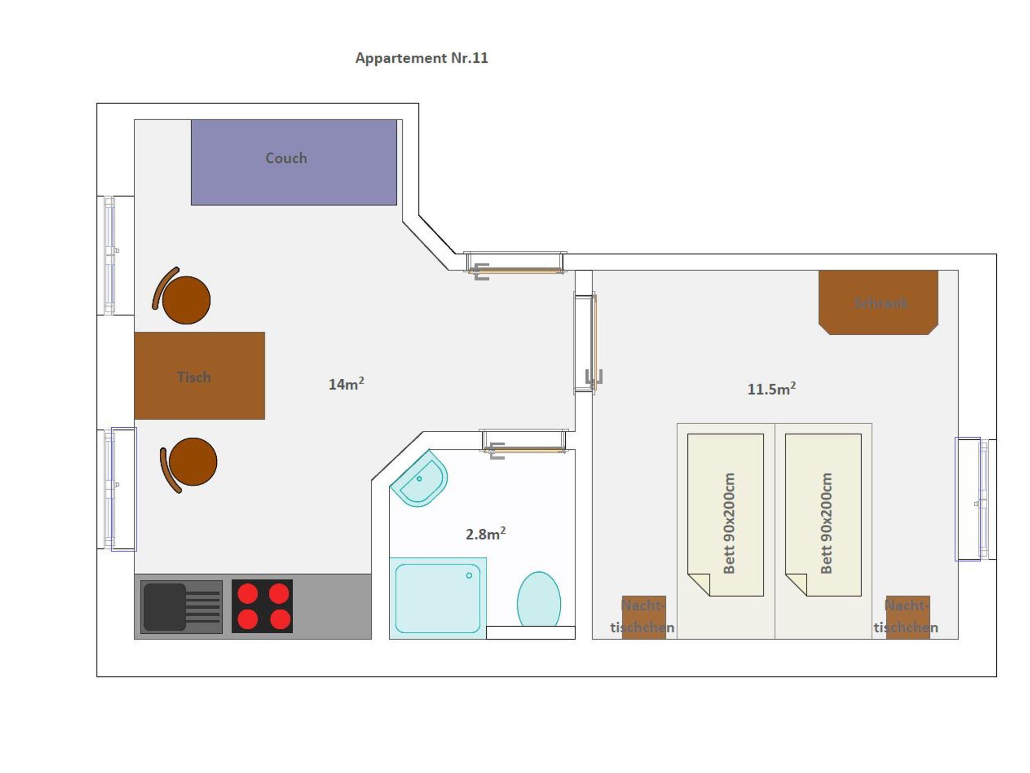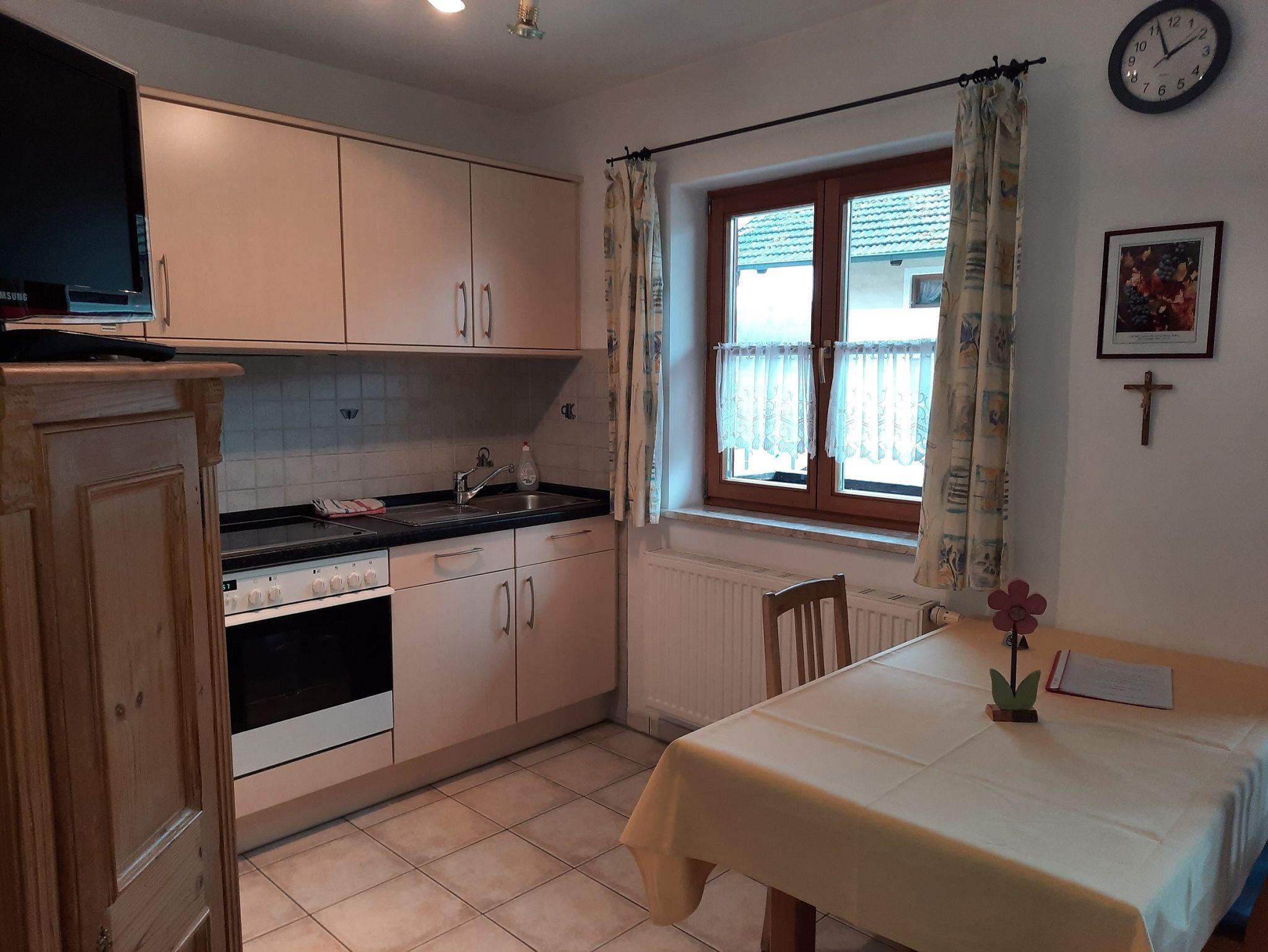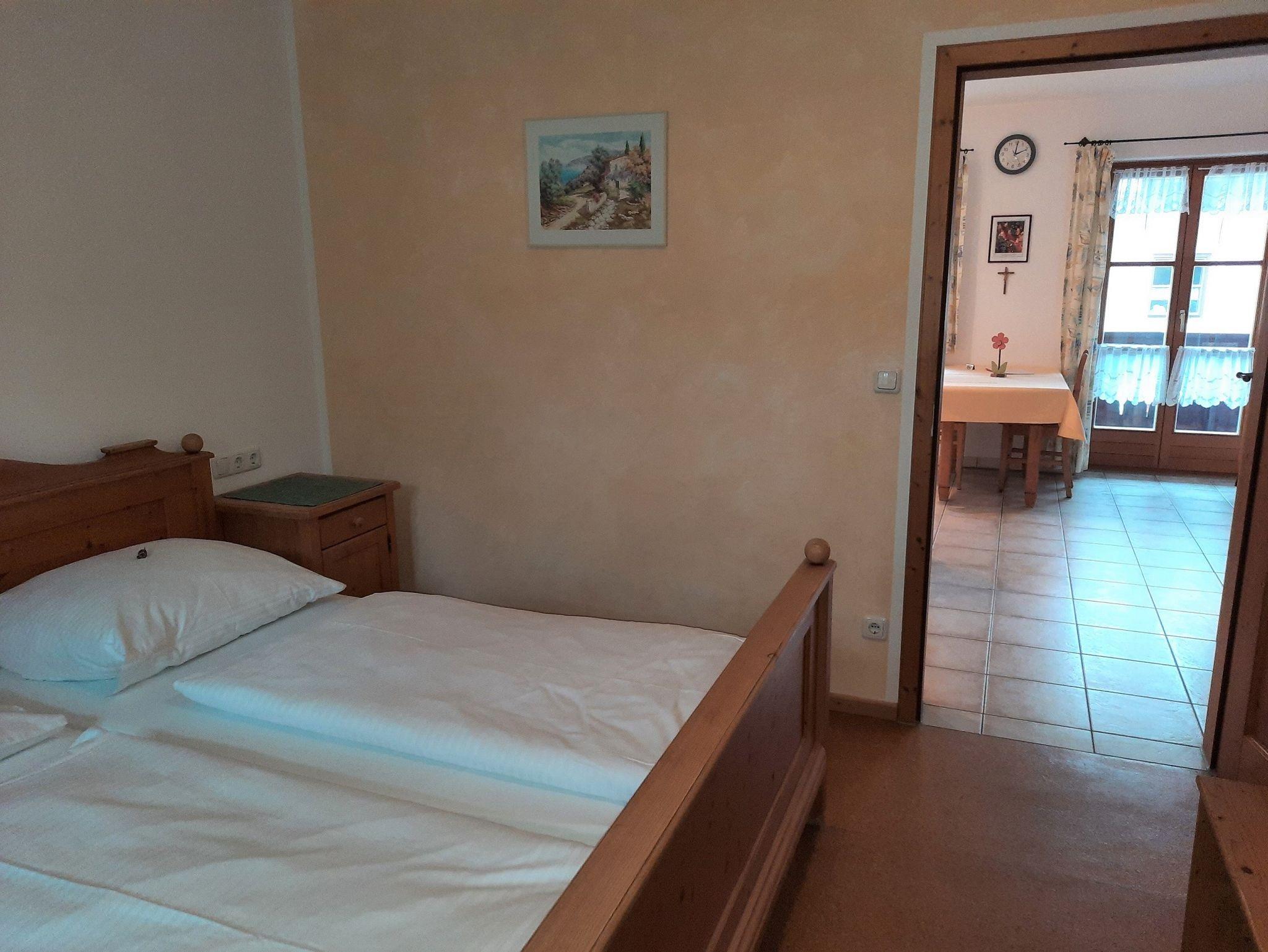 Das Appartement liegt im Nebengebäude und ist ebenerdig zu erreichen. In der Wohnküche befindet sich eine Schlafcouch, TV und eine Sitzgruppe. Das Bad ist ausgestattet mit Dusche/WC, Fön, Kosmetikspiegel und Toilettenartikel. Das Schlafzimmer hat ein Doppelbett. Das Appartement hat einen Balkon und eine kleine Terrasse zur Mitbenutzung.