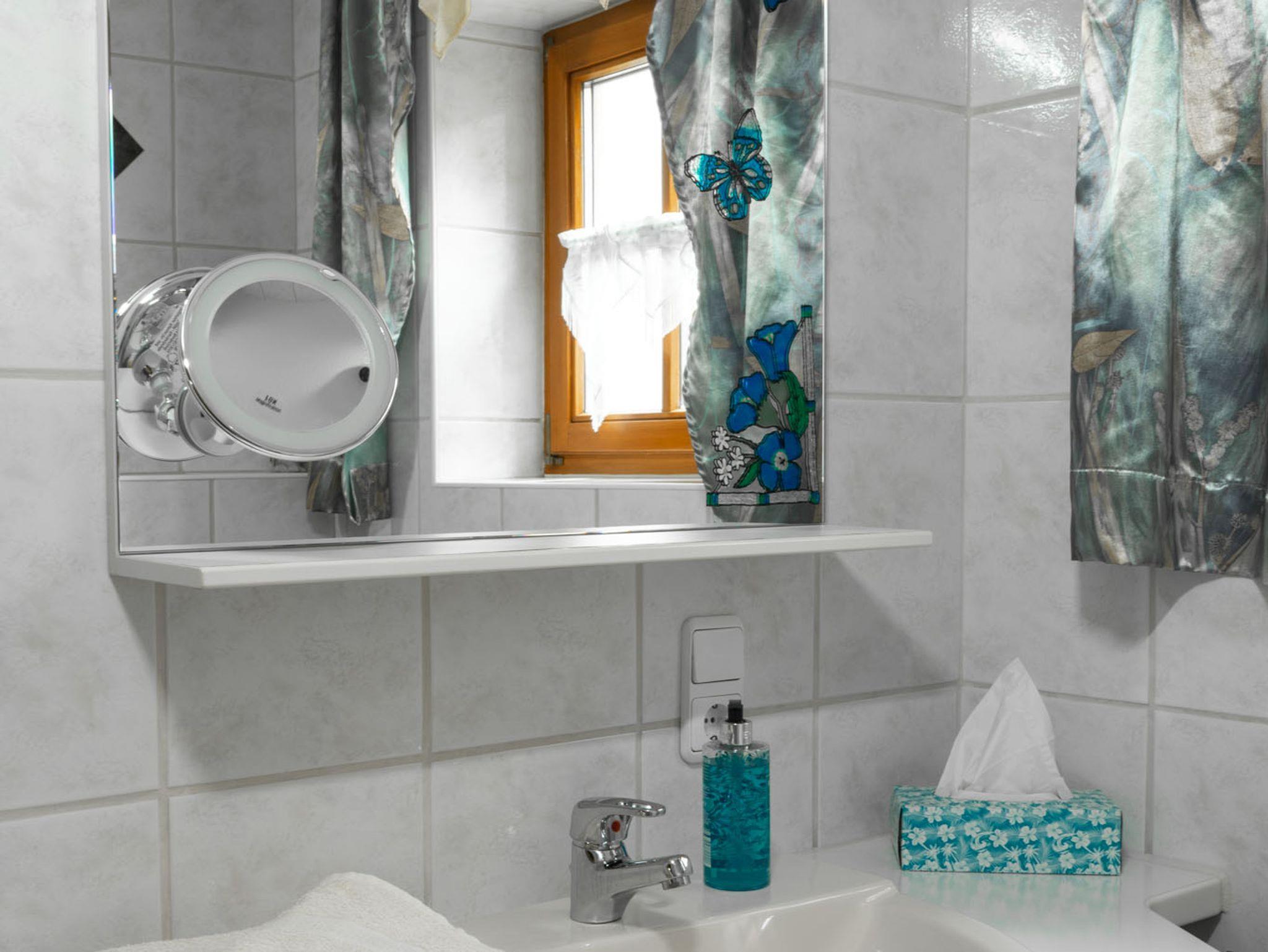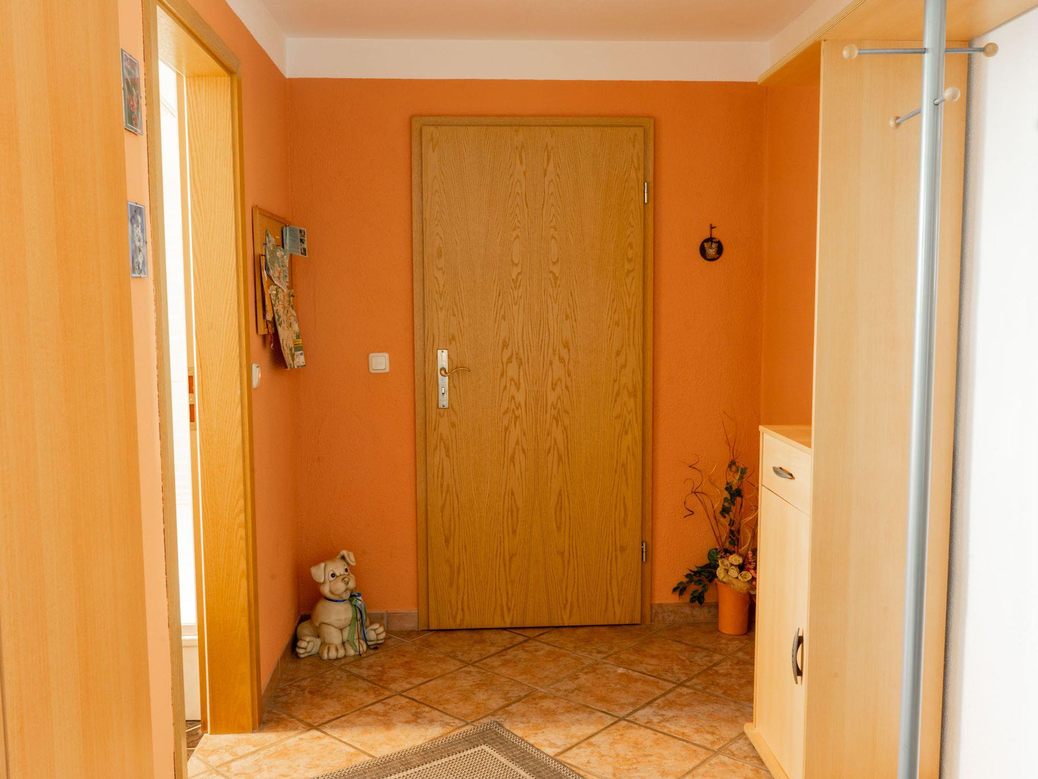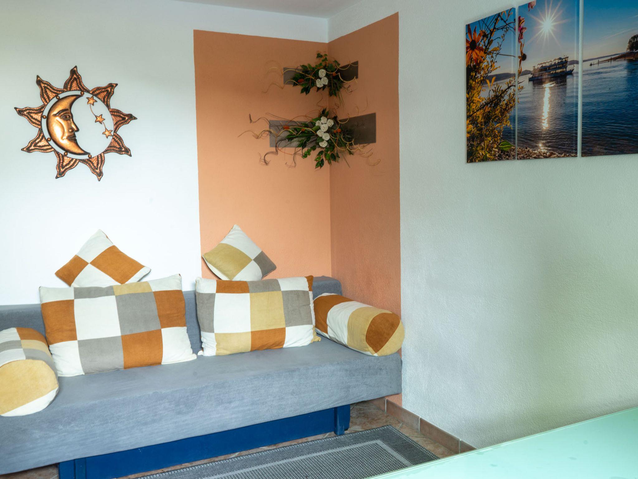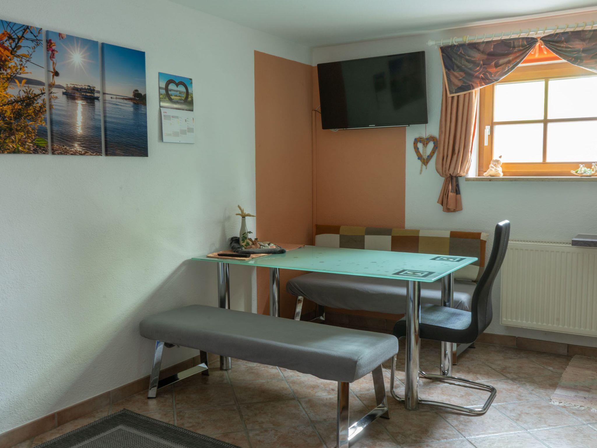 Die abgeschlossene Ferienwohnung mit eigenem Eingang verfügt über einen eigenen Eingang, ein Badezimmer mit Dusche / WC, eine gut ausgestattete Wohnküche mit Ess- und Sitzbereich, Schlafcouch, ein Schlafzimmer mit Doppelbett und Stockbett.
