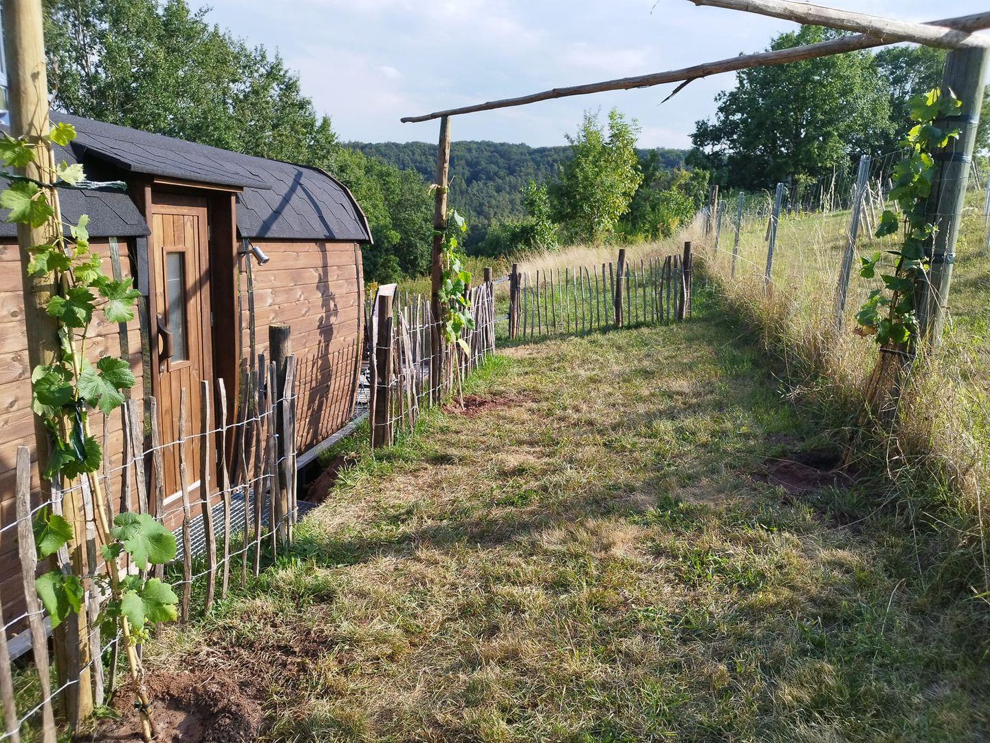 Die mobile Weinberghaus ist mit einer Batterie, Wechselrichter und ein Solarpanel ausgestattet und bietet eine 230V Versorgung während des Aufenthaltes