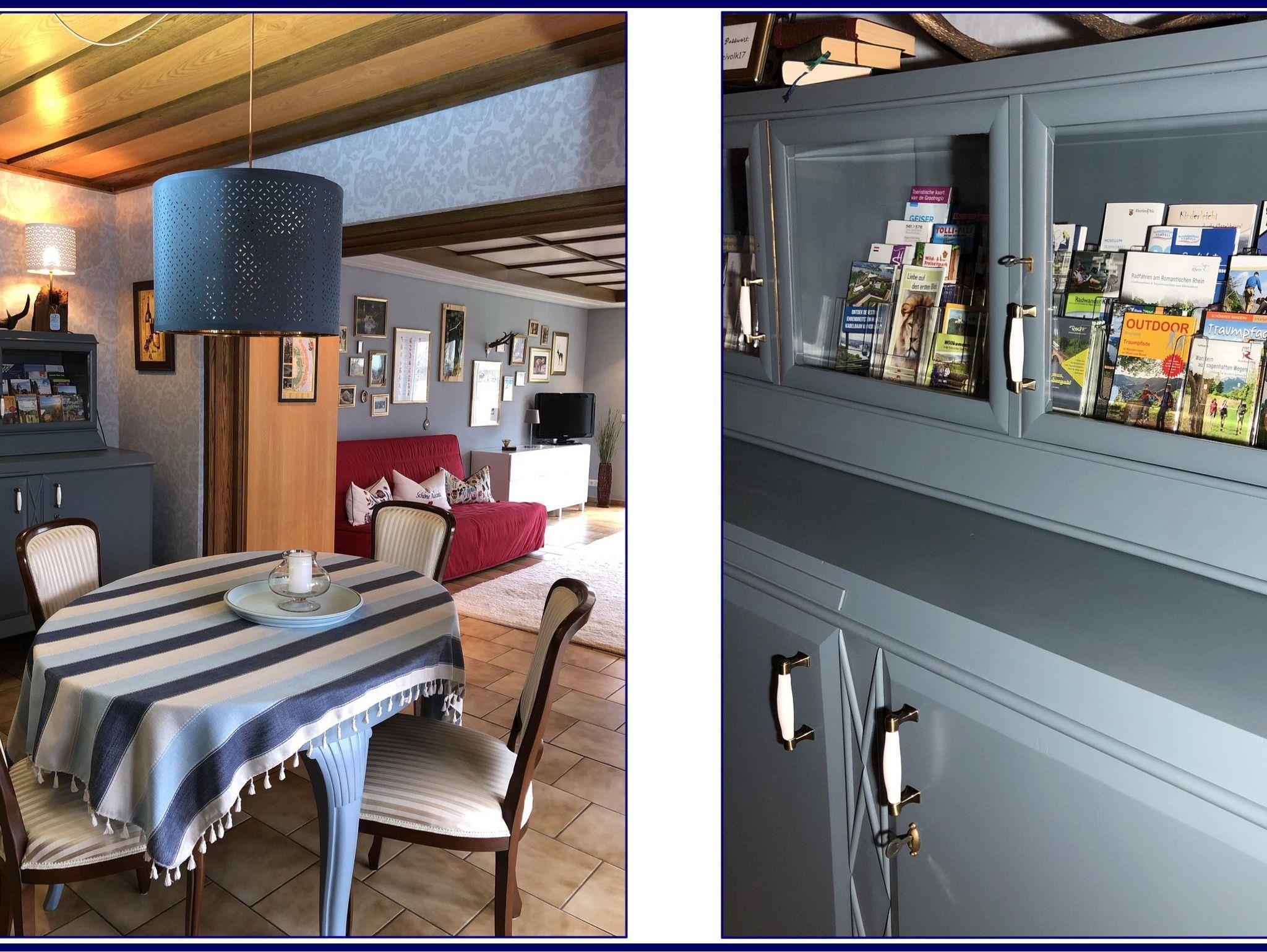 Hereinspaziert in unsere gemütliche Ferienwohnung! Fühlen Sie sich wohl auf 95m². Die Kombination traditioneller und moderner Elemente verleiht dieser Wohnung einen ganz besonderen Charme. Betreten Sie Ihre Bleibe über den separaten Eingang Ihrer eigenen Terrasse, hinein ins Kaminzimmer mit dem hübschen alten blauen Schrank.