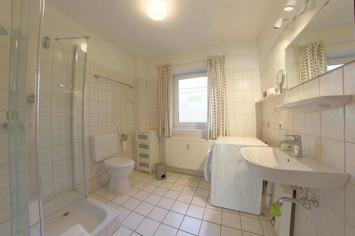 Das geräumige Duschbad mit großer Dusche, Fenster und Waschmaschine bietet ausreichend Platz.