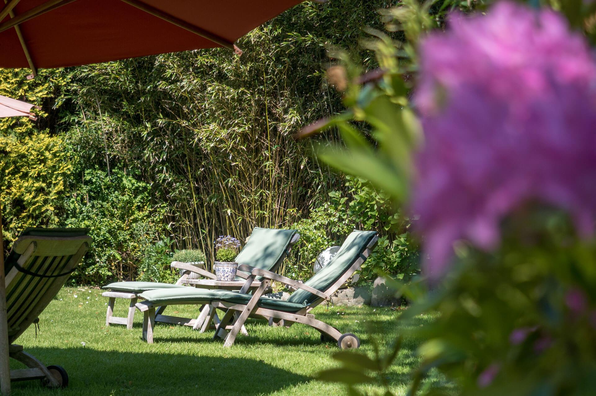 Und draußen? Da wartet ein kleiner, sonniger Garten mit Blumen und Rhododendren auf dich – ideal zum Sonnen, Lesen oder für den ersten Kaffee am Morgen. Mehr braucht’s manchmal gar nicht, oder?