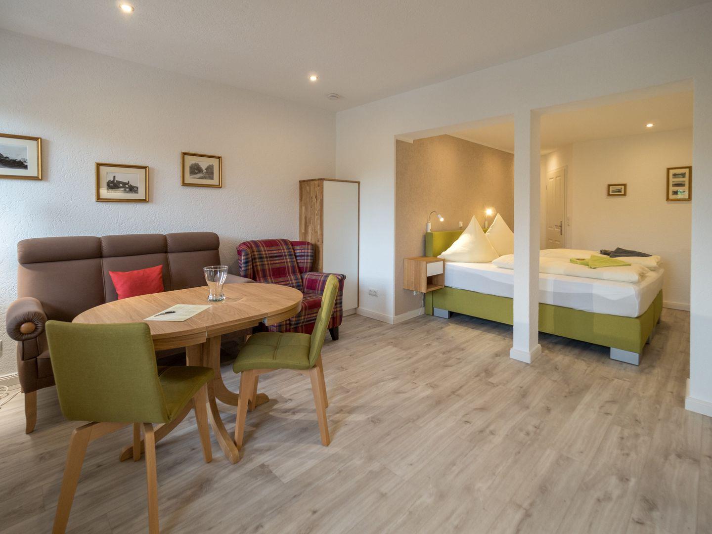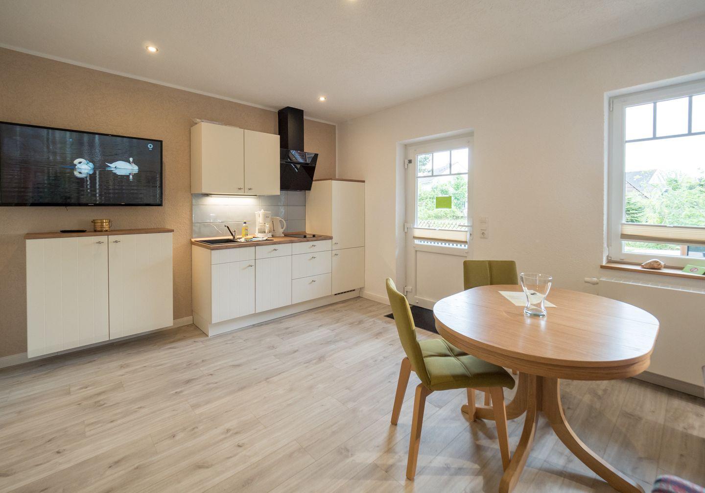Das offene Wohn- und Schlafzimmer mit integrierter Küchenzeile lädt zum Entspannen und Genießen ein. Hier finden Sie alles, was Sie für einen komfortablen Aufenthalt benötigen, von einer gemütlichen Sitzecke bis hin zu einer gut ausgestatteten Küche, in der Sie Ihre Lieblingsgerichte zubereiten können.