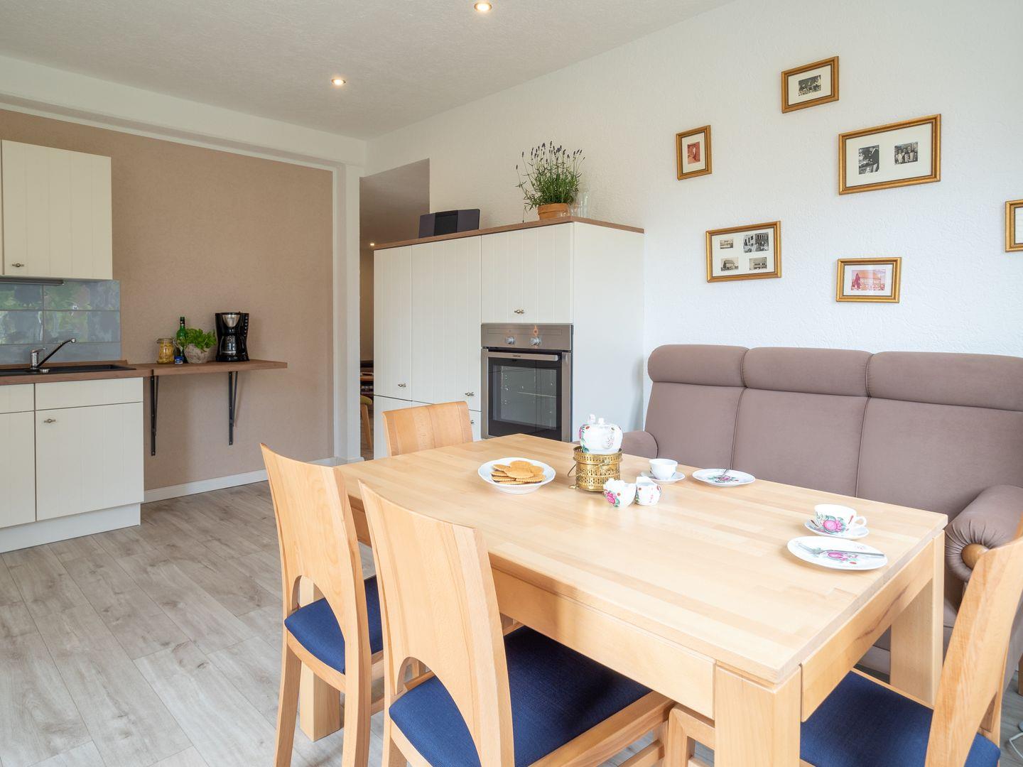 Der großzügige Wohn- und Essbereich mit offener Küchenzeile lädt zum gemeinsamen Kochen, Essen und Entspannen ein. Hier finden Sie alles, was Sie für einen gelungenen Aufenthalt benötigen – von modernen Küchengeräten bis hin zu einer gemütlichen Sitzecke.