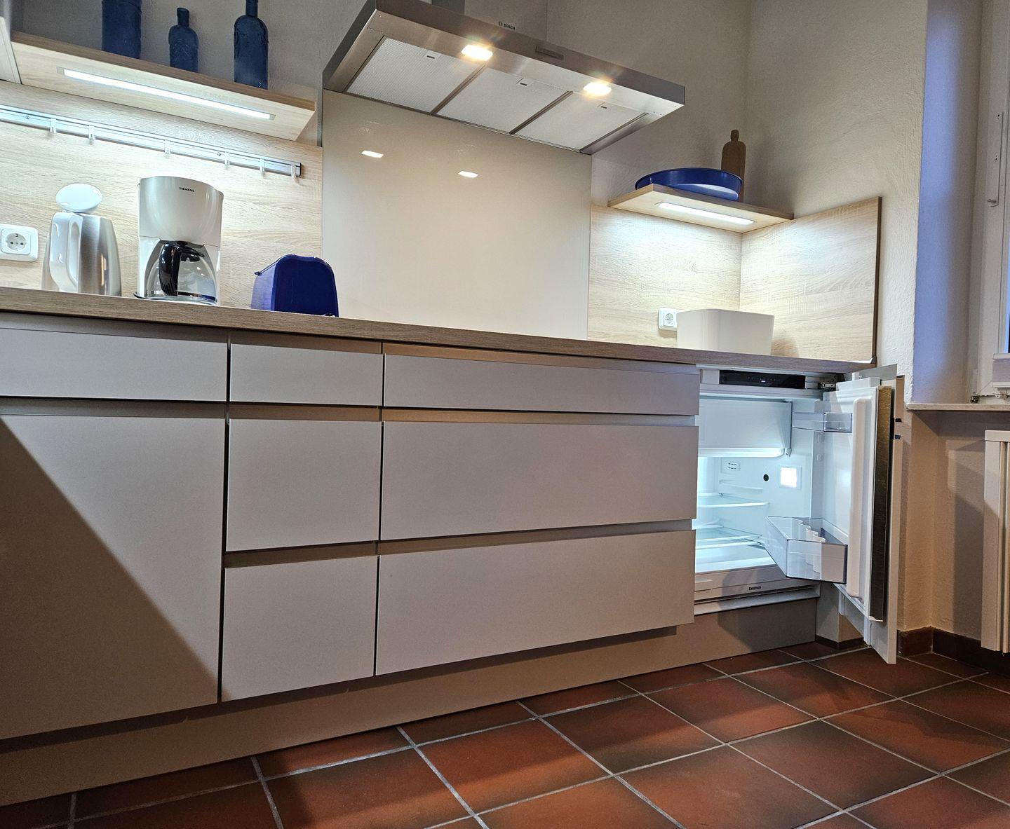 Die gemütliche Erdgeschosswohnung wurde neu renoviert und das zeitgemäße Mobiliar lädt zum Wohlfühlen ein. Das Wohn-/Esszimmer mit einem Esstisch und einem gemütlichen Sofa ist das Zentrum der Wohnung. Ein Flachbildschirm und liebevoll ausgewählte Kunstwerke und Möbelstücke runden das Ambiente ab. Die offene Küche bietet eine Ausstattung mit 4-Platten-Herd, Geschirrspülmaschine, Kühlschrank, Toaster, Wasserkocher und Kaffeemaschine.