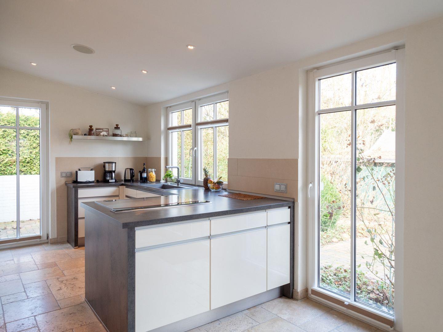 Ein ölimprägnierter Dielenfußboden erstreckt sich durch alle Schlaf- und Wohnräume und verleiht der Wohnung eine warme Atmosphäre. Der Ess-, Küchen- und Arbeitsbereich ist mit einem besonderen Natursteinfußboden und Fußbodenheizung ausgestattet, was zusätzlichen Komfort bietet. Von hier aus gelangen Sie direkt zur meist sonnigen Terrasse und dem herrlichen Garten.