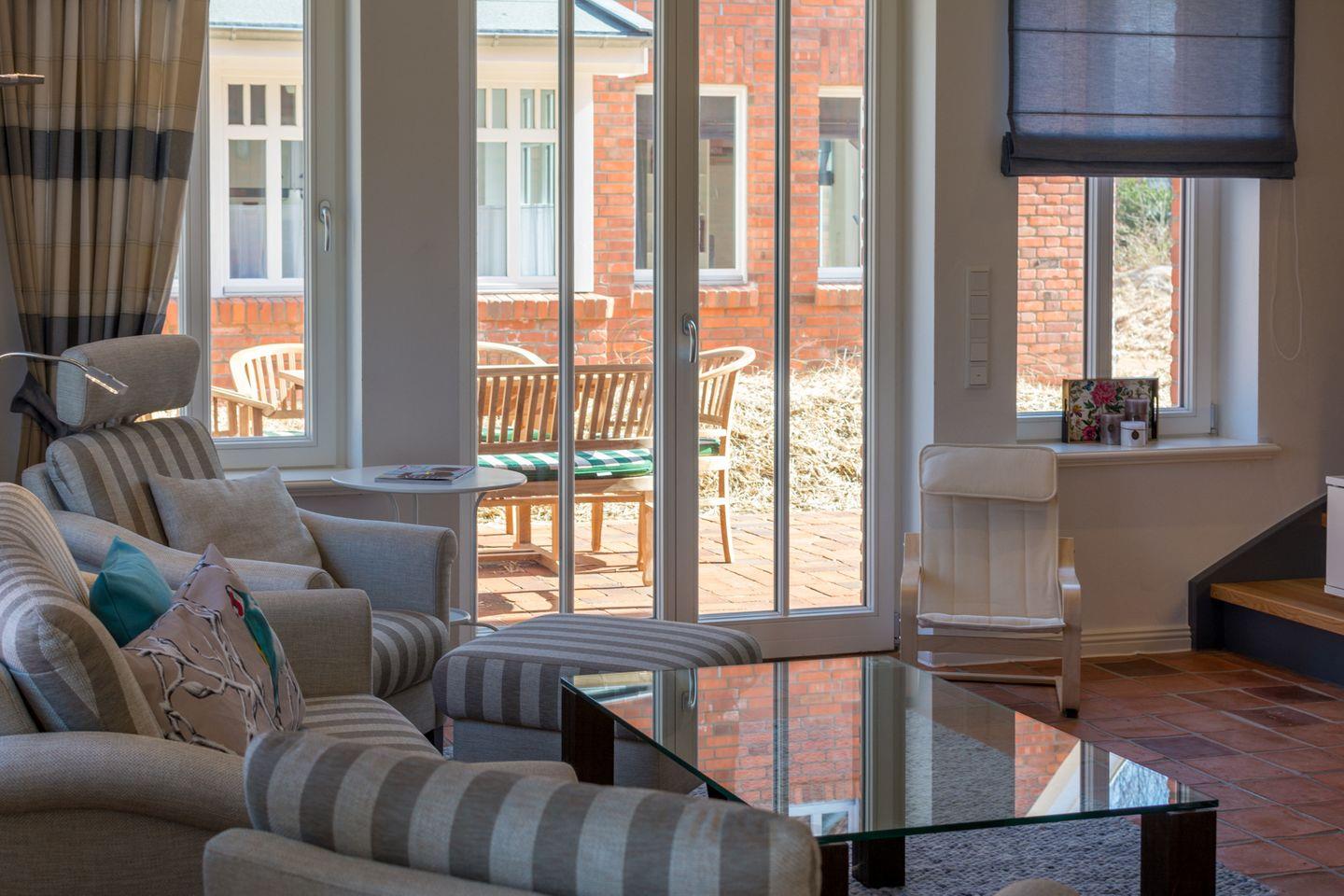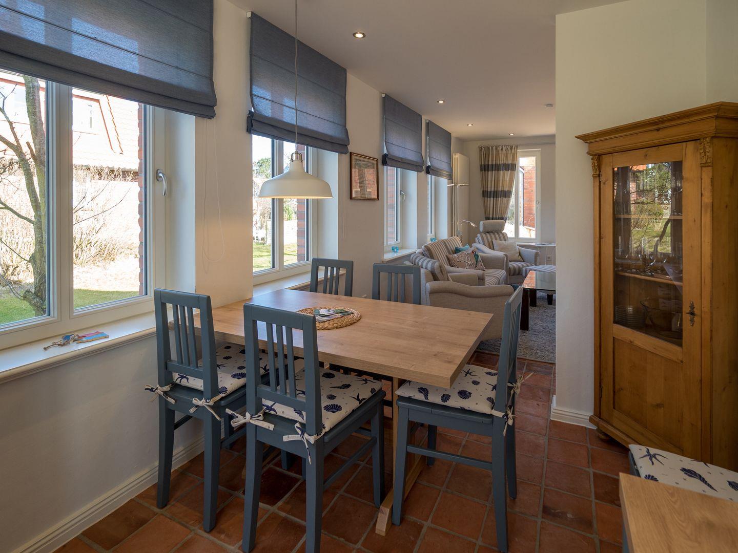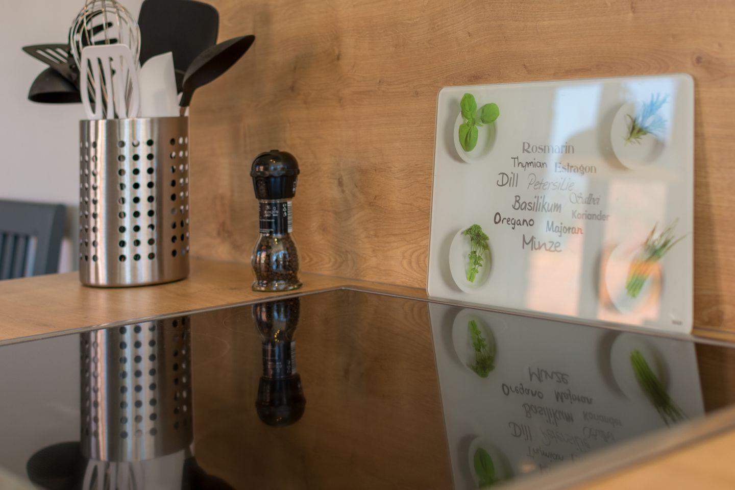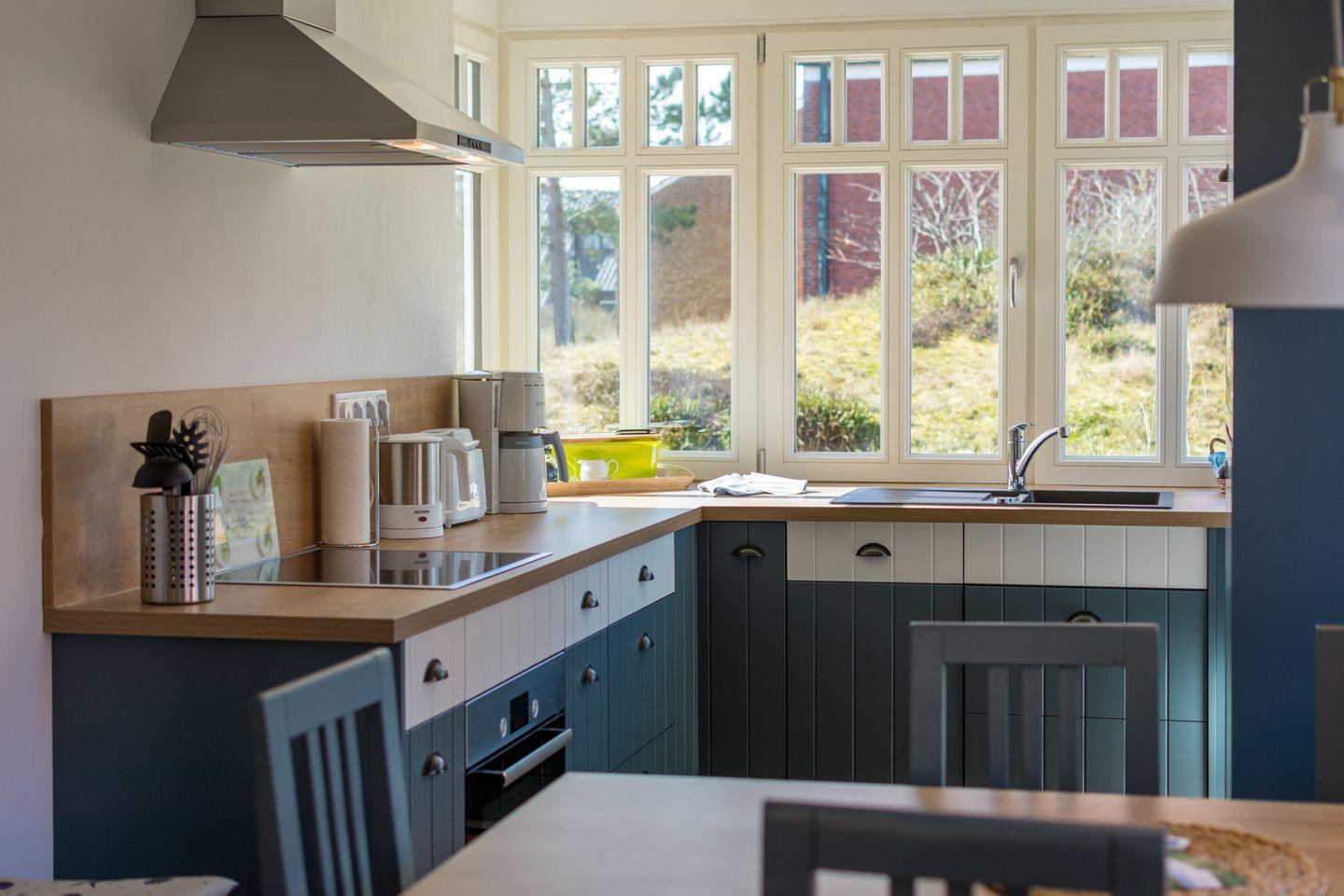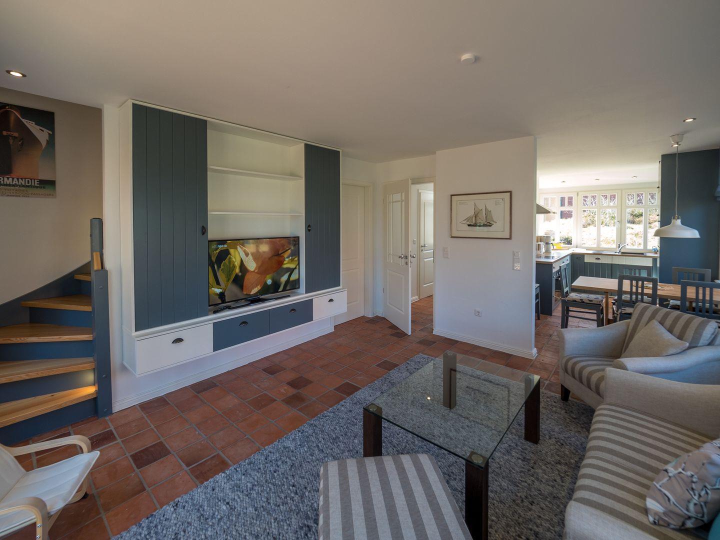 Der helle Wohn-, Ess- und Küchenbereich strahlt stilvolle Gemütlichkeit aus. Die hochwertige Küche mit Ceranfeld, Backofen, Mikrowelle, Spülmaschine, Kaffeemaschine und reichlich Geschirr und Besteck bietet allen Komfort. Wlan, HD-Flachbildschirm und Musikanlage stehen bereit. Neben der Haustür befindet sich eine Toilette mit Duschbad.