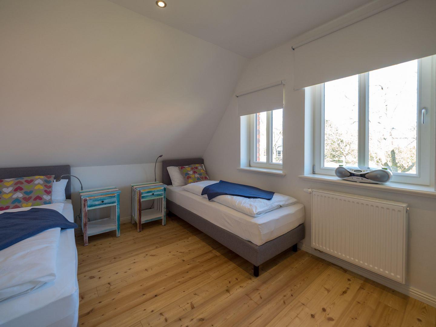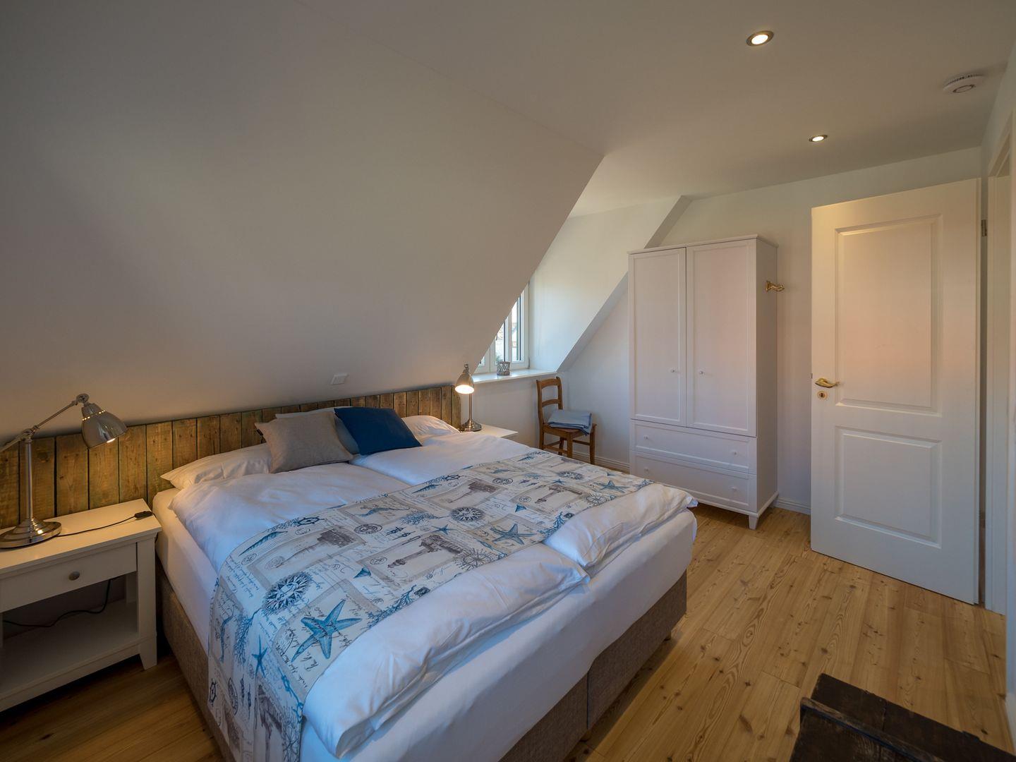 Die beiden Schlafzimmer im Obergeschoss sind mit 4 Luxus Boxspringbetten (ein Doppel, zwei Einzel) ausgestattet. 2 Zusatzbetten, sowie Kinderbetten sind möglich. Ein Bad mit Dusche ist ebenfalls vorhanden.