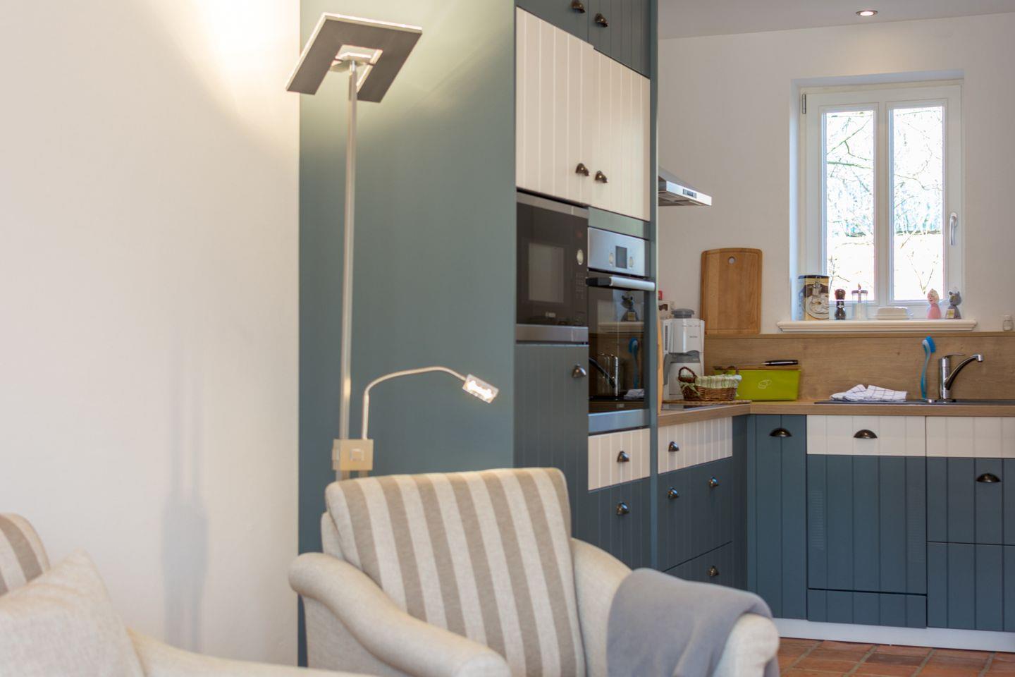 Der helle Wohn-, Ess- und Küchenbereich strahlt stilvolle Gemütlichkeit aus. Die hochwertige Küche mit Ceranfeld, Backofen, Mikrowelle, Spülmaschine, Kaffeemaschine und reichlich Geschirr und Besteck bietet allen Komfort. Wlan, HD-Flachbildschirm und Musikanlage stehen bereit. Der Elektrokamin mit Flammen- und Raucheffekt zaubert Atmosphäre und Gemütlichkeit eines echten Feuers. Neben der Haustür befindet sich eine Toilette mit Duschbad.