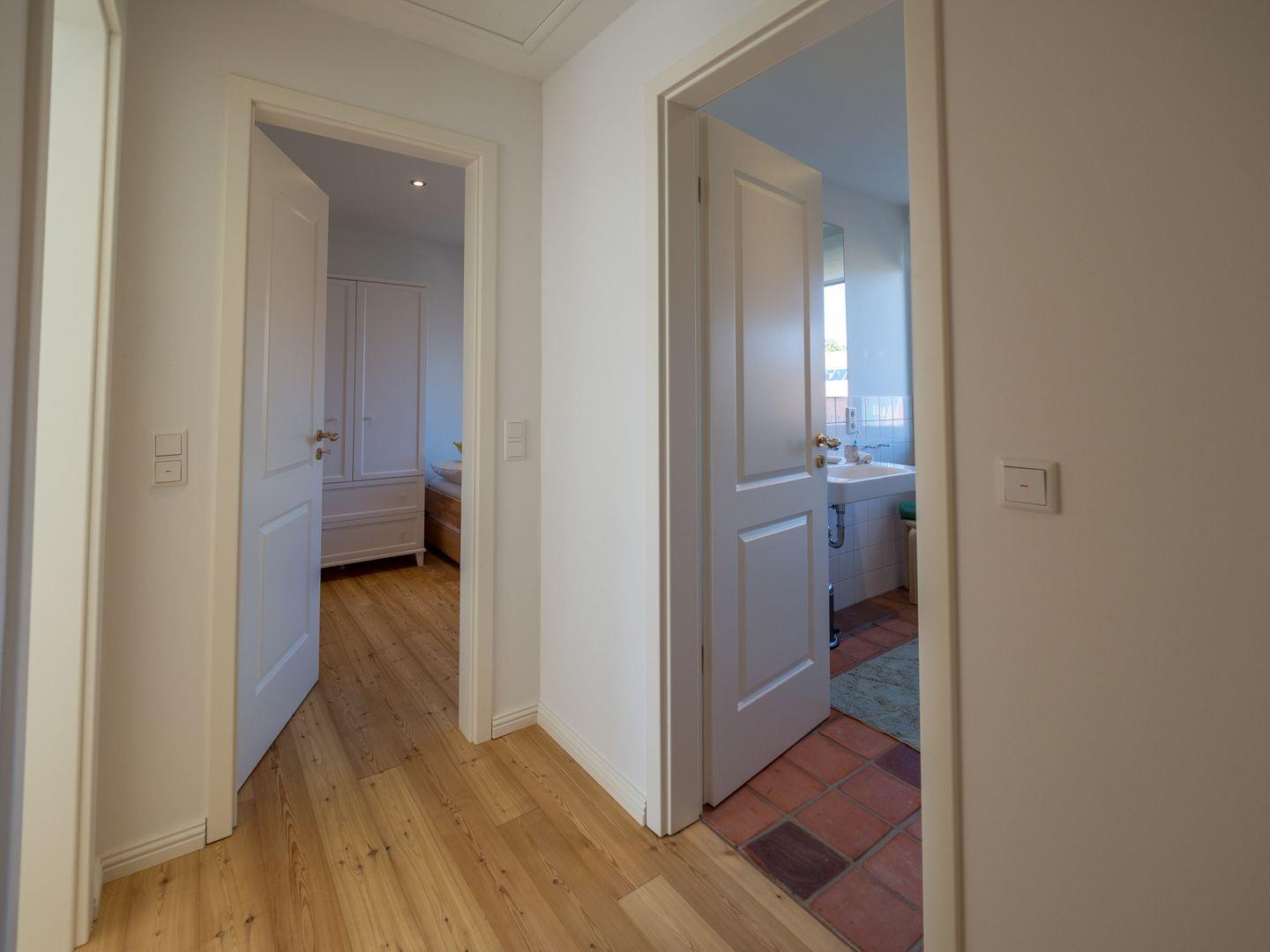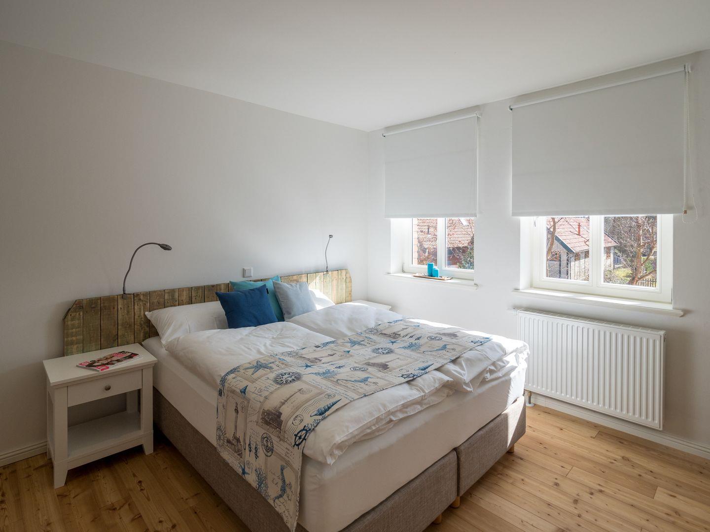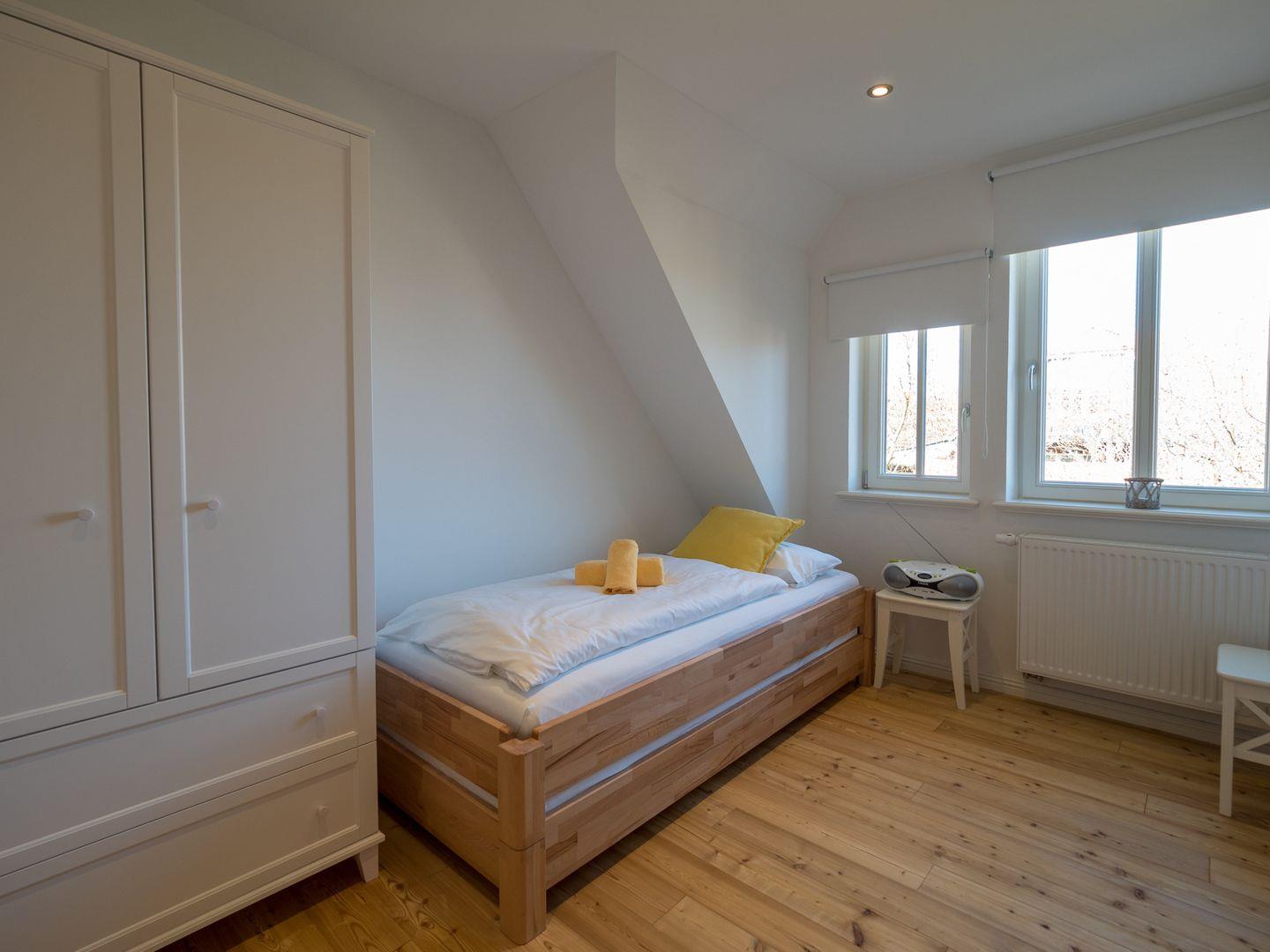 Die beiden Schlafzimmer im Obergeschoss sind mit 2 Luxus Boxspringbetten (Doppelbett) und 2 – 3 weiteren Stapelbetten ausgestattet. Weitere Reisebetten für Kleinkinder sind möglich. Ein Bad mit Dusche ist ebenfalls vorhanden.