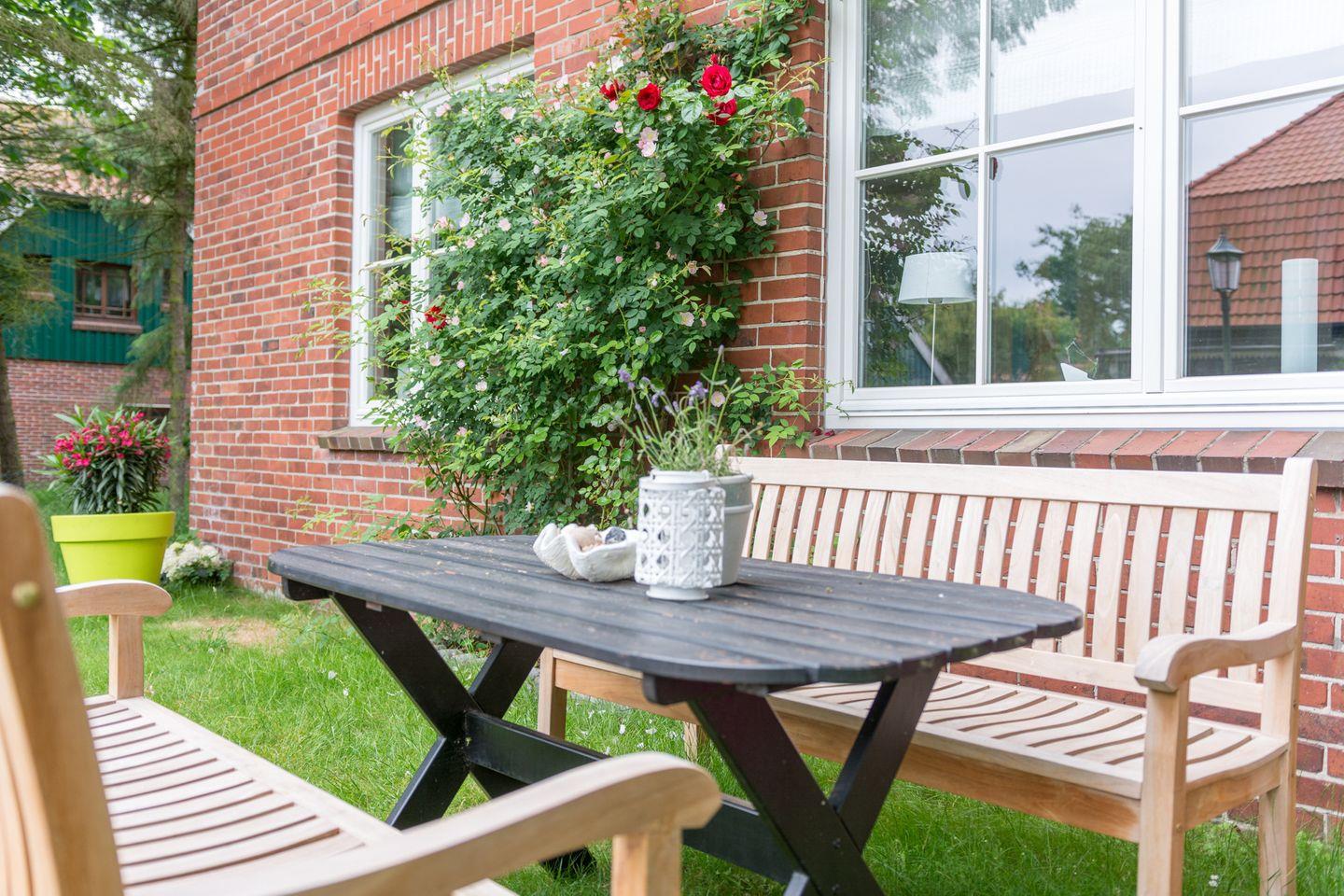 Genießen Sie die sonnigen Tage auf der großen Terrasse, ausgestattet mit zwei bequemen Strandkörben. Hier können Sie die Seele baumeln lassen, während Sie die warmen Sonnenstrahlen auf Ihrer Haut spüren.