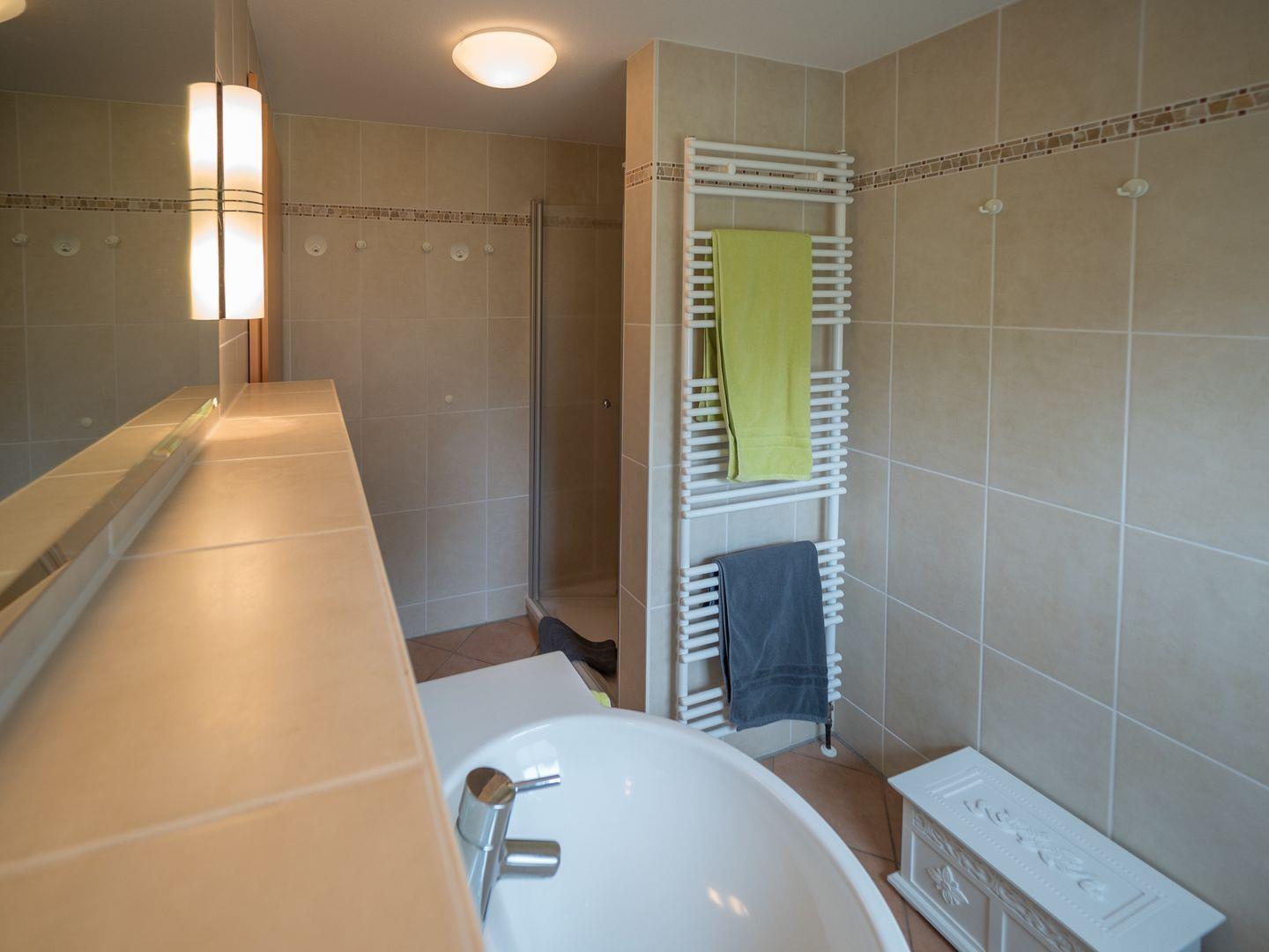 Im Erdgeschoss erwartet Sie ein großzügiger Wohn- und Küchenbereich, der zum gemeinsamen Kochen und Essen einlädt. Ein großer Esstisch bietet genügend Platz für gesellige Mahlzeiten und Spieleabende. Zudem finden Sie im Erdgeschoss zwei moderne Duschbäder sowie ein Schlafzimmer mit einem komfortablen Doppelbett.