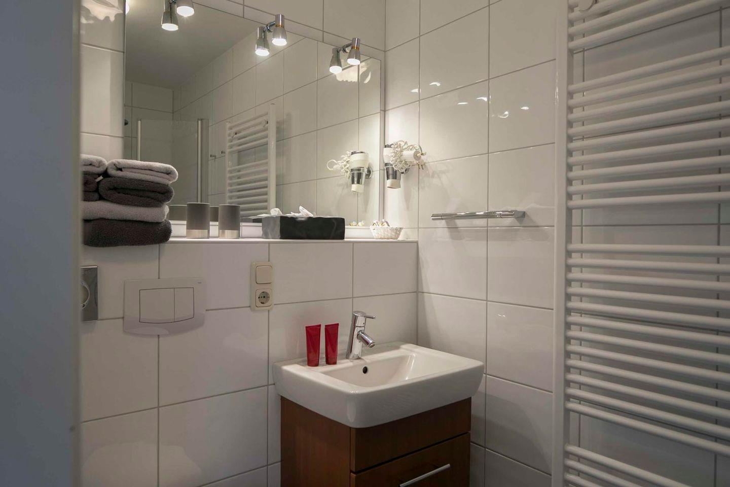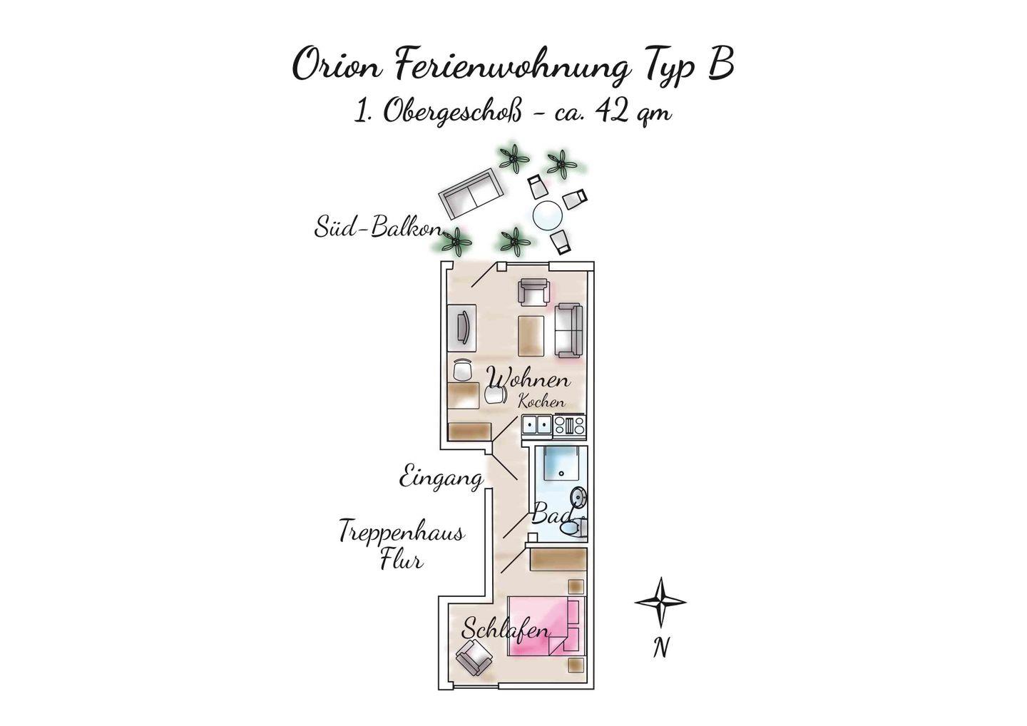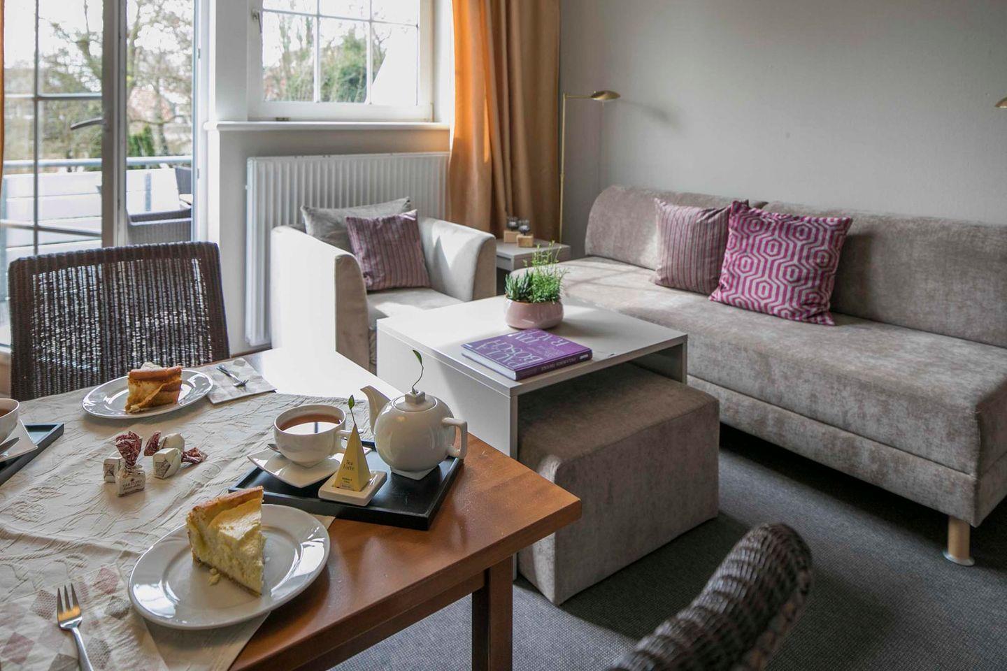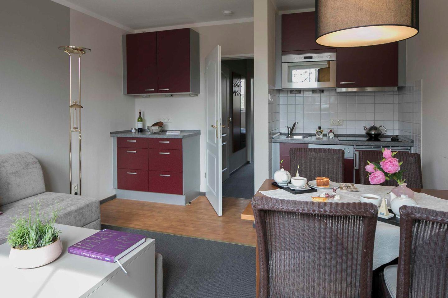 Auf etwa 42 m² bietet die Wohnung einen separaten Schlafraum mit bequemen Boxspringbett. Der Wohn- und Essraum verfügt über eine hochwertige Sofaliege, die abends ohne Umbauen in ein komfortables Bett mit Hotelqualität umgewandelt werden kann. Zusätzlich gibt es eine neue Küchenzeile, einen kleinen Flur mit Garderobe und ein Badezimmer mit Dusche (sehr flacher Einstieg). Der Südbalkon lädt mit seinem schönen Blick in den Garten zum Verweilen ein.