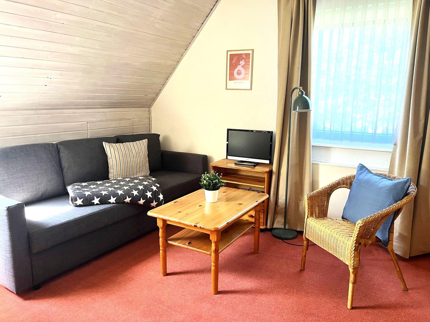 Wohn- Schlafraum mit Essplatz, Sessel, Couchtisch und Schlafcouch