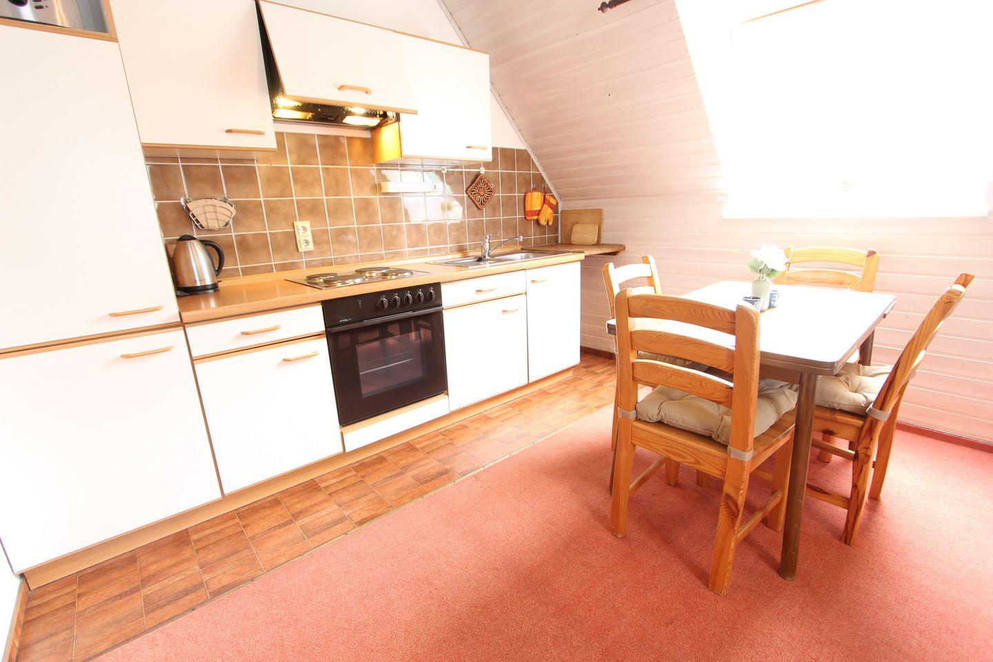 Appartement im Dachgeschoss, für 2-4 Personen, Küchenzeile mit Kochherd, Backofen, Kühlschrank, Kaffeemaschine und einem kompletten Koch- und Essgeschirr