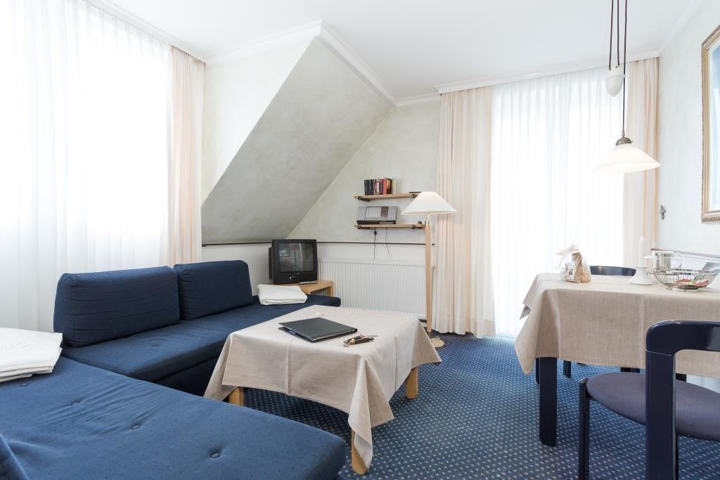 Die Wohnung befindet sich im ersten Stock und erstreckt sich über 34 m², optimal gestaltet für maximal zwei Personen. Sie bietet ein Schlafzimmer mit einem gemütlichen Bett. Der offene Wohn- und Essbereich verfügt über eine Sofaecke, einen Esstisch sowie einen modernen Fernseher.