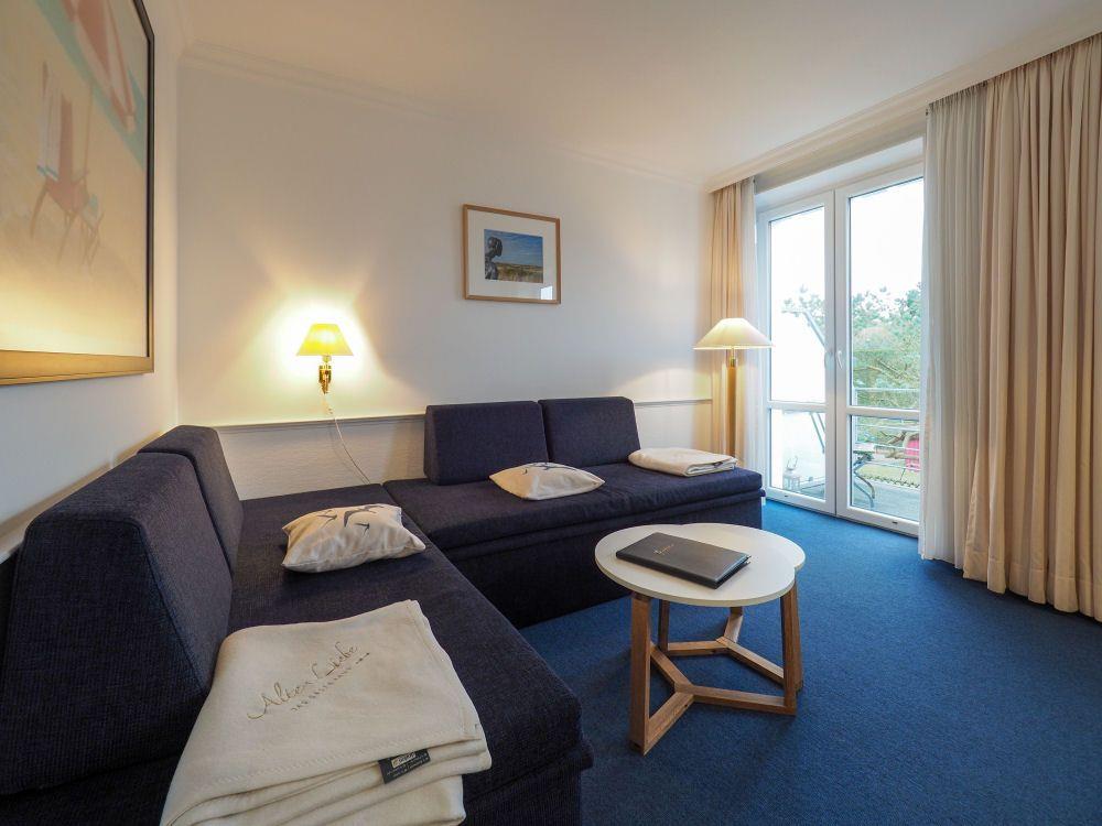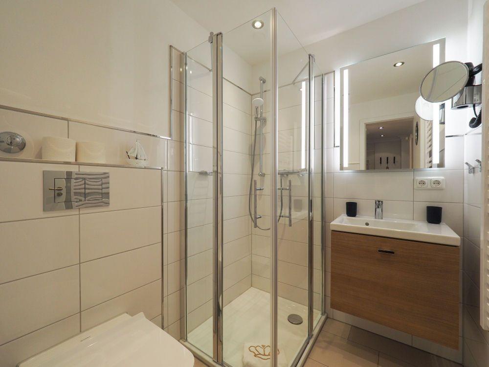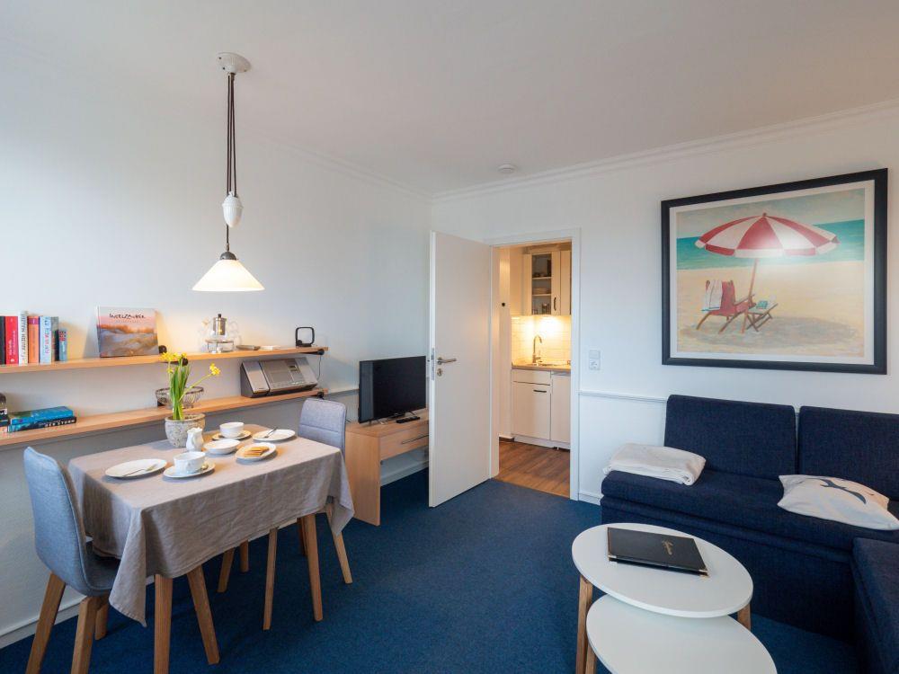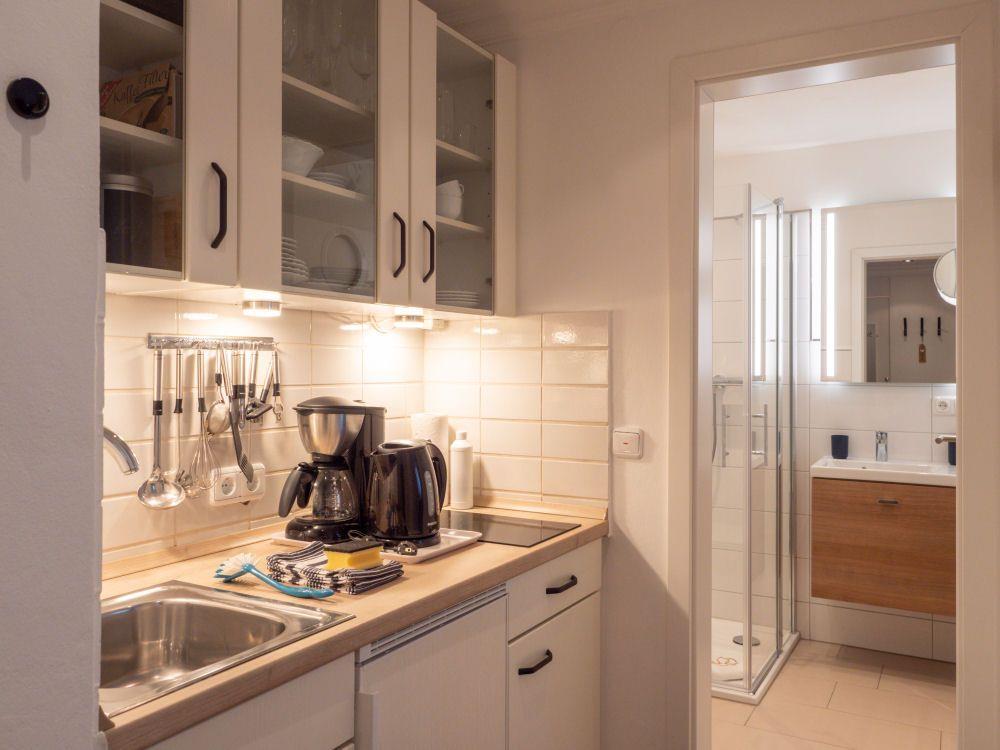 Ferienwohnung "Kleine Auszeit" für 1-2 Personen im 1. OG, ca. 32 m², mit Balkon und großzügiger Gemeinschaftsterrasse, 1 Schlafzimmer (1 Doppelbett), 1 Wohnraum mit Kabel-LED-TV, HiFi-Anlage, WLAN, Einbauküchenzeile mit Ceranfeld, Kaffeemaschine, Wasserkocher und Toaster; neues Bad mit Dusche, Waschtisch und WC ( Fön und Kosmetikspiegel vorhanden); Bettwäsche, Handtücher, Balkon; Waschmaschine und Trockner, IR-Sauna gegen Münzen im hauseigenen Fitnessraum verfügbar. 300 m zum Strand