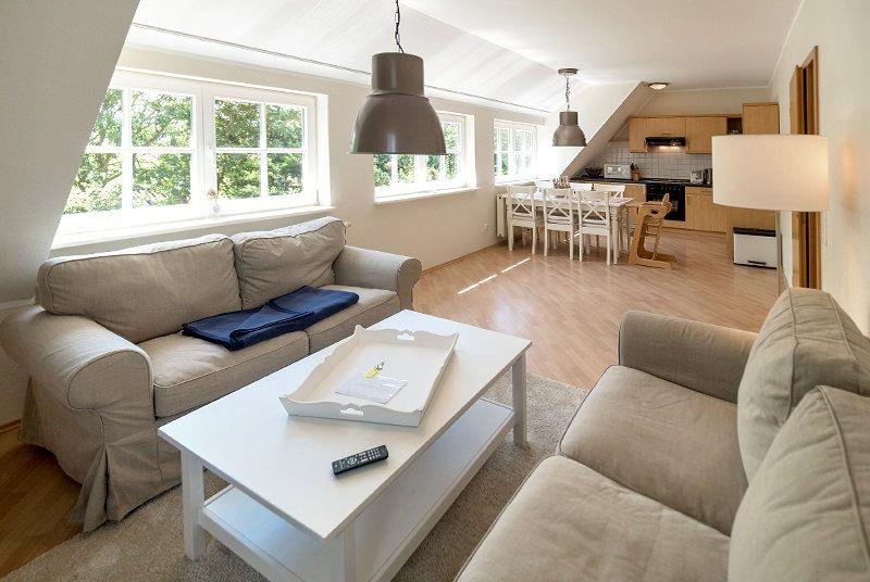 Unsere hell und freundlich eingerichtete "Ferienwohnung 7" im Obergeschoss für max. 4 Personen hat eine Wohnfläche von ca. 80 m² und erstreckt sich über zwei Etagen. Sie verfügt über 2 Schlafzimmer, 1 Wohnzimmer mit Küche und 1 Bad. Auf Wunsch können wir Ihnen einen Kinderhochstuhl sowie ein Kinderreisebett zur Verfügung stellen.