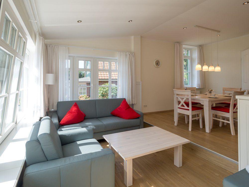 Wunderschöne EG-Wohnung "Bosse" im Haus Bullerbü für bis zu 4 Personen: Ca. 60 m² mit inseltypischer Veranda, großer Wohnbereich-Essbereich im nordischen Stil eingerichtet, zwei Schlafzimmer, ein Tageslichtbad mit Dusche und WC. Die Küche ist ausgestattet mit Herd, Backofen, Mikrowelle, Kühlschrank und Spülmaschine.