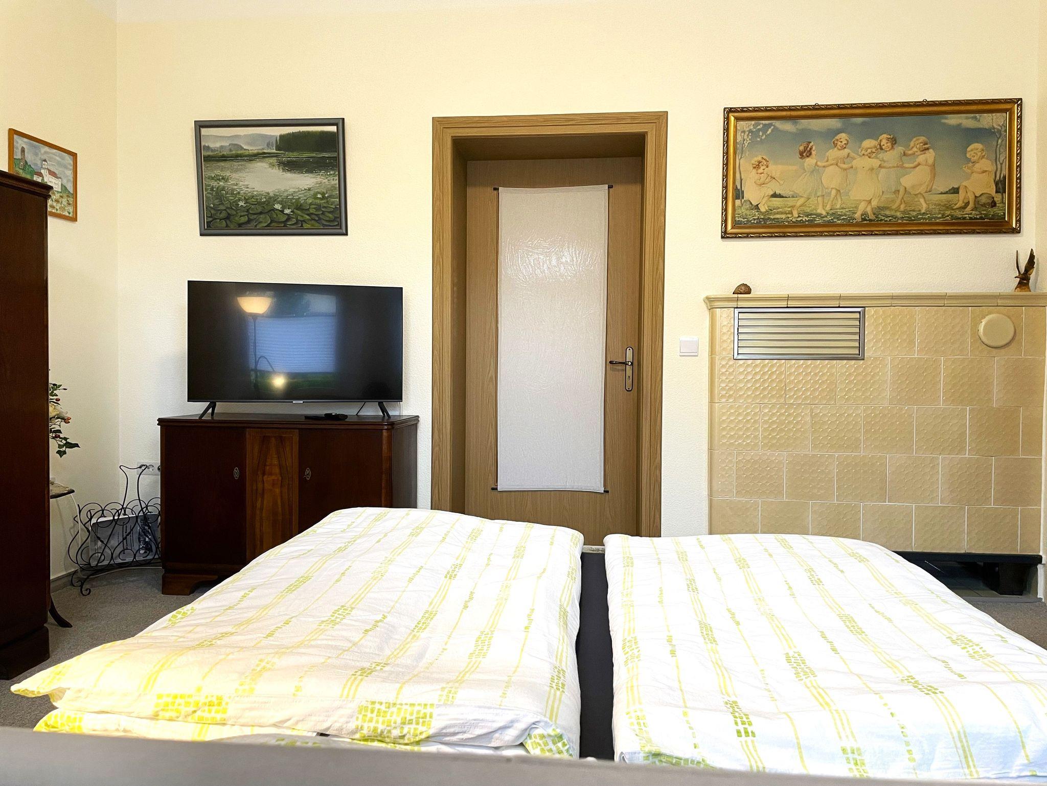 Die 90 m² große Nichtraucher-Ferienwohnung verfügt über ein großes Wohnzimmer. Hier können die Gäste gemütlich beisammen sitzen oder entspannt ihre Lieblingssendungen auf dem großen Flachbildfernseher anschauen. In diesem Raum befindet sich auch ein Schreibtisch, der an vergangene Zeiten des Hauses erinnert.