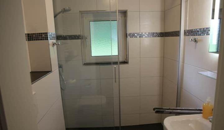 Im Bad, ausgestattet mit WC, Waschbecken und Dusche, stehen unseren Gästen ein Haartrockner, Handwaschseife, Toilettenpapier und Kosmetiktücher zur Verfügung.
