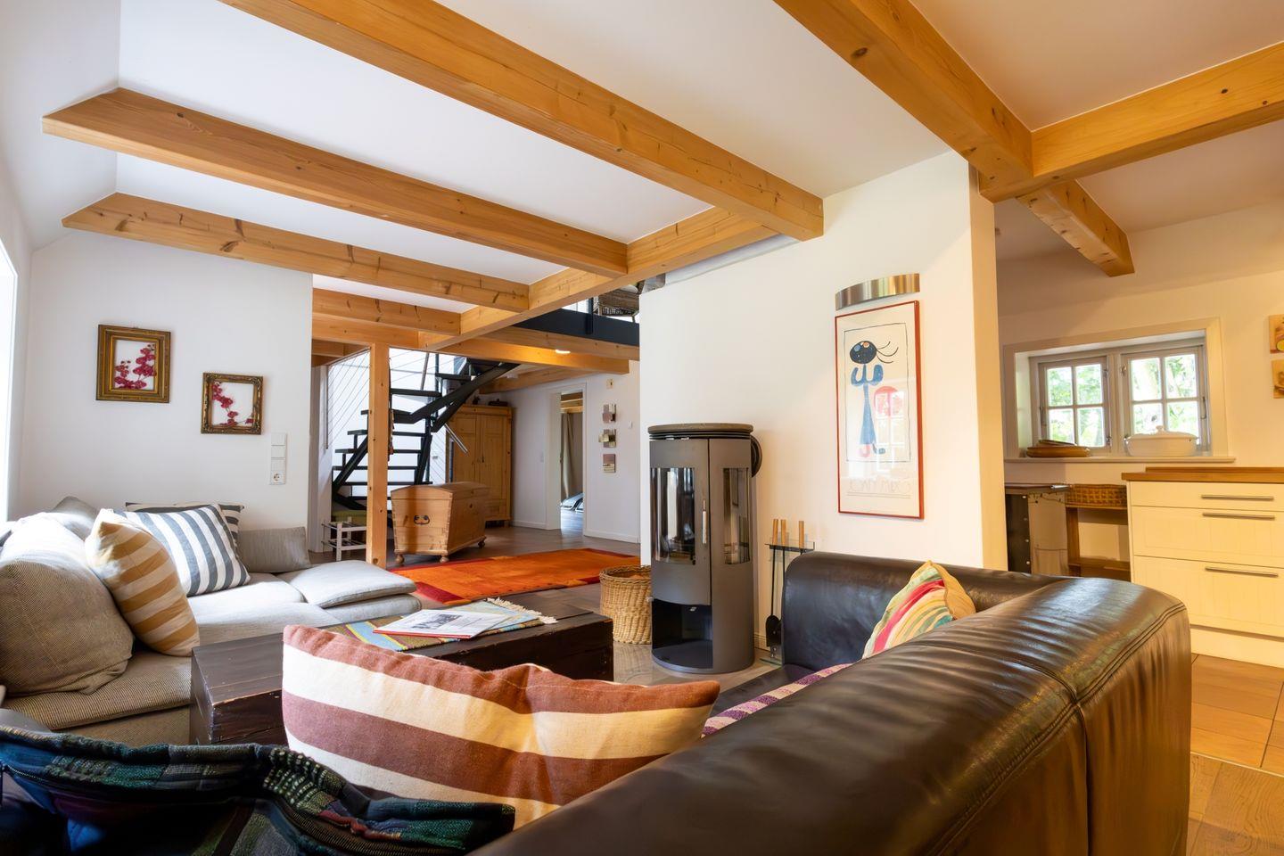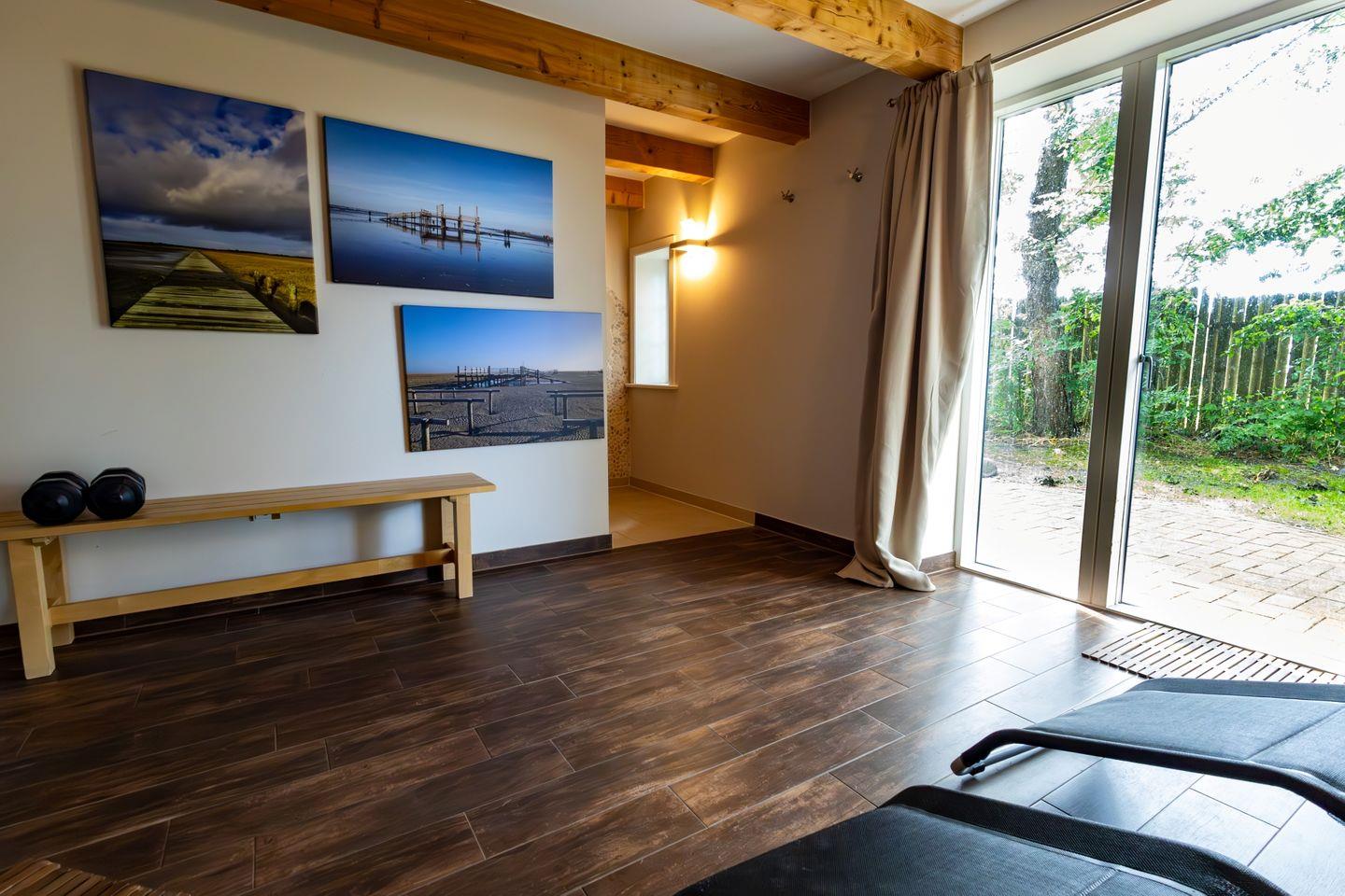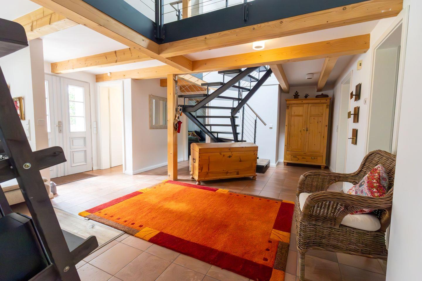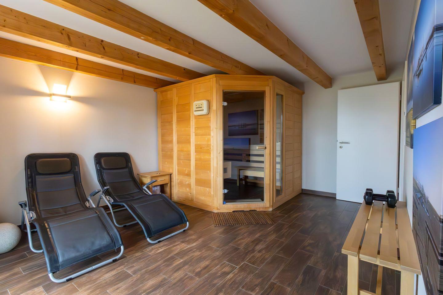 Erdgeschoss: Eingangsbereich, Wohnraum mit offener Küche, Essbereich und Kamin, ein zusätzliches TV-Zimmer mit Unterhaltungselektronik, ein Ruheraum mit Sauna, Dusche und Zugang zur Terrasse, ein Gäste-WC, ein Hauswirtschaftsraum