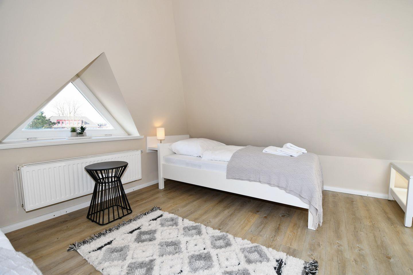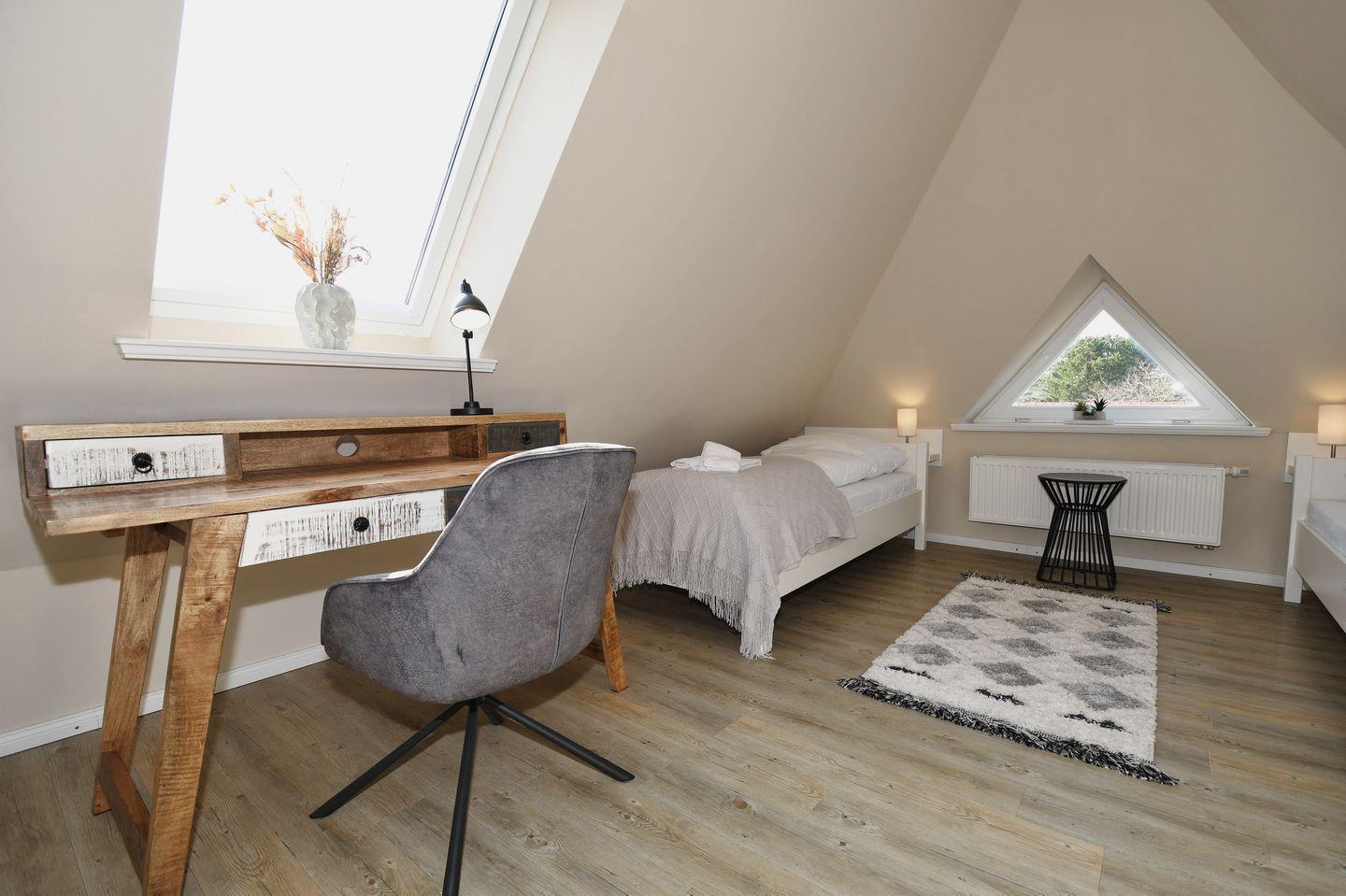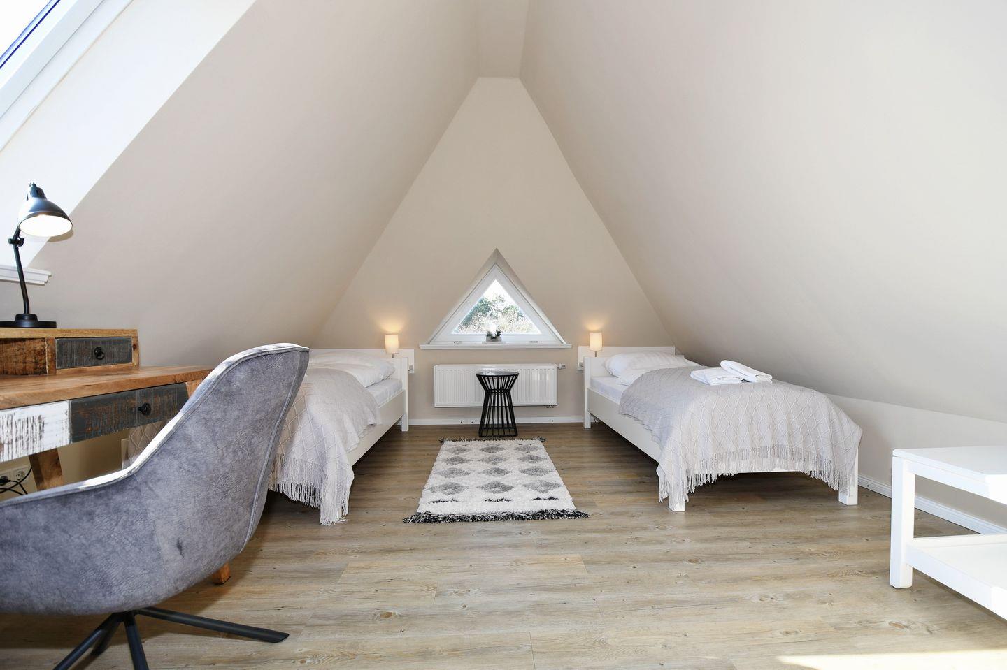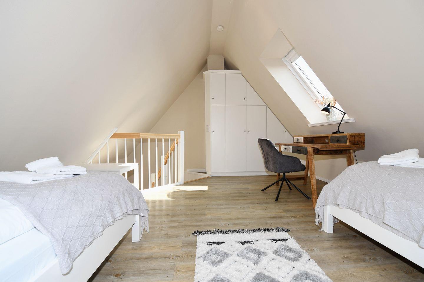 Dachgeschoss: ein offener Bereich mit 2 Einzelbetten (je 90 x 180 cm) und einen Schreibtisch