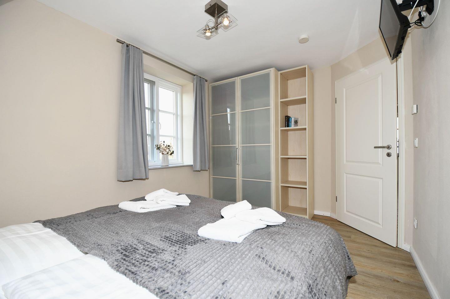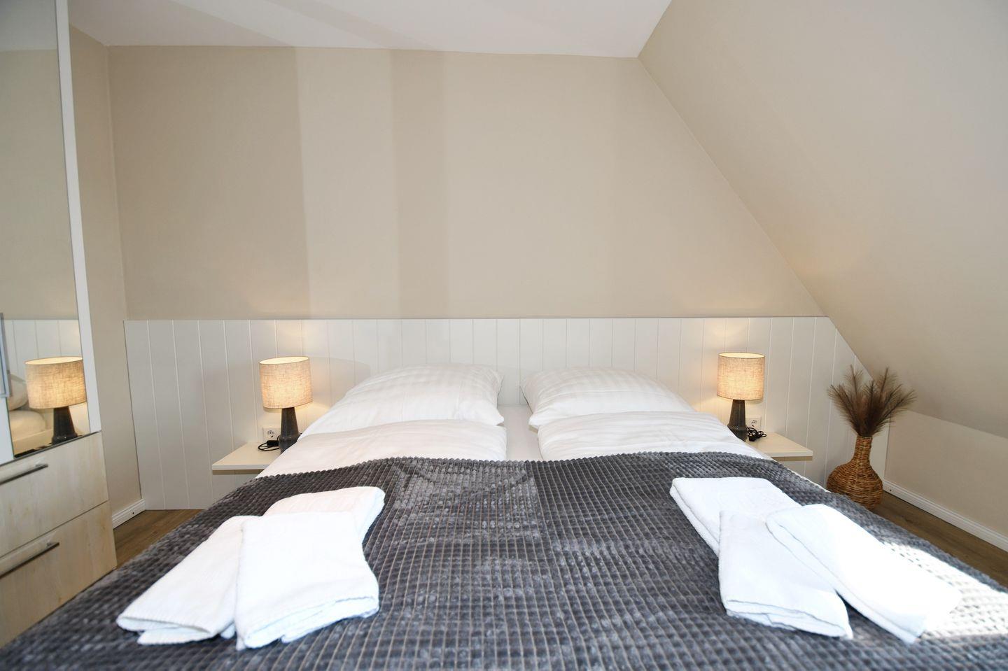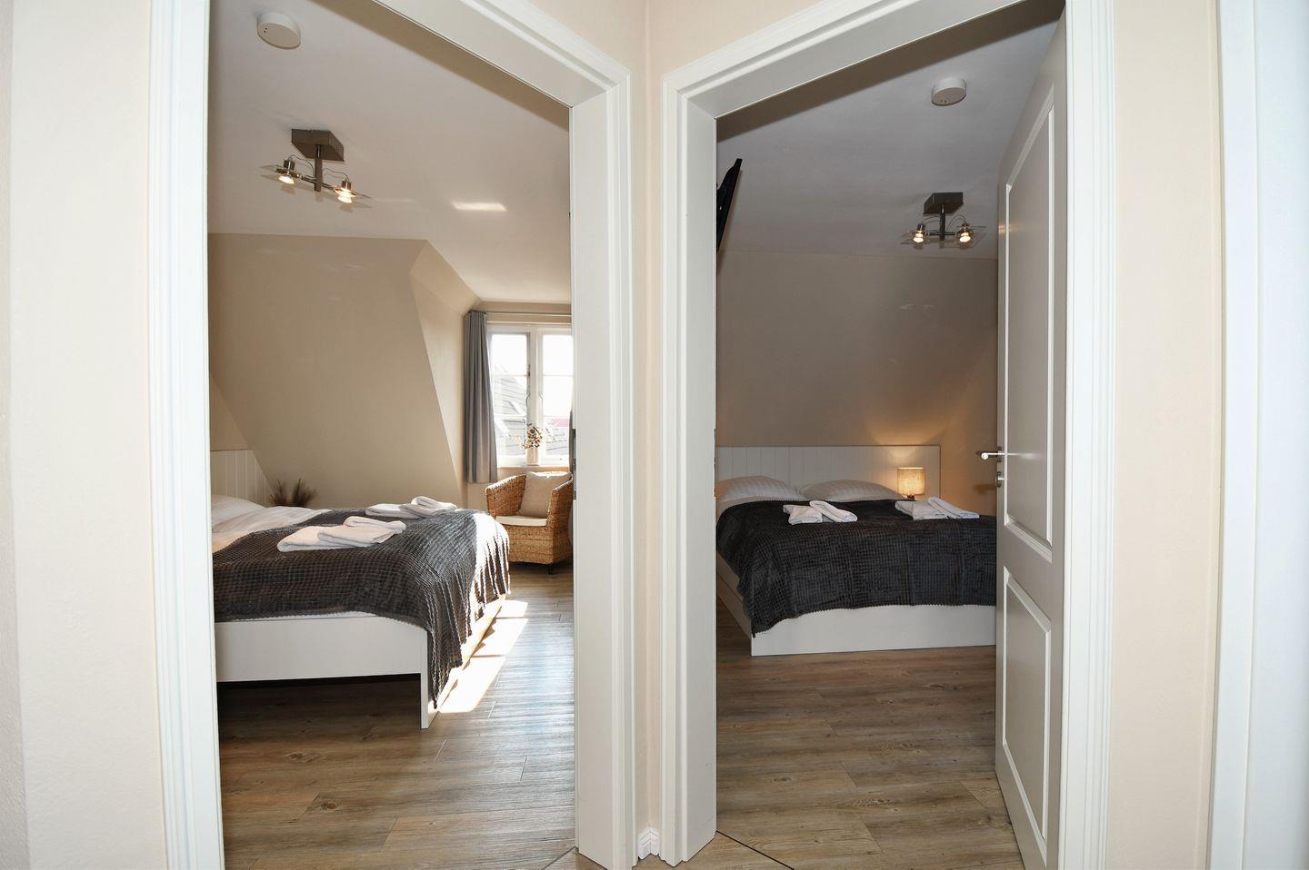 Die Schlafzimmer im Obergeschoss bieten Verdunklungsmöglichkeiten und verfügen beide über ein TV-Gerät.