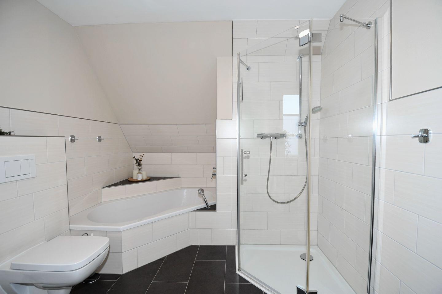 Obergeschoss: 2 Schlafzimmer mit Doppelbett (je 180 x 200 cm - Einzelmatratzen), ein Wannenbad / WC mit separater Dusche und Doppelwaschtisch, ein Wellnessraum mit Sauna