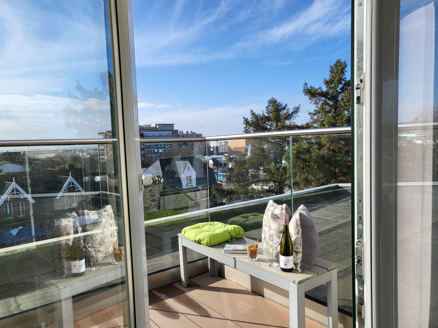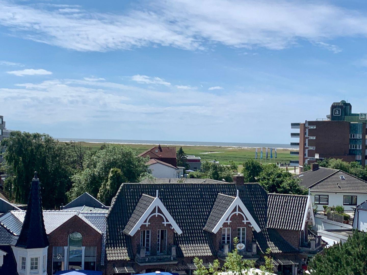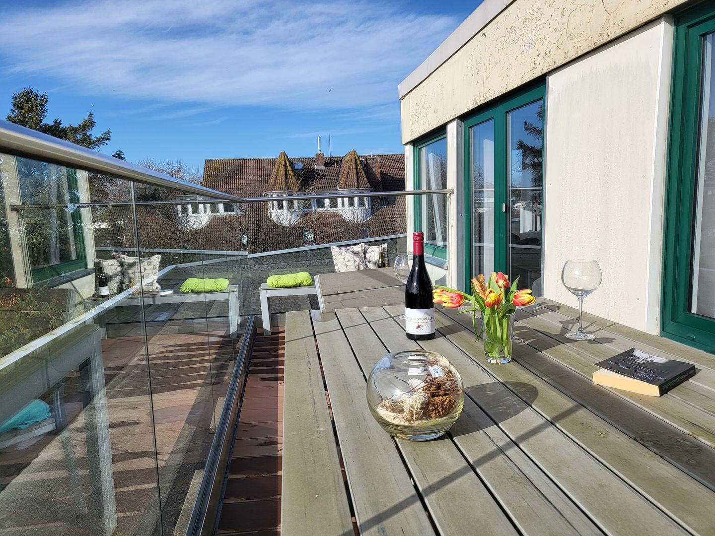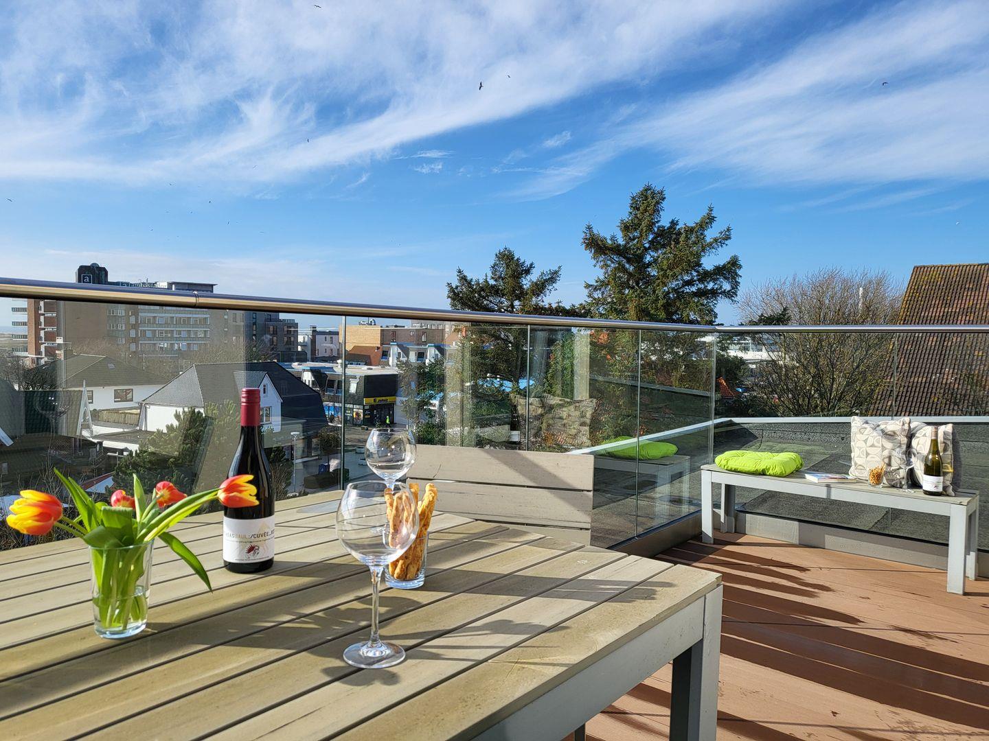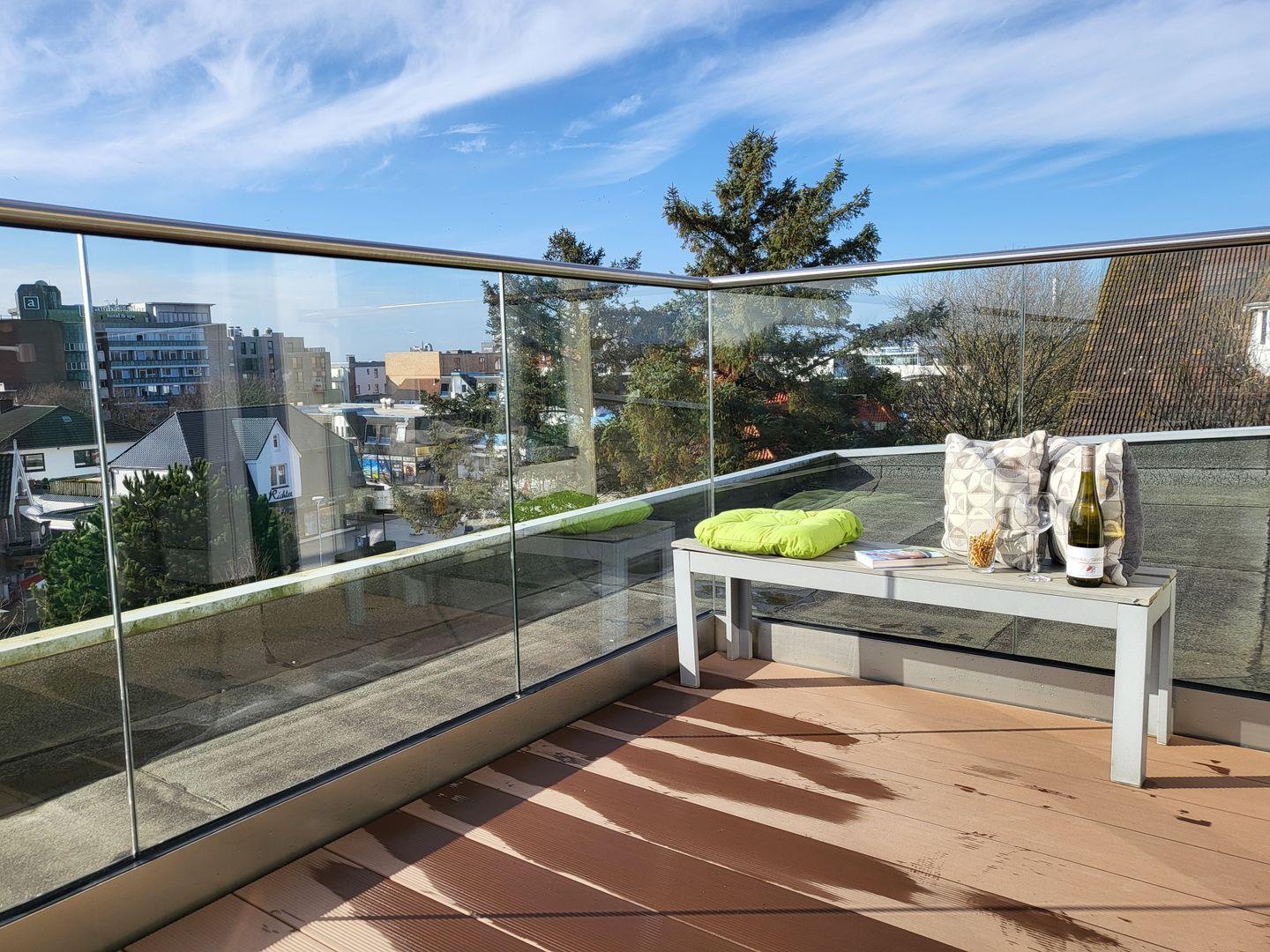 Die im Januar 2024 neu sanierte Dachterrasse lädt mit einem atemberaubenden Ausblick auf die Nordsee zum entspannen ein. Diese Wohnung kann den Fahrstuhl nutzen.