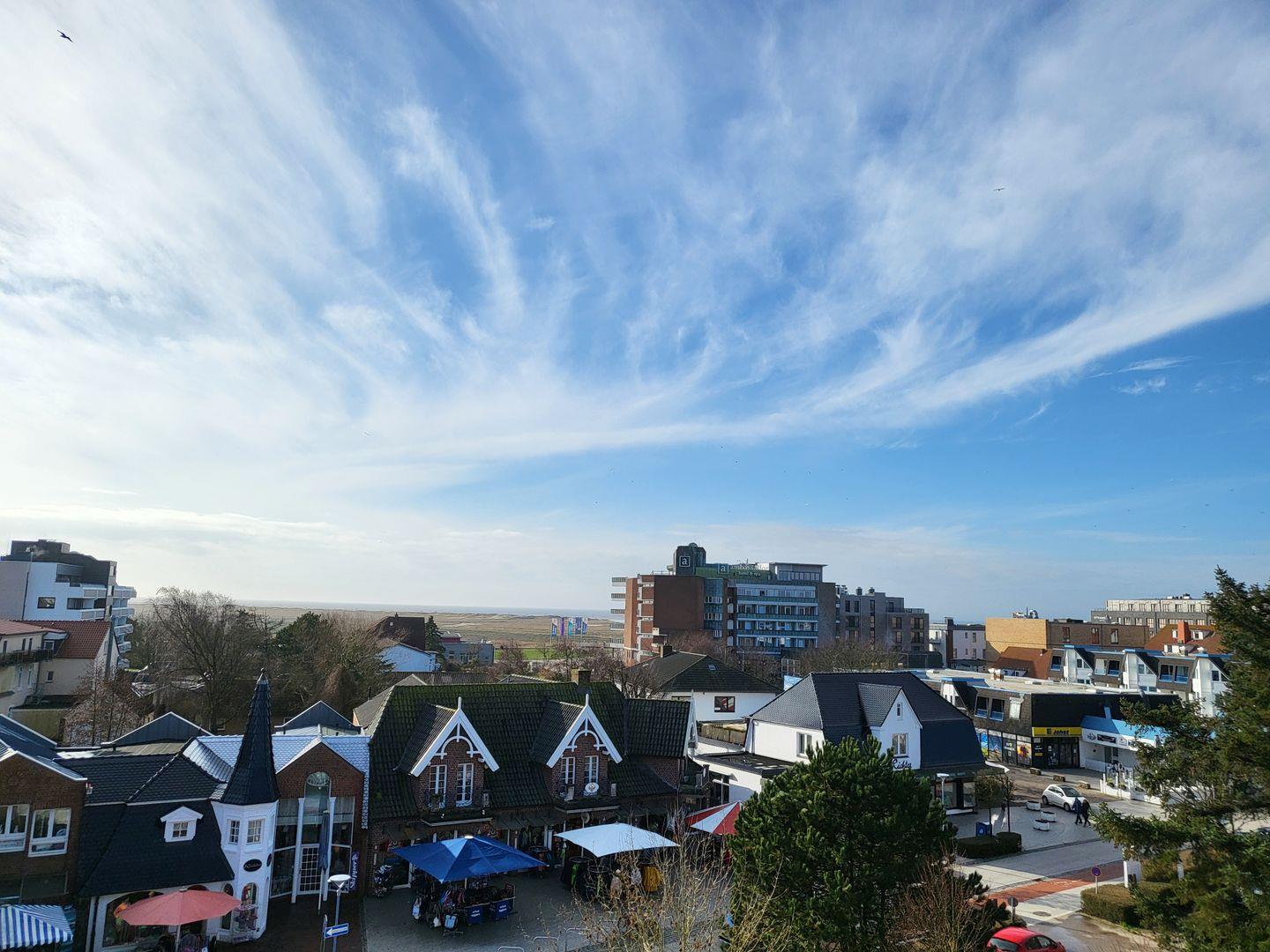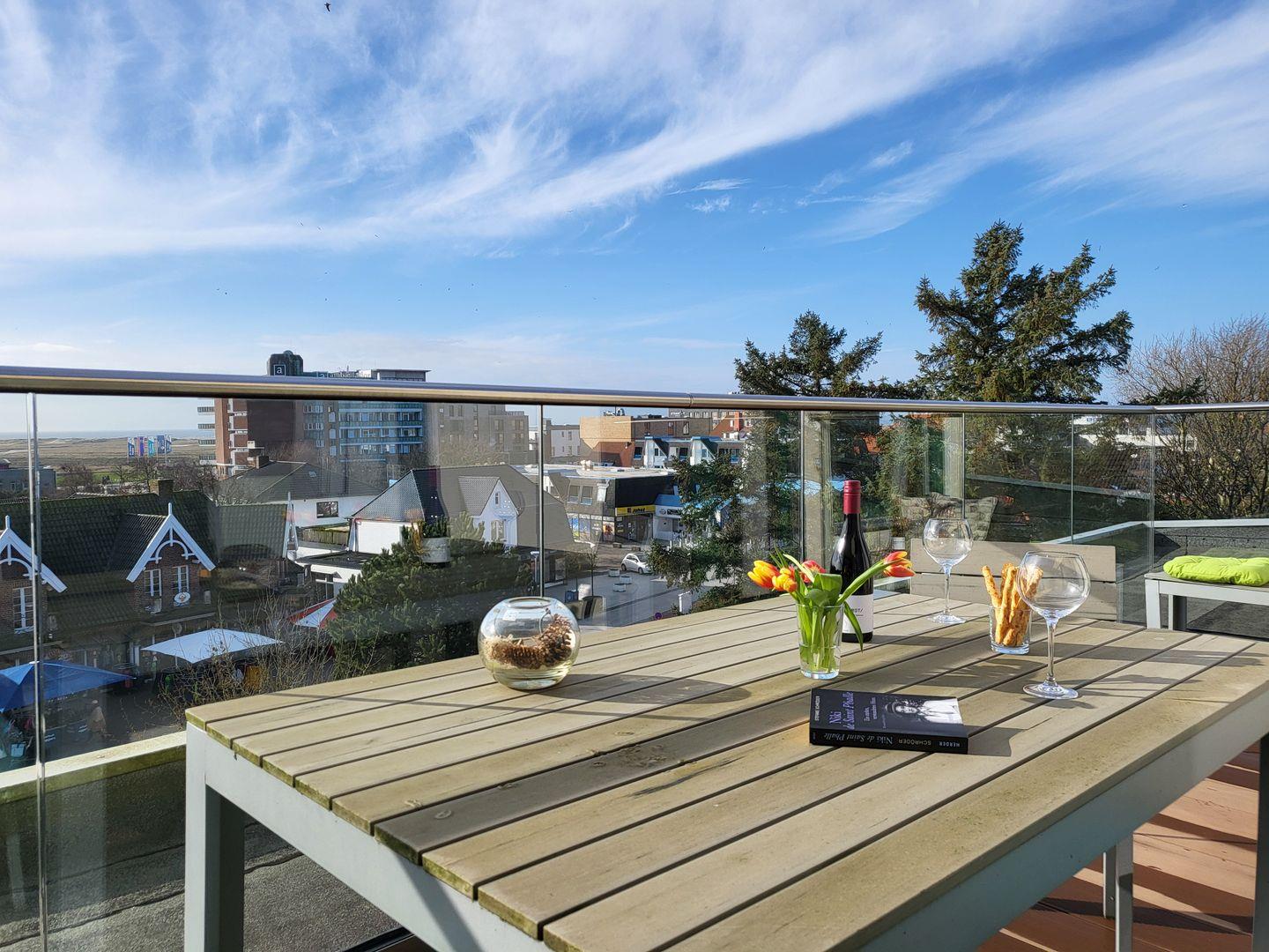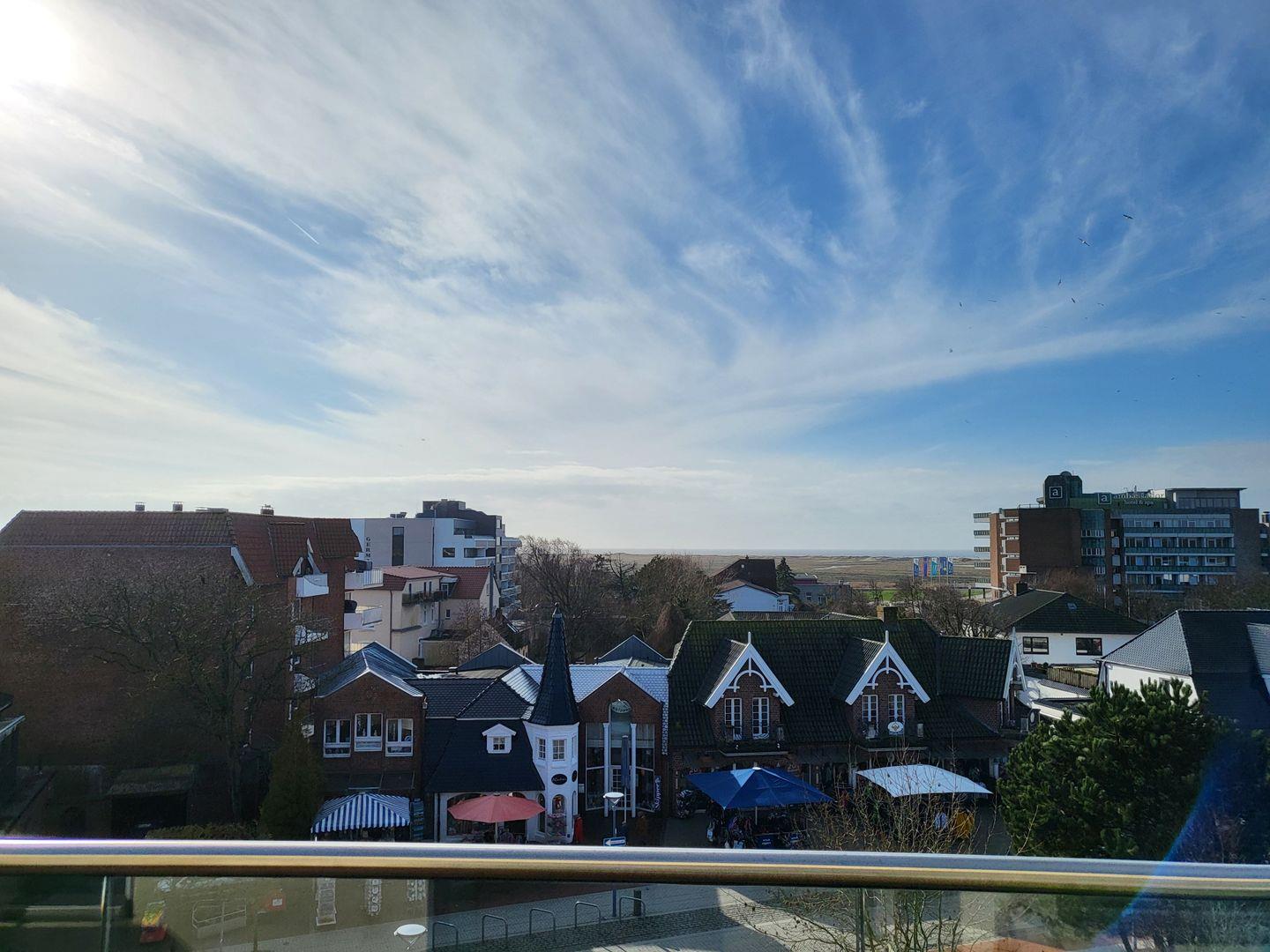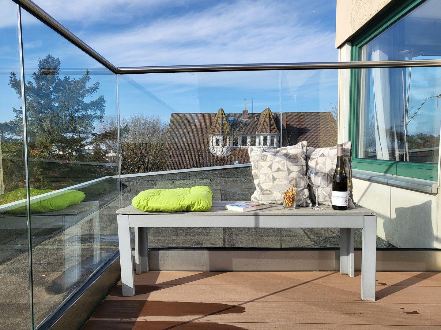 Die im Januar 2024 neu sanierte Dachterrasse lädt mit einem atemberaubenden Ausblick auf die Nordsee zum entspannen ein. Diese Wohnung kann den Fahrstuhl nutzen.