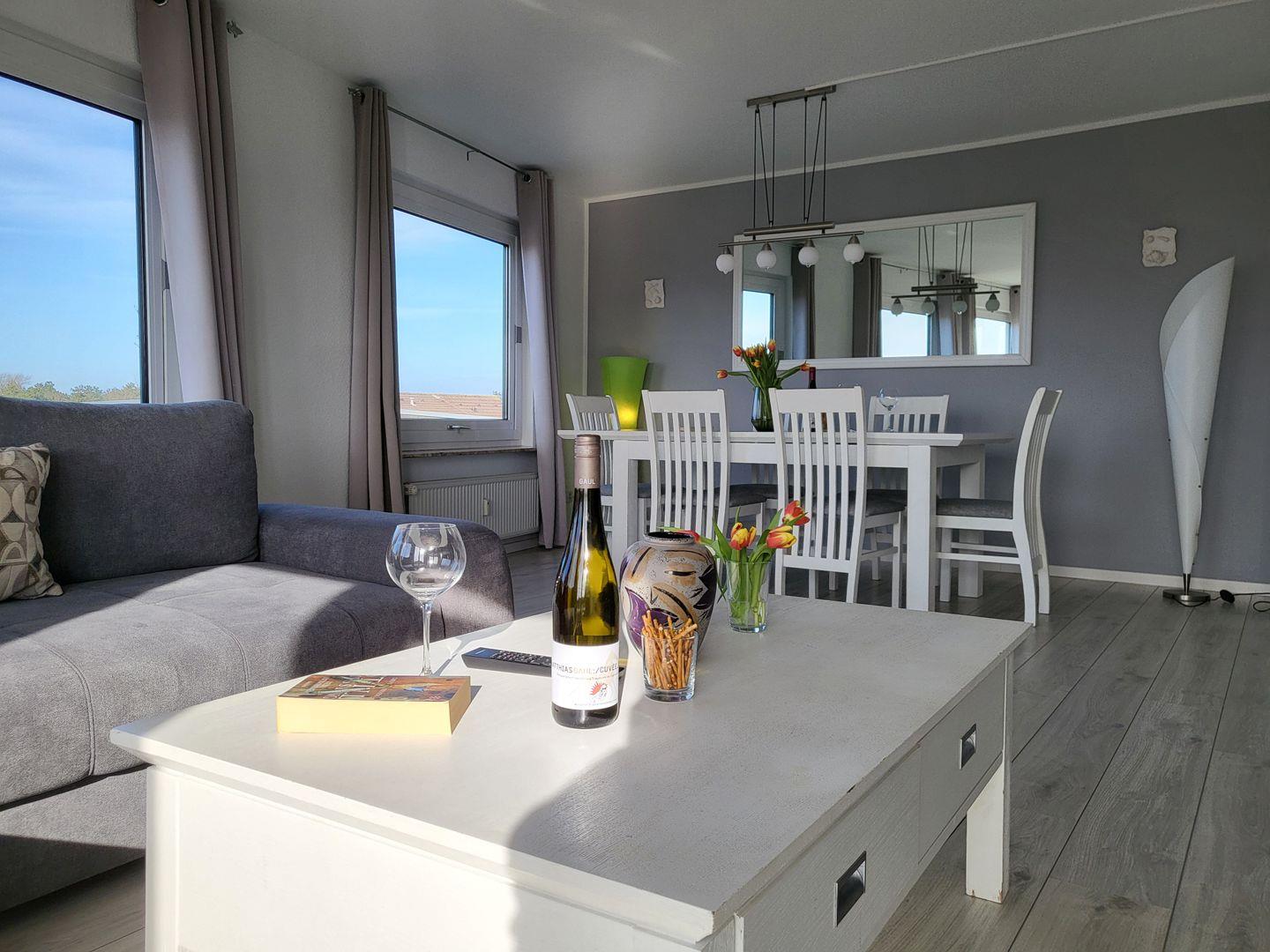 Die großzügige, ca. 70m² große, 3-Zimmer Ferienwohnung für bis zu 4 Personen liegt in der 3. Etage und begeistert mit direktem Seeblick und möbliertem Balkon. Großer Wohnraum mit komfortablem Sofa und Flachbild-TV. Kostenfreies W-LAN sorgt für die multimediale Unterhaltung im Penthouse mit Seeblick. Am Esstisch nehmen bis zu 6 Personen Platz. In den Wohnraum integriert ist die gut ausgestattete Küchenzeile mit Kühlschrank samt Gefrierfach, Kaffeemaschine und Geschirrspüler. Weiterhin sind ein separates Schlafzimmer mit großem Doppelbett sowie ein weiteres Schlafzimmer mit 120cm breiter Schlafcouch vorhanden. Zur Ferienwohnung gehören Duschbad und WC. Ein separates WC ist vorhanden.