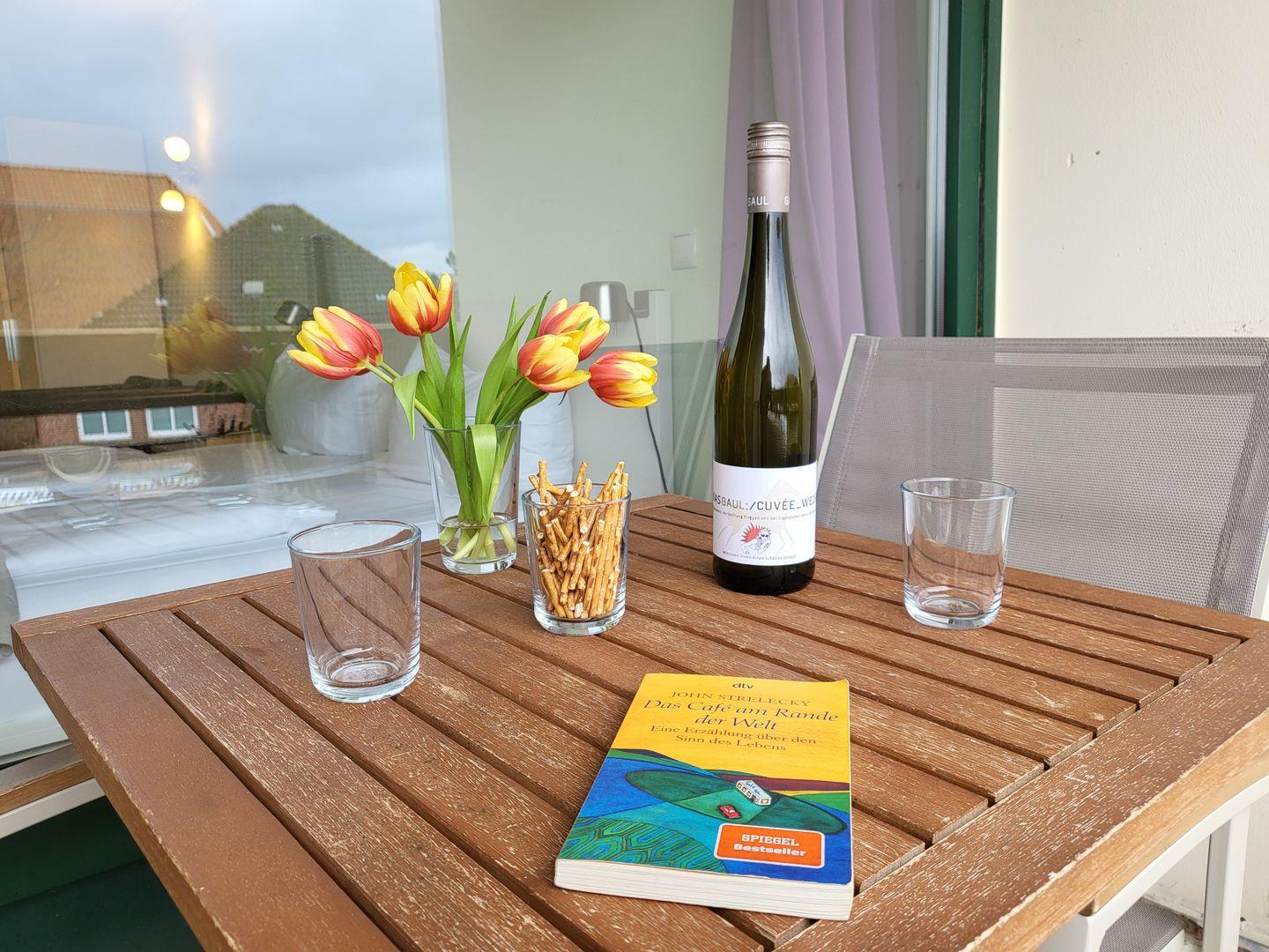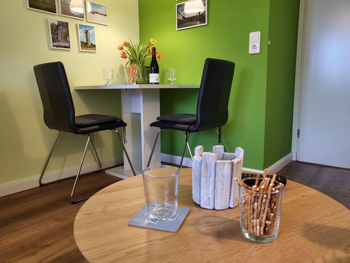 Die moderne, 25m² große Ferienwohnung liegt in der 1. Etage und bietet 2 Personen Platz für einen wunderbaren Urlaub in St. Peter Ording. Der kombinierte Wohn-Schlafraum ist modern und hell eingerichtet. Dort befinden sich neben dem großzügigen Doppelbett noch eine Sitzecke mit zwei Sesseln sowie ein Flachbild-TV und Radio. Kostenfreies W-LAN ist vorhanden. Der möblierte Balkon ist zur Seeseite ausgerichtet und bietet einen tollen Blick auf die Flaniermeile des Ortsteiles. Zur Ferienwohnung gehört eine kompakte Pantryküche mit Kühlschrank, Kaffeemaschine und Wasserkocher.