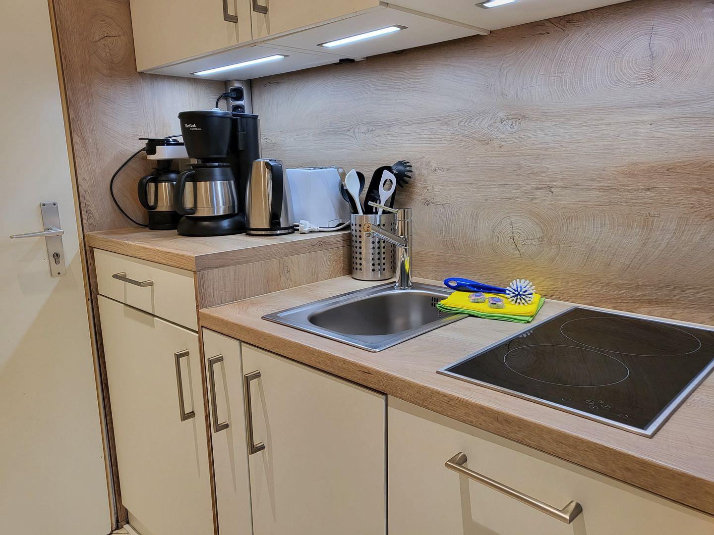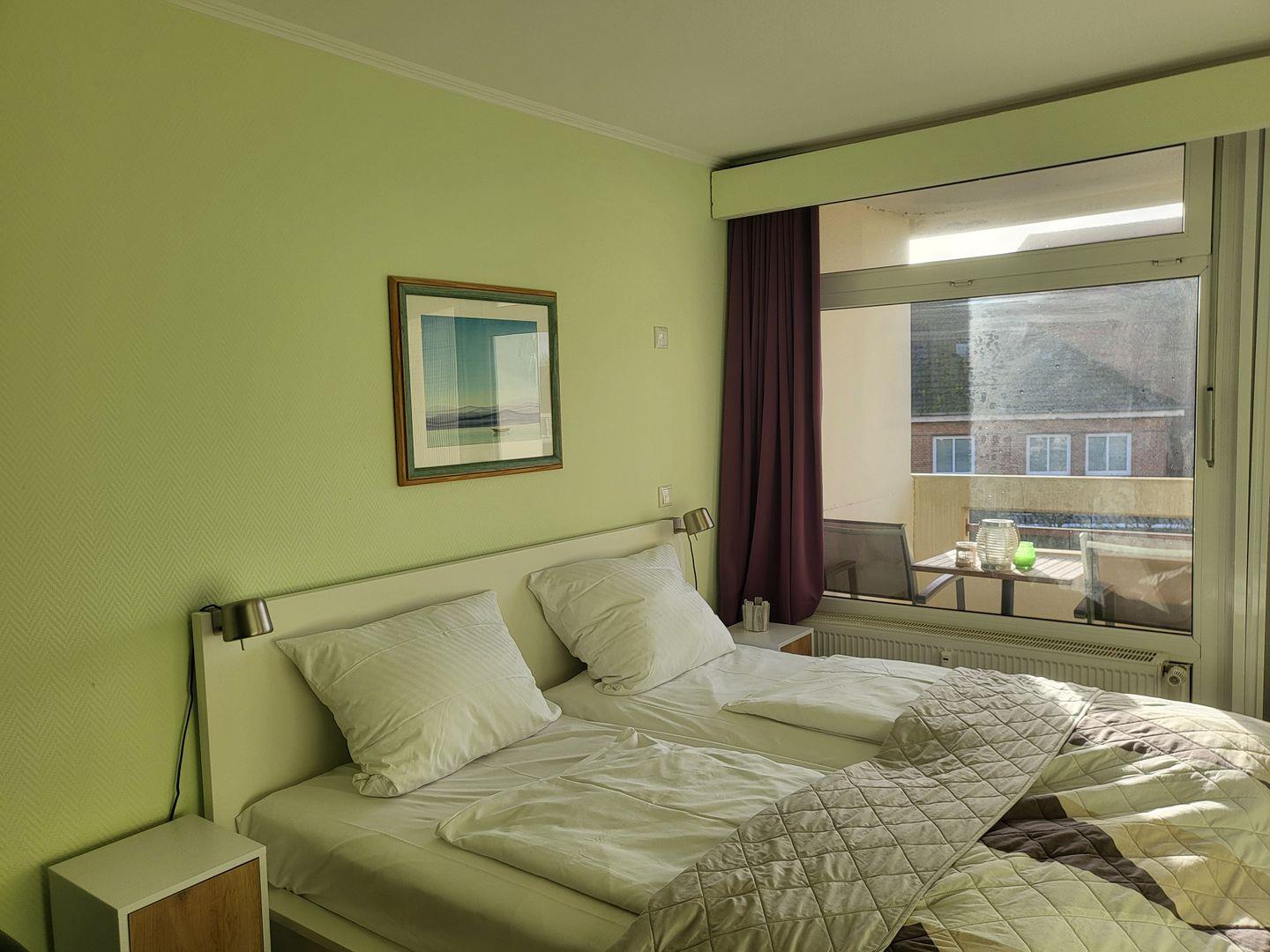 Zentrale 1 Zimmer-Wohnung mit Balkon zur Seeseite. Ausgestattret mit Doppelbett, Kochnische, Duschbad mit WC, TV und Musikanlage.