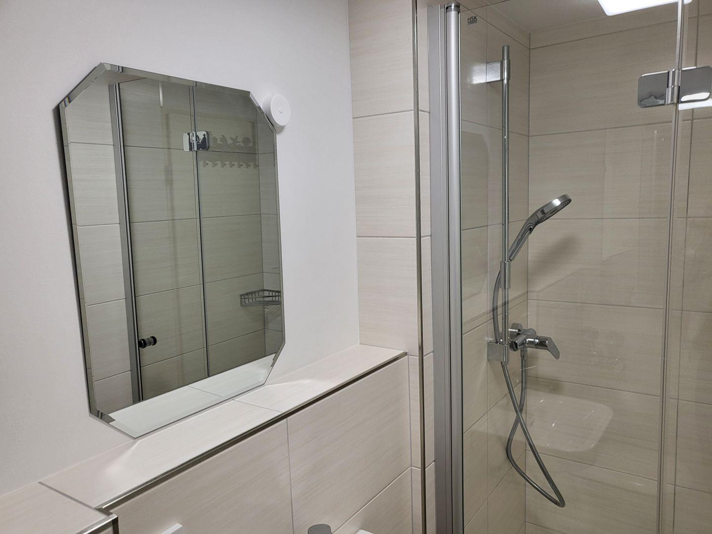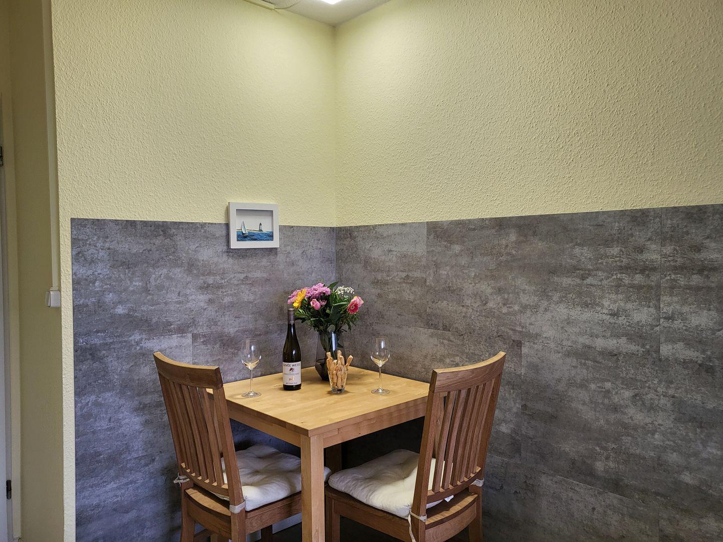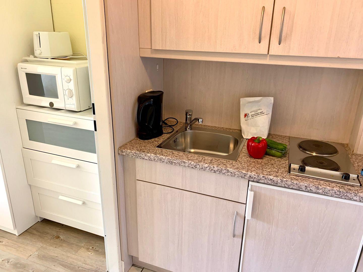 Der praktische, kombinierte Wohn-Schlafraum ist ausgestattet mit einem 160x200cm Palettenbett mit zwei Einzelmatratzen, einer kompakten Essecke und einem gemütlichen Sessel sowie Flachbild-TV. Auch kostenfreies W-LAN ist hier vorhanden. Durch den angrenzenden, möblierten Balkon mit Blick Richtung See und die Fensterfront wirkt der Raum wunderbar hell. Die Pantry-Küche verfügt über ein 2er Kochfeld, Mikrowelle, Kühlschrank mit Gefrierfach und Kaffeemaschine. Diese Wohnung kann den Fahrstuhl nutzen.